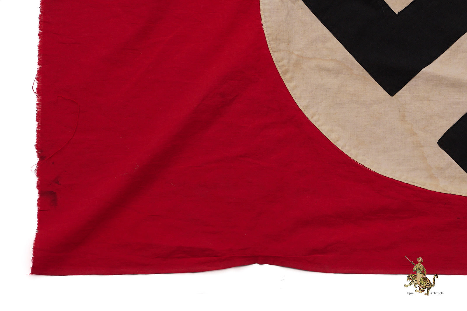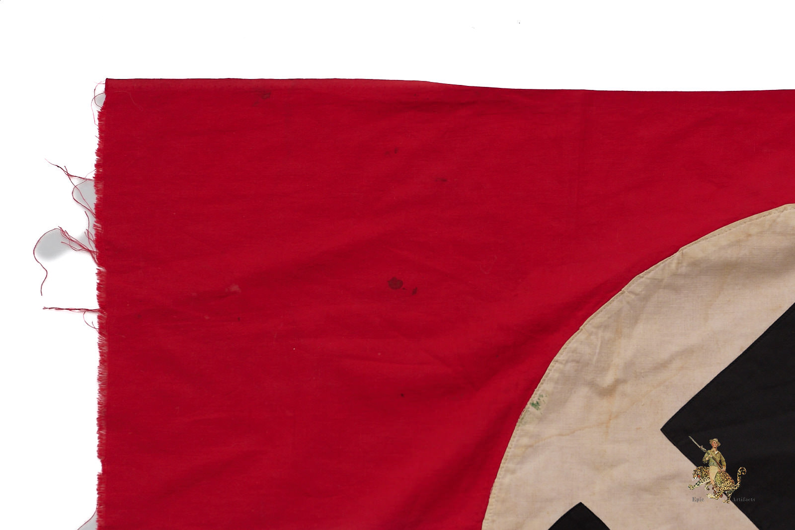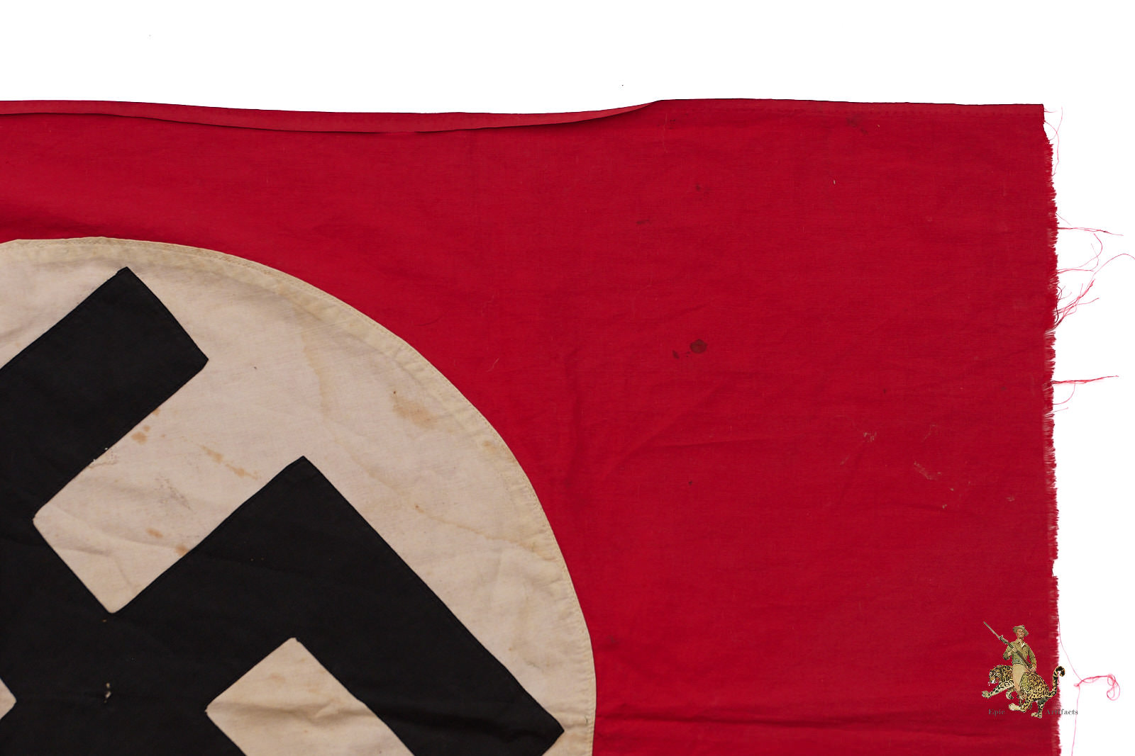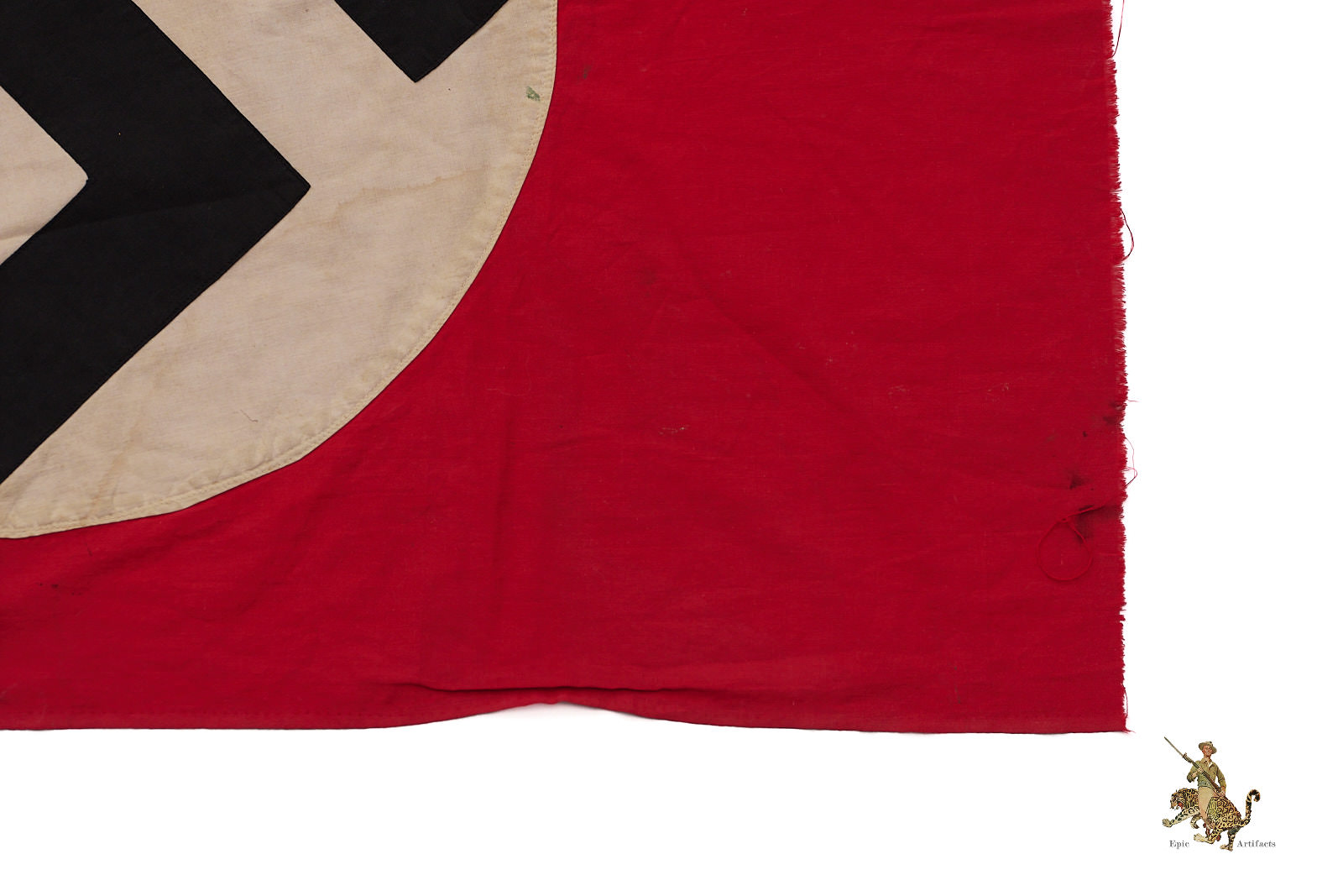 This NSDAP Flag 30″ x 50″ Cut-Off w/ Hooks retains its rope heading, with two metal hooks sewn into the original suspension loop to facilitate mounting. Constructed as a dual-sided banner, it features a single-piece black swastika machine-sewn onto a 22-inch white roundel, demonstrating typical period manufacturing techniques. The textile exhibits minor discoloration, small holes, and areas of fraying along the cut edge, consistent with age and historical use.