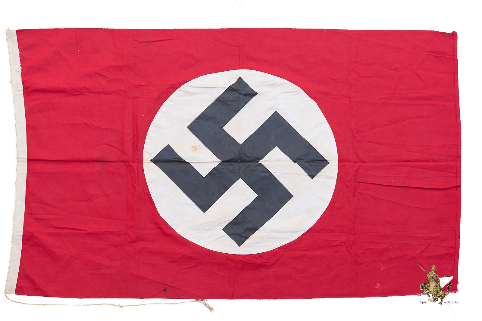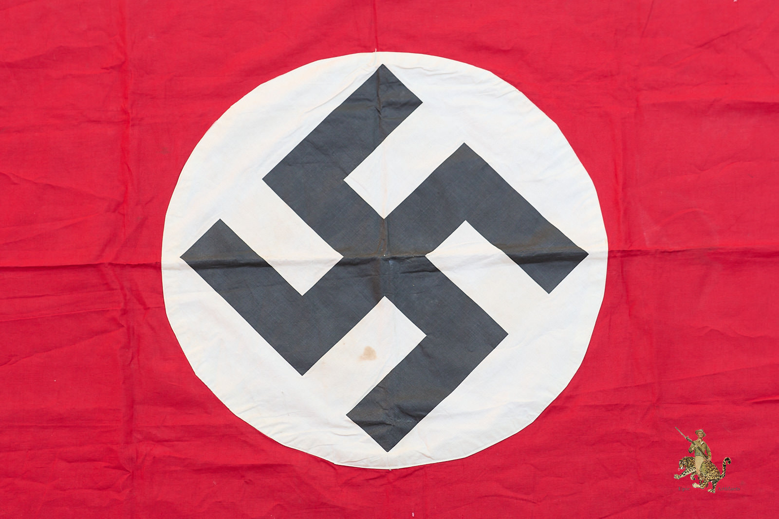 Historical Description: The red flag with white central disk and black swastika was introduced by Hitler in the 1920s as the flag of the National Socialist political party. In 1933, shortly after the Nazis took power, this party flag was recognized alongside the black-white-red Imperial tricolor as one of Germany’s national flags. In 1935, the use of the tricolor flag was discontinued, and between September 1935 and May 8, 1945, the Nazi party flag was the sole national flag of Germany. From its creation in the 1920s through the end of the war, this swastika flag was made and used in endless variations, from the massive banners hung at Party Day rallies to small pennants, bunting flags, and hand-held paper flags distributed along parade routes. These flags, banners and pennants flew from ships, were hung from official and private buildings, and were displayed outside business and private homes. At the end of WWII, the Allied military governments abolished the use of all Nazi symbols, including the national flag. Most Third Reich era German national flags were simply destroyed.