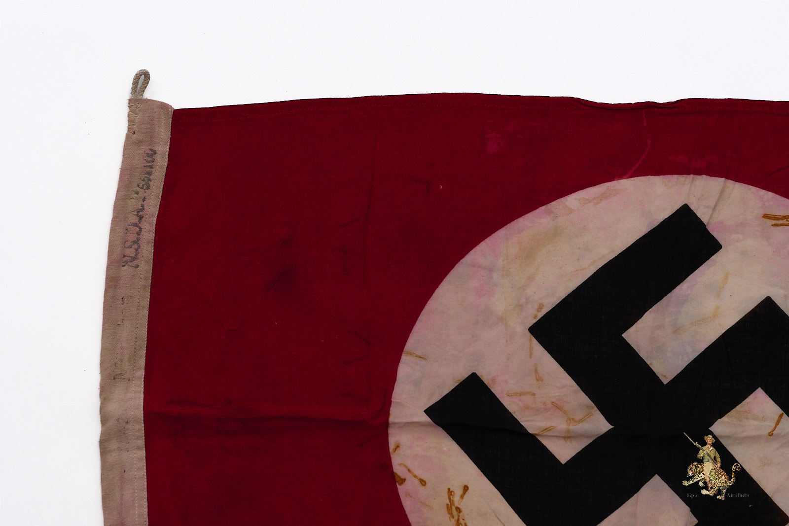 This flag maintains its integrity and offers strong historical value, but has shrunk with age. The NSDAP Flag is marked as 56cm x 10cm and contains other stamps that have faded with time. Overall this flag rates as very good.