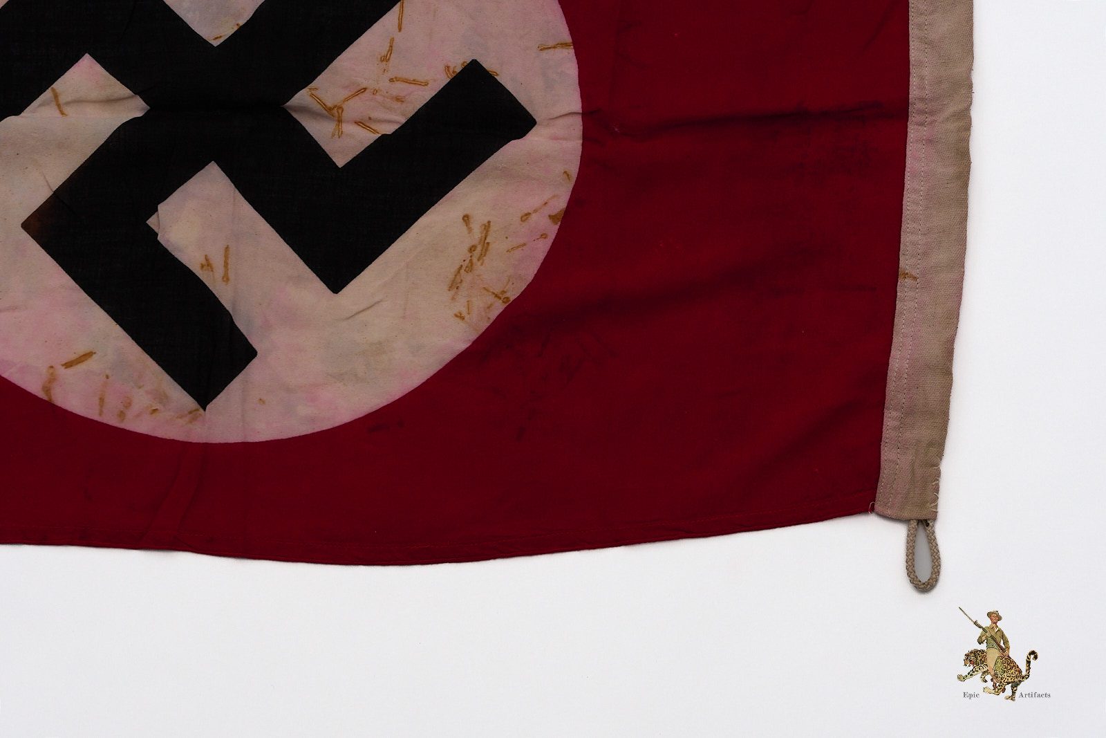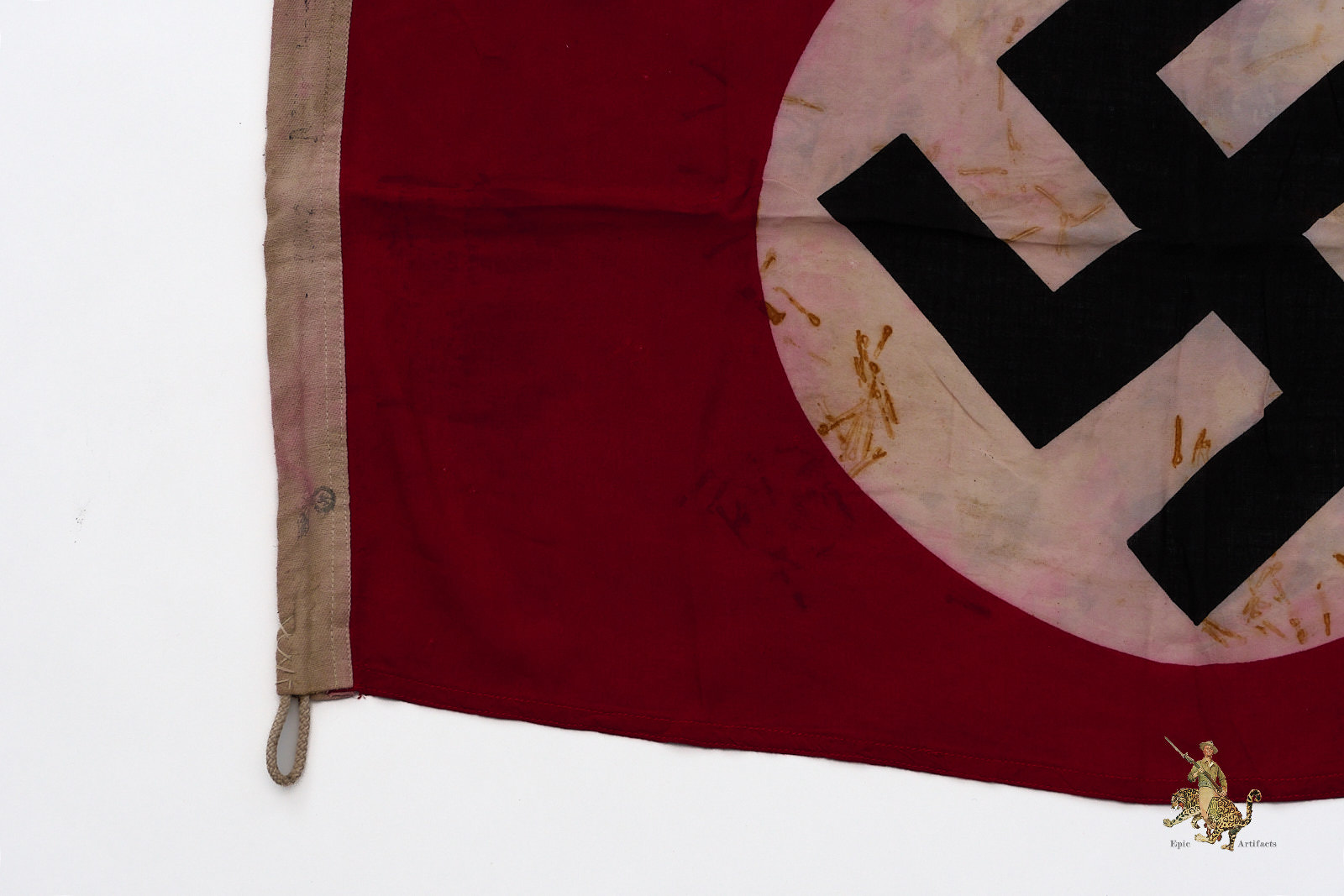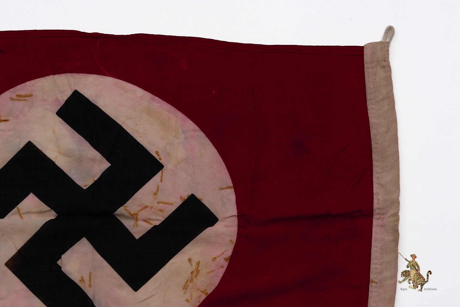 This example features Machine sewn border with enforced white fabric on hoist end with original ropes attached. The fabric shows signs of wear with rust stains and bleed throughout. Inner roundel is dyed with black swastika.