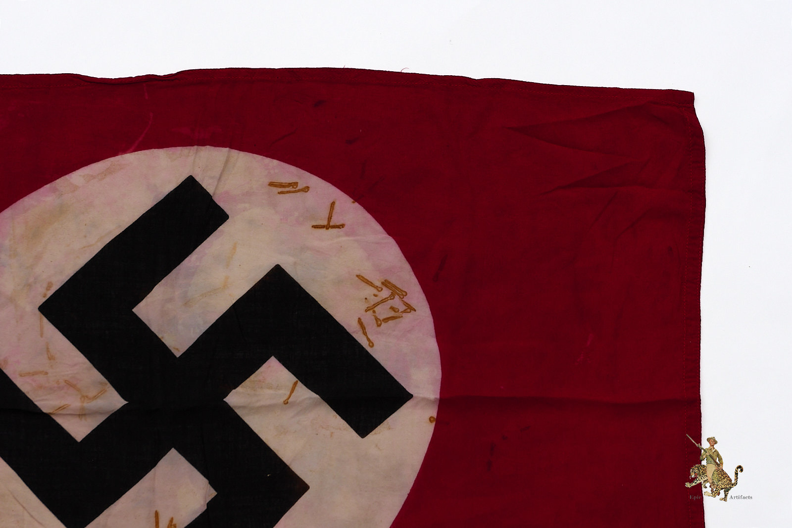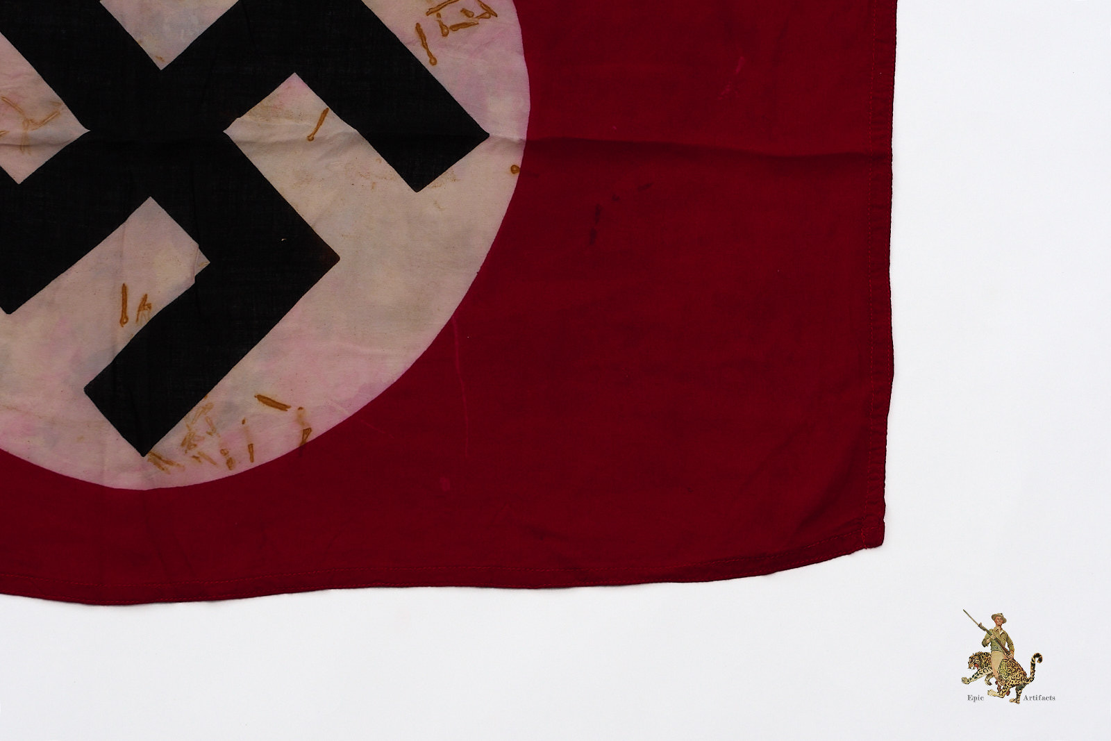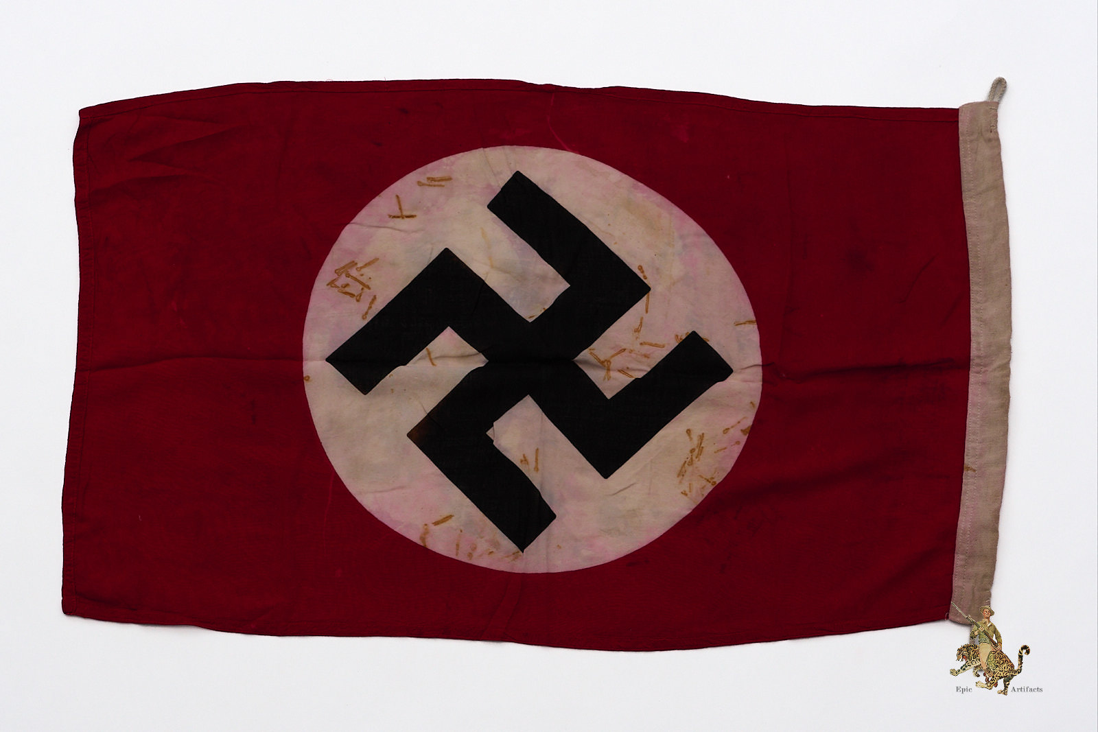 Historical Description: The red flag with white central disk and black swastika was introduced by Hitler in the 1920s as the flag of the National Socialist political party. In 1933, shortly after the Nazis took power, this party flag was recognized alongside the black-white-red Imperial tricolor as one of Germany’s national flags. In 1935, the use of the tricolor flag was discontinued, and between September 1935 and May 8, 1945, the Nazi party flag was the sole national flag of Germany. From its creation in the 1920s through the end of the war, this swastika flag was made and used in endless variations, from the massive banners hung at Party Day rallies to small pennants, bunting flags, and hand-held paper flags distributed along parade routes. These flags, banners and pennants flew from ships, were hung from official and private buildings, and were displayed outside business and private homes. At the end of WWII, the Allied military governments abolished the use of all Nazi symbols, including the national flag. Most Third Reich era German national flags were simply destroyed.