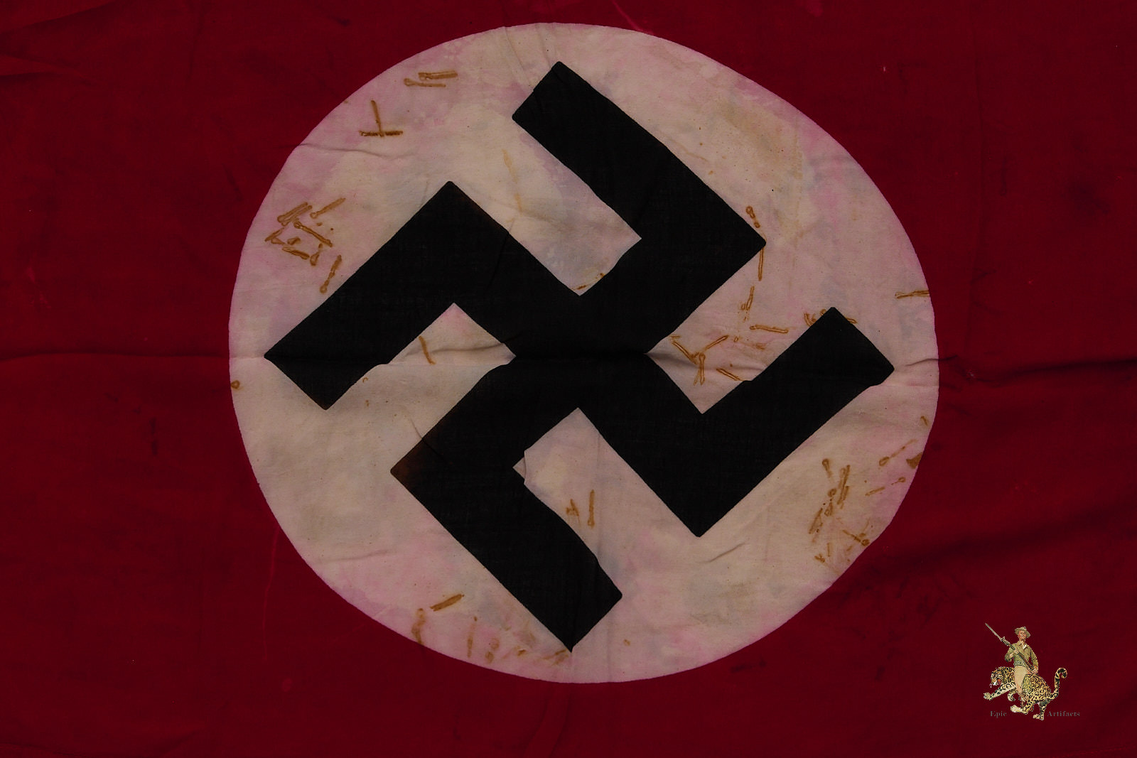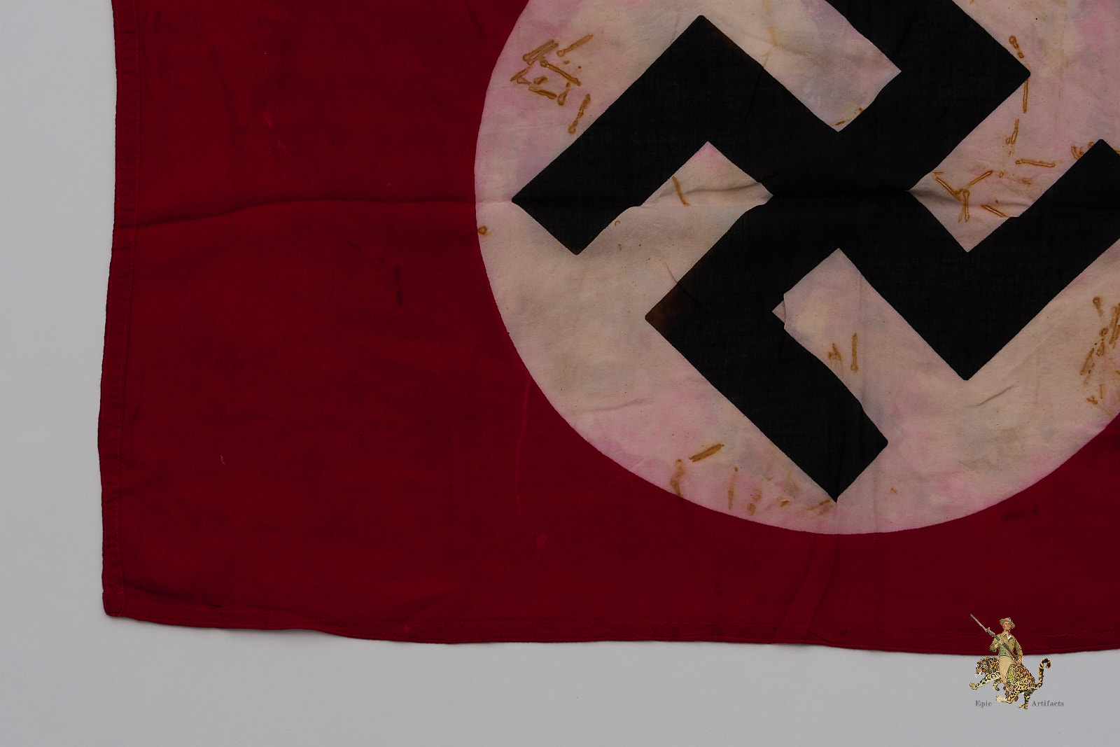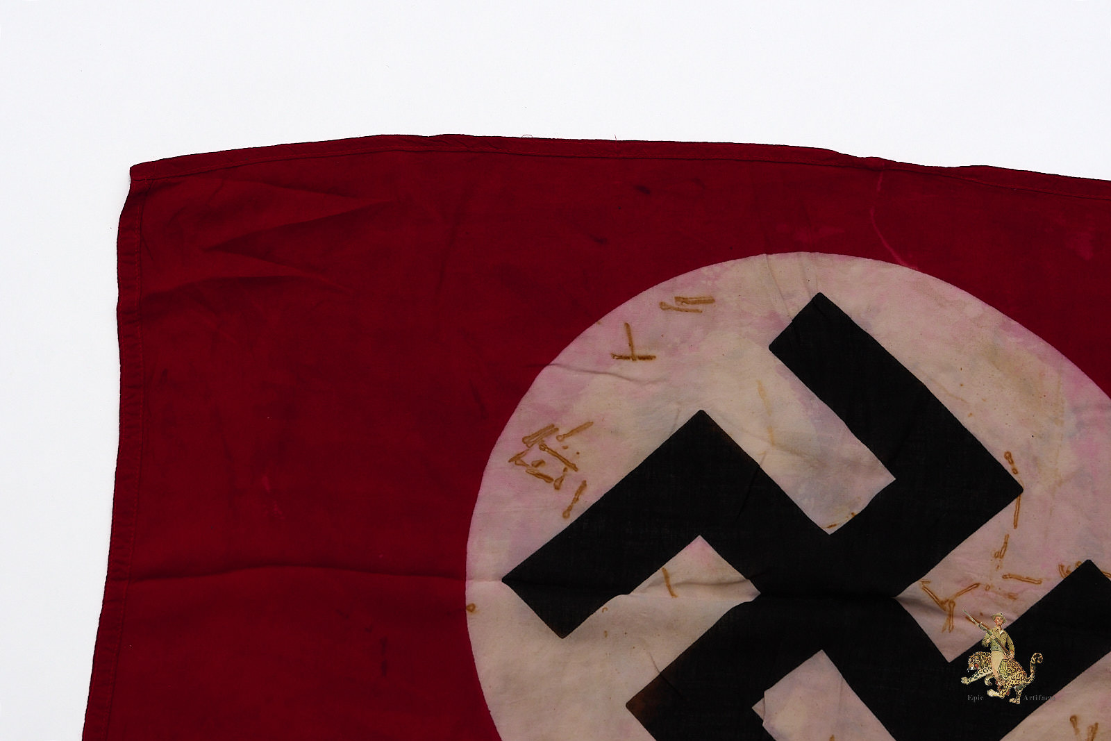 Historical Description: The red flag with white central disk and black swastika was introduced by Hitler in the 1920s as the flag of the National Socialist political party. In 1933, shortly after the Nazis took power, this party flag was recognized alongside the black-white-red Imperial tricolor as one of Germany’s national flags. In 1935, the use of the tricolor flag was discontinued, and between September 1935 and May 8, 1945, the Nazi party flag was the sole national flag of Germany. From its creation in the 1920s through the end of the war, this swastika flag was made and used in endless variations, from the massive banners hung at Party Day rallies to small pennants, bunting flags, and hand-held paper flags distributed along parade routes. These flags, banners and pennants flew from ships, were hung from official and private buildings, and were displayed outside business and private homes. At the end of WWII, the Allied military governments abolished the use of all Nazi symbols, including the national flag. Most Third Reich era German national flags were simply destroyed.