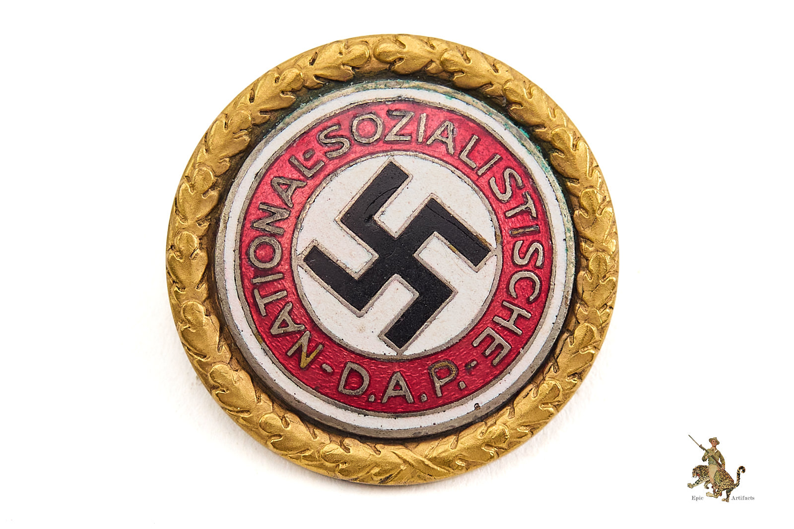 Product Description: An impressive NSDAP Gold Party Membership Badge by Deschler & Sohn, presented in the highly desirable large 30 mm format. The obverse remains in notably fine condition, retaining the majority of its original gilt finish. The enamel is clean, glossy, and vibrant, exhibiting only the lightest surface wear consistent with age and showing no chips, cracks, or repairs.