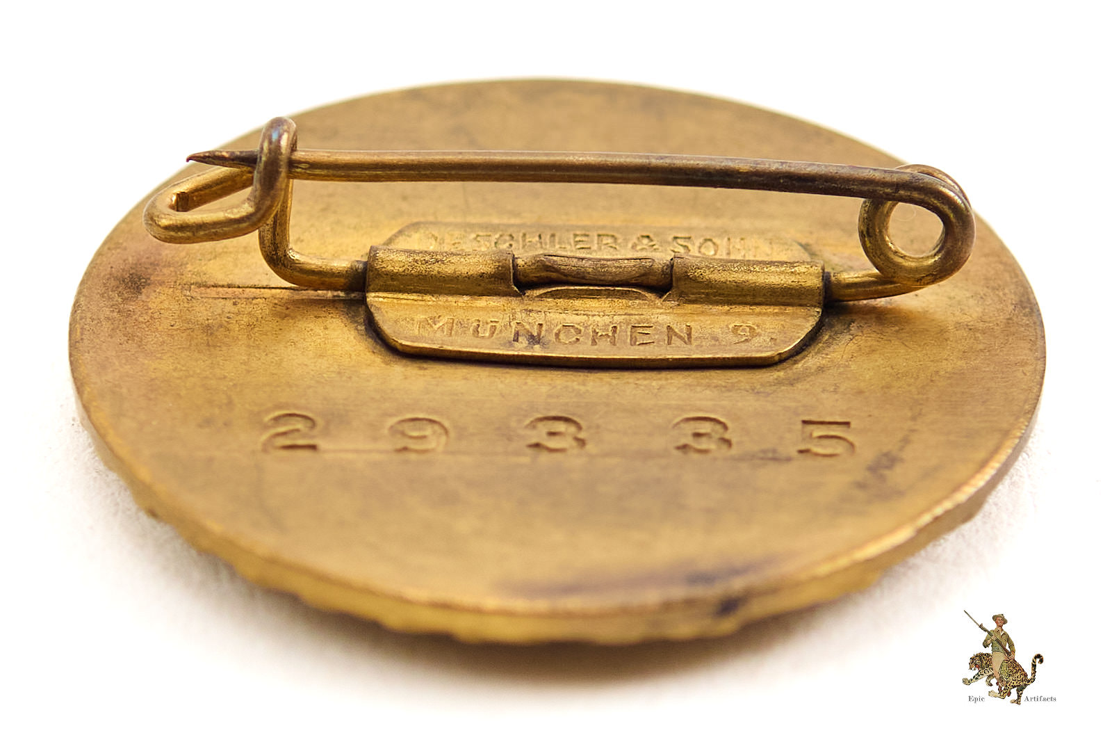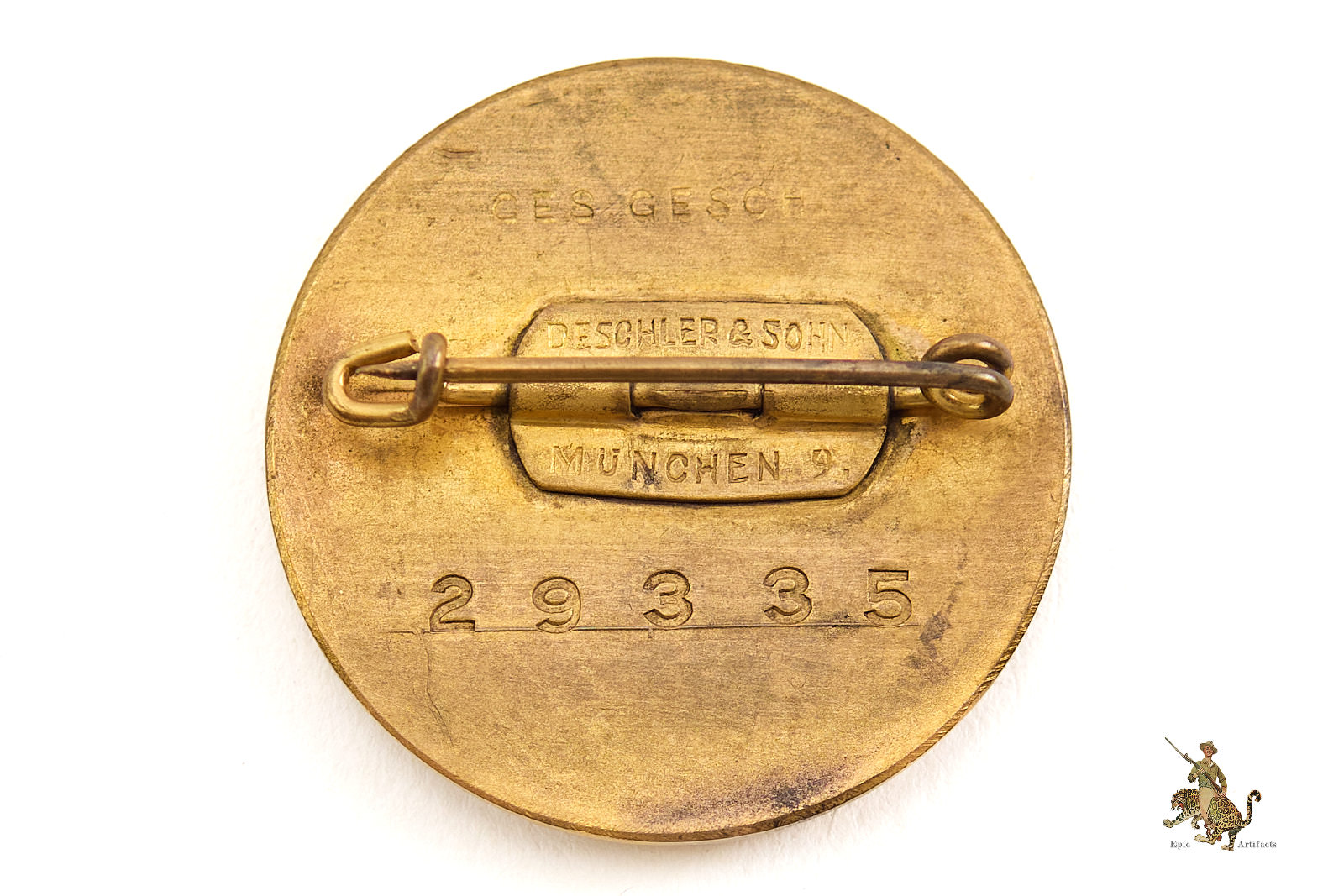 The reverse displays gentle, even wear to the gilding, allowing the warm tombak base metal to subtly show through in a manner entirely consistent with period manufacture and honest age. The badge is correctly marked “Ges. Gesch.” and bears the serial number 29335, which has been researched. The maker’s mark, “Deschler & Sohn München 9,” is neatly stamped on the retaining pin plate, confirming this as a classic and highly sought-after Deschler production.