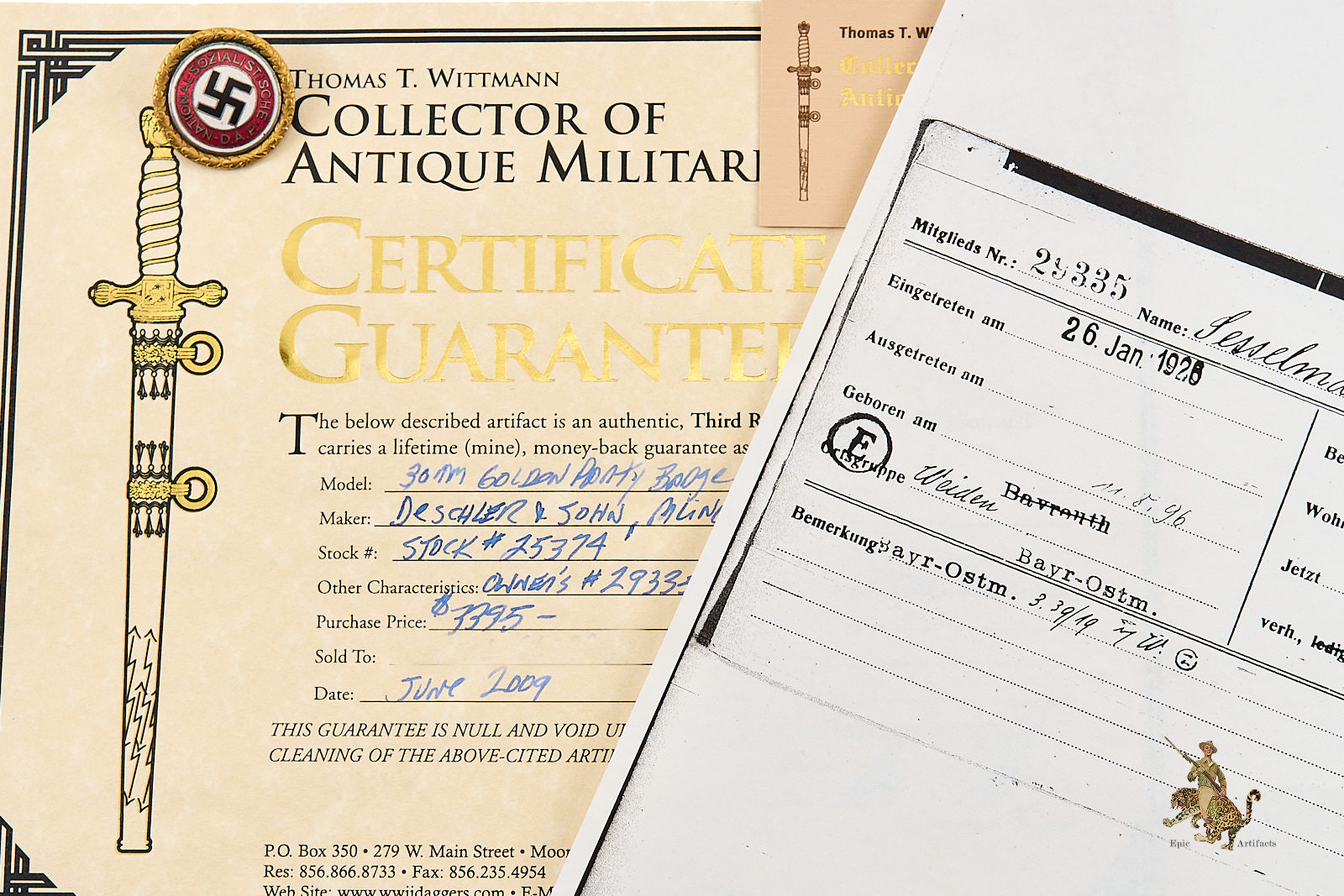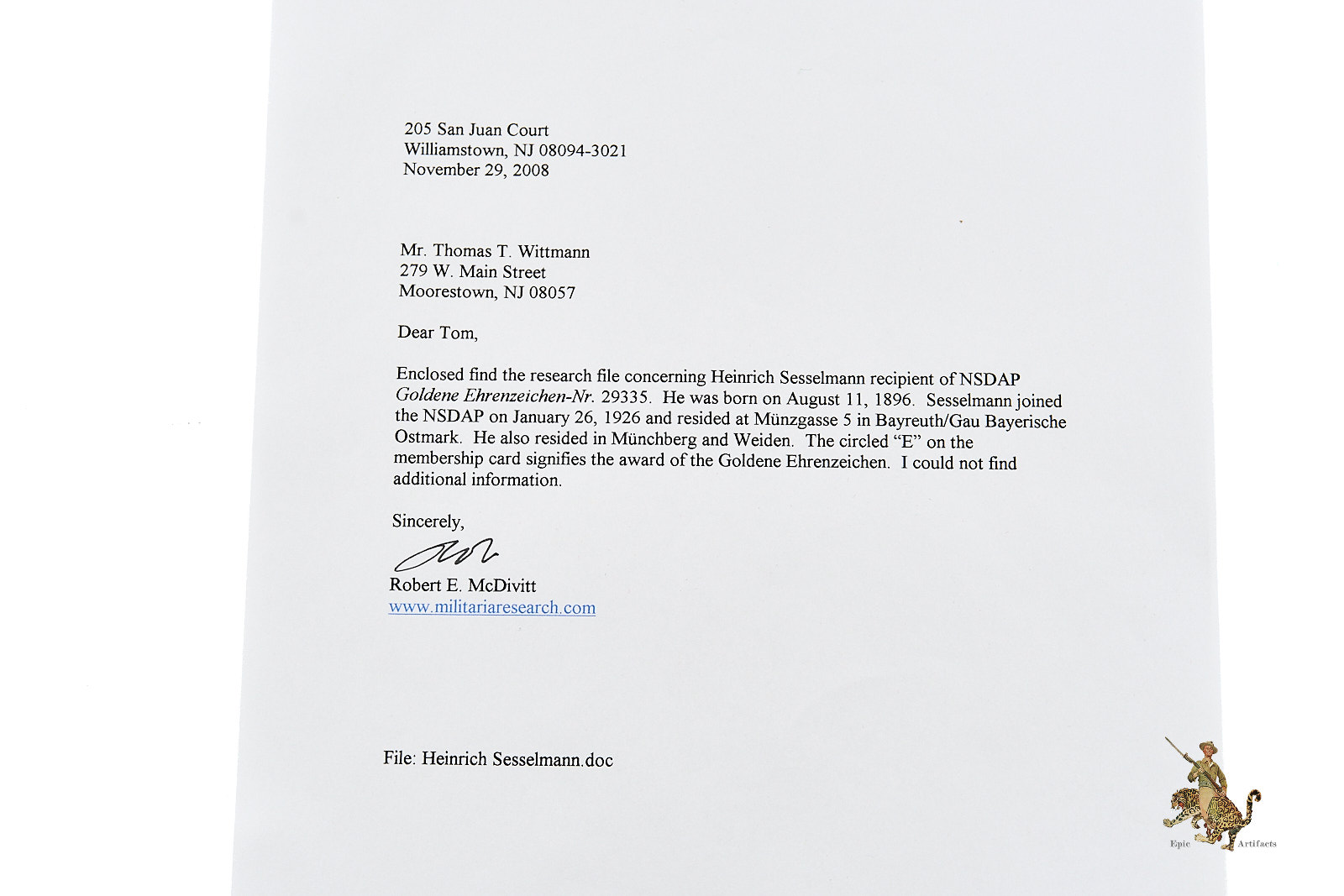 Accompanying the badge is a photocopy of a research document and letter attributing the piece to Heinrich Sesselmann, along with a Certificate of Guarantee issued by Thomas T. Wittmann in 2009, significantly enhancing both provenance and collectability.