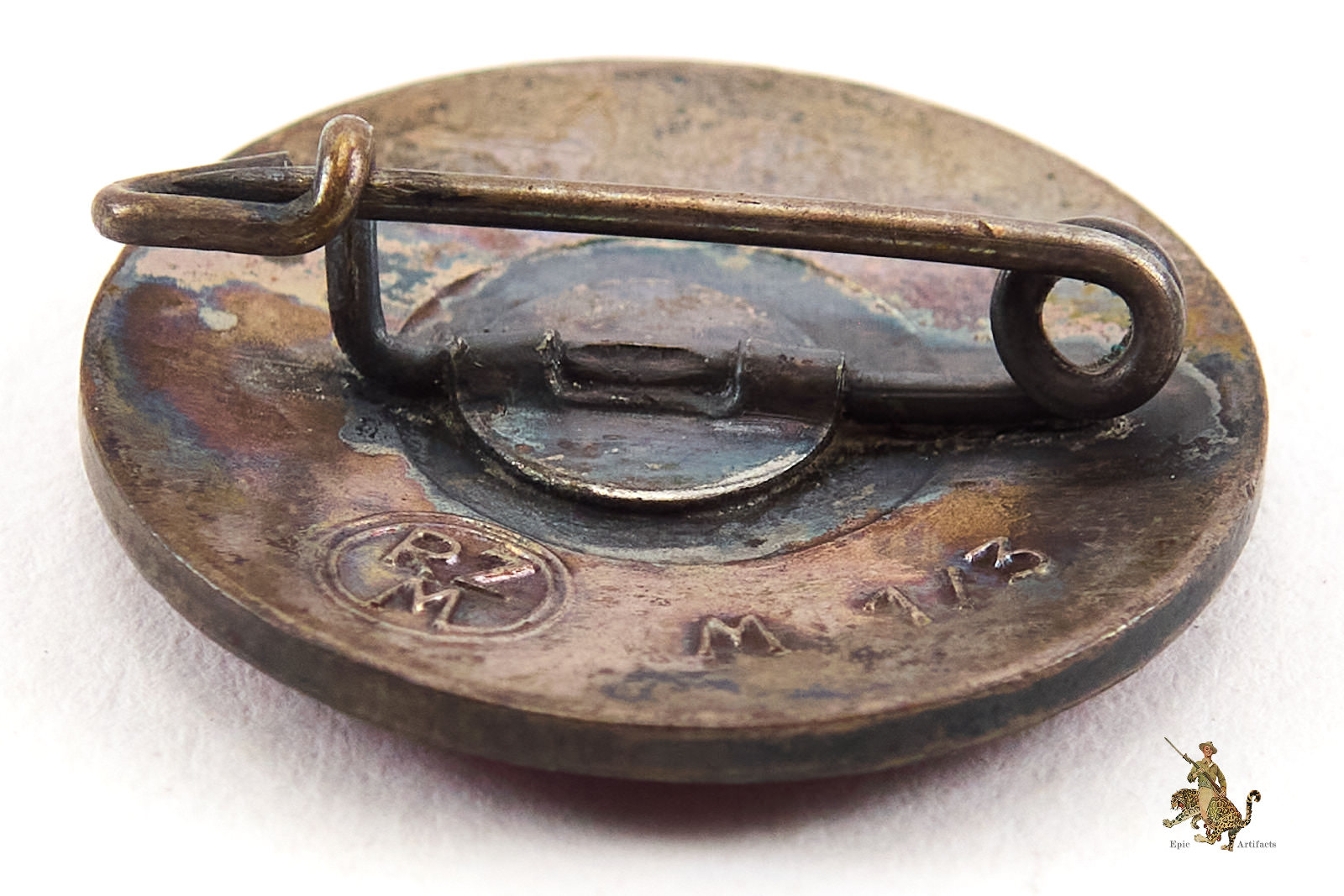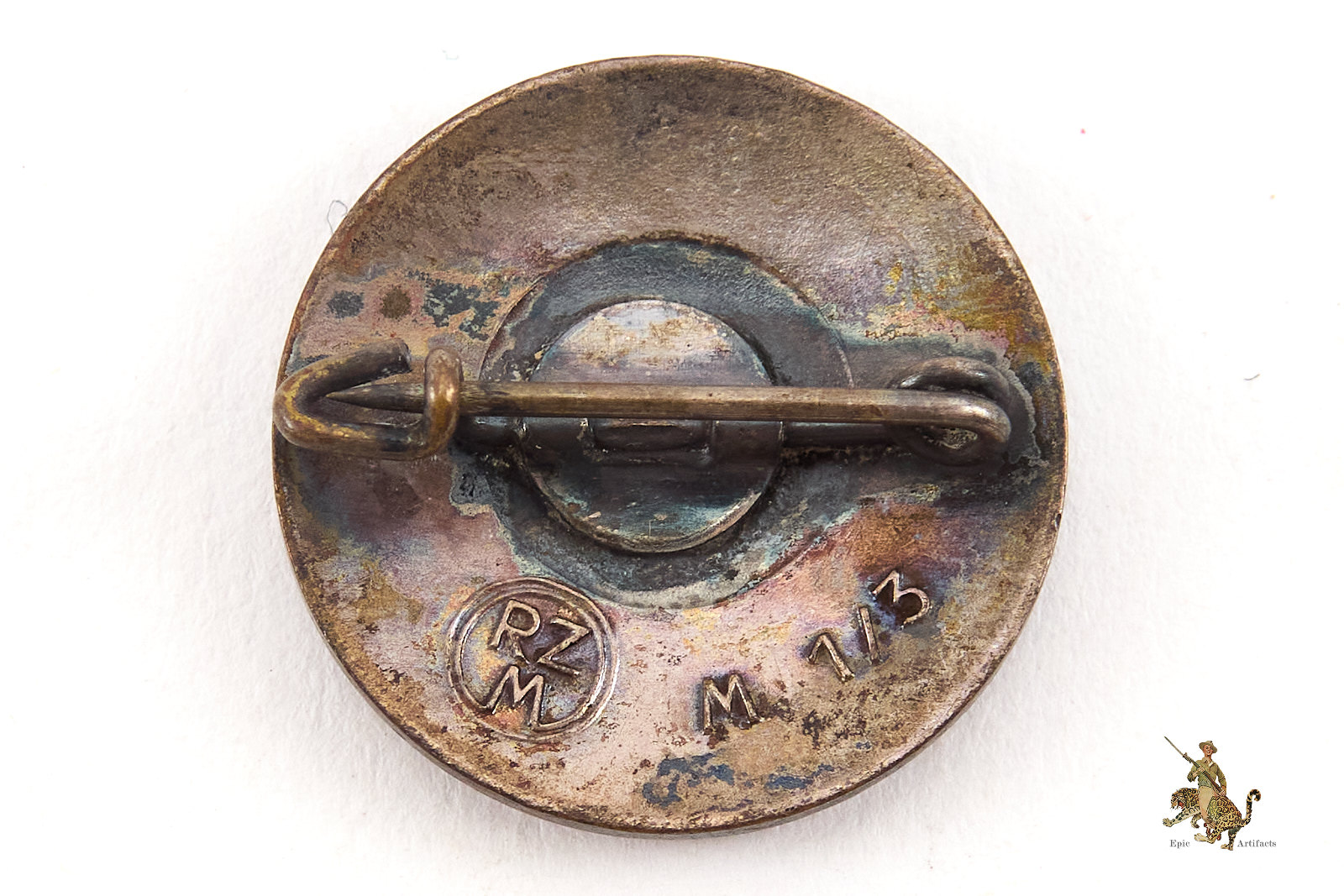 Product Description:This is a lovely example of a desirable enamel NSDAP Membership Party Pin (Parteiabzeichen). This example is made of a brass alloy (Tombak). The obverse has light wear but still shows remnants of the original silver finish. The exquisite quality of the enamel which is completely intact, with some light surface wear but no chips or damage. The lovely translucent red enamel reveals a pebbled field, and the pin retains full original color. The reverse of this enamel NSDAP Membership Party Pin retains much of the original silvering, and is marked with the round RZM emblem of the Reichszeugmeisterei, as well as the maker code “M1/3” indicating it was made by the manufacturer Max Kremhelmer of München. The attachment pin is complete and functional and is held in place with a soldered plate. The solder is original and there is no damage and no repairs to note. This membership badge is all original and has a great look. The NSDAP Membership Party Pin condition rates as excellent.