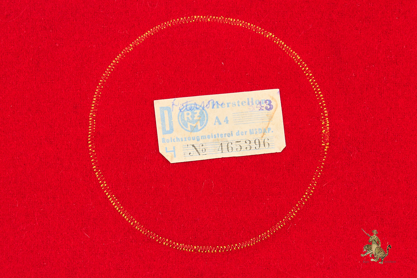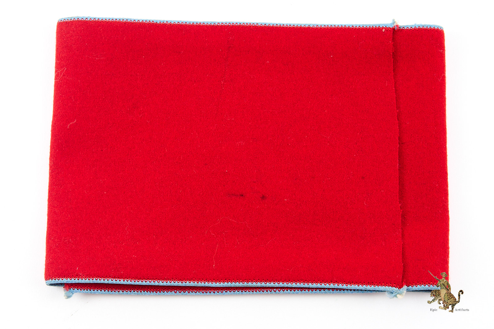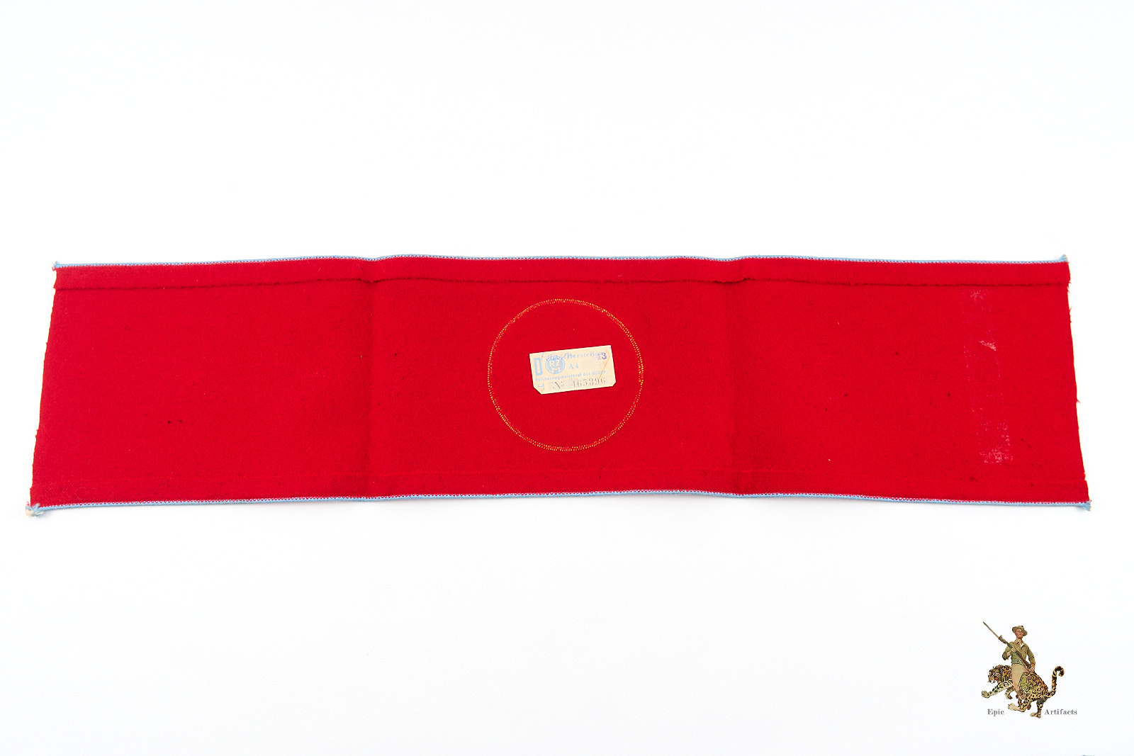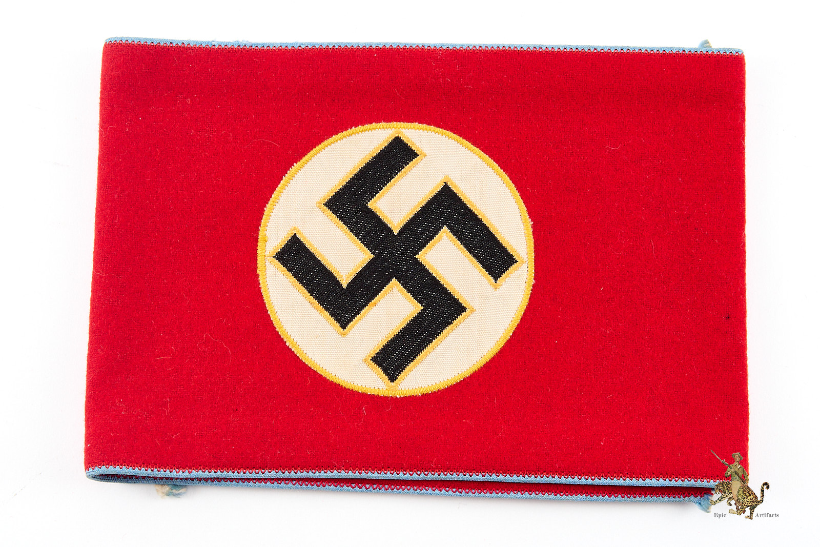 Product Description: This NSDAP Ortsgruppenleiter Armband is a fine piece of political leader regalia. The body of this armband is made from a top quality, heavy weight red wool fabric. The wool retains strong original color, and has a nice smooth nap that shows virtually no wear. The top and bottom edges of the armband have light blue piping, indicating Orts level. The center of the armband has a roundel composed of a nice cotton white roundel and finely embroidered black swastika, neatly machine sewn with a gold embroidered border. The white fibers of the roundel show typical light age toning. The short edges of the armband are not sewn together in the back, which is standard for these political leader armbands. There is an RZM tag as shown. There are a couple of dark spots on the reverse of this armband from pins that oxidized. This is a great representative example of an Ortsgruppenleiter Armband, that remains in excellent condition.