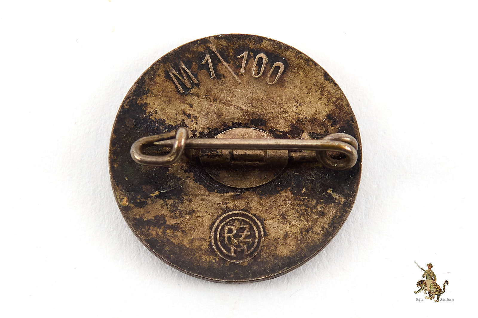 Product Description: A well-preserved example of the Nationalsozialistische Deutsche Arbeiterpartei (NSDAP) Party Membership Pin, featuring the standard enamel design with black swastika on a white field, encircled by red enamel with the party name. Constructed in tombac with high-quality enamel work, this pin is clearly marked to the reverse with the RZM code M1/100, identifying the maker as Werner Redo.