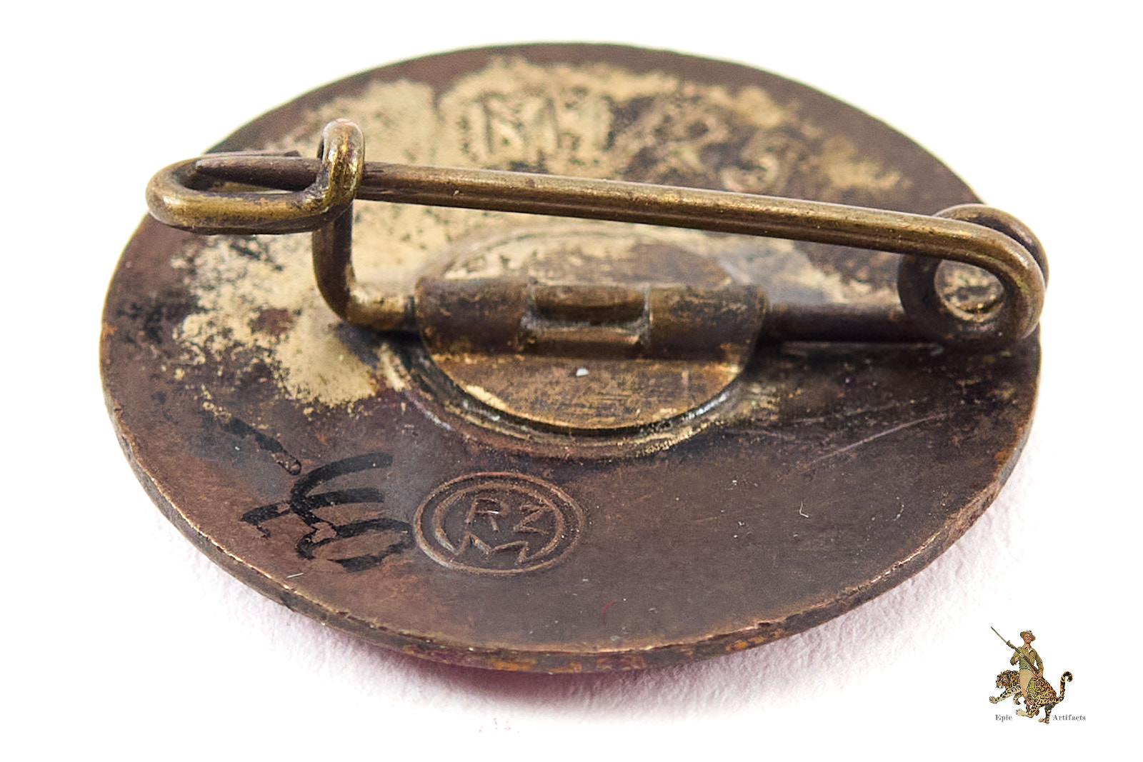 Product Description: NSDAP Party Membership Pin – RZM M1/25, a textbook original example dating to the 1930s and produced in tombak or a similar brass alloy. The pin retains its original form and proportions, with the silvered finish to the exposed metalwork on both obverse and reverse largely worn away, revealing the base metal beneath with an even and characteristic age patina. The obverse enamel is exceptionally well preserved, showing no chips or cracks and only minimal signs of handling. The translucent red enamel clearly reveals the pebbled ground surrounding the lettering, a hallmark of quality period manufacture.