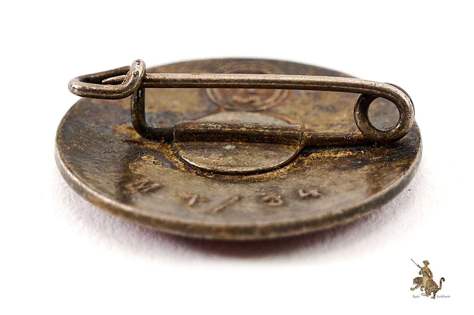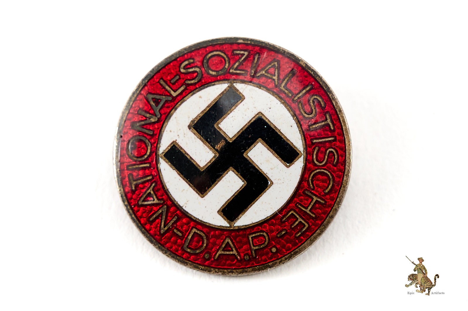 A well-preserved example of the Nationalsozialistische Deutsche Arbeiterpartei (NSDAP) Party Membership Pin, featuring the standard enamel design with black swastika on a white field, encircled by red enamel with the party name. Constructed in tombac with high-quality enamel work, this pin is clearly marked to the reverse with the RZM code M1/34, identifying the maker as Karl Wurster, Markneukirchen.