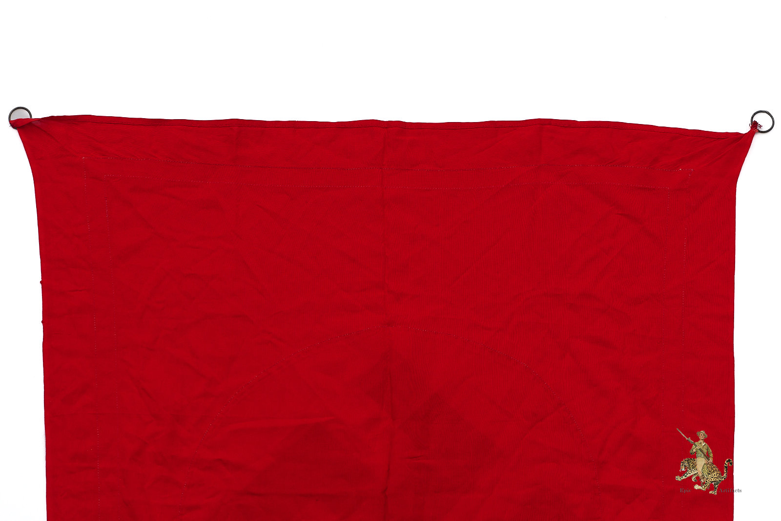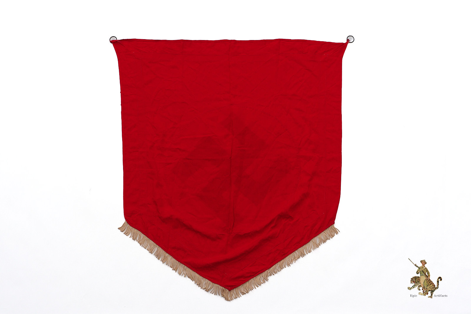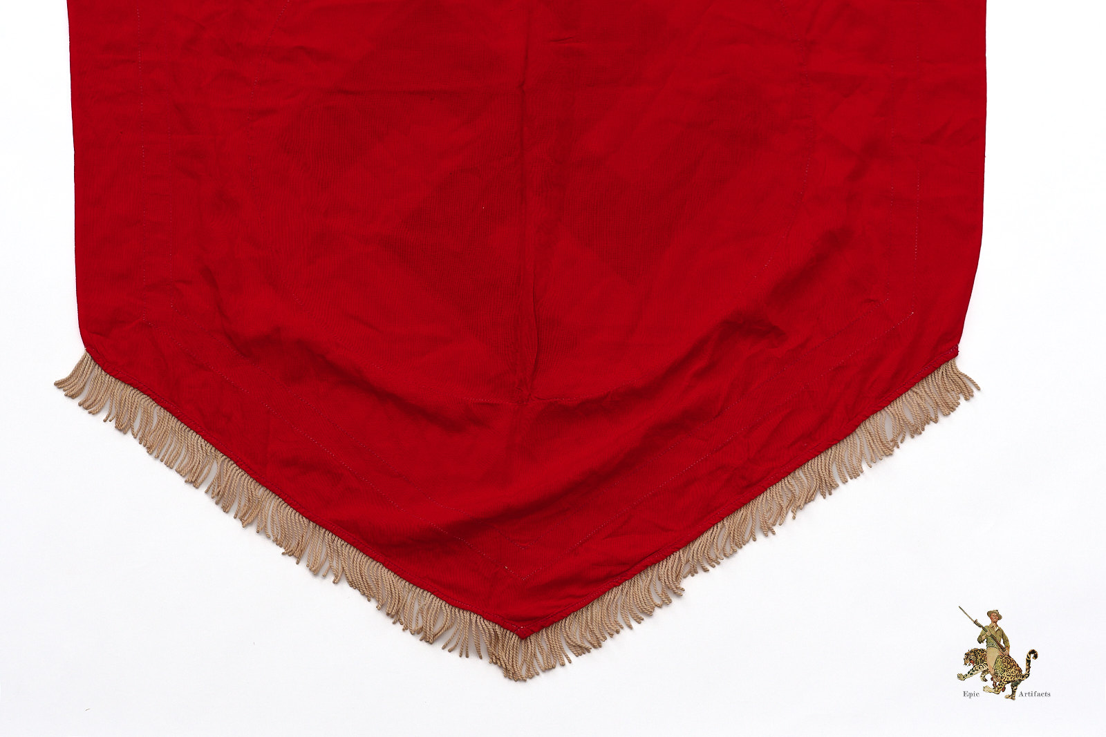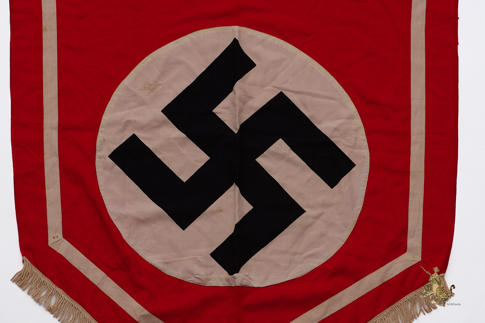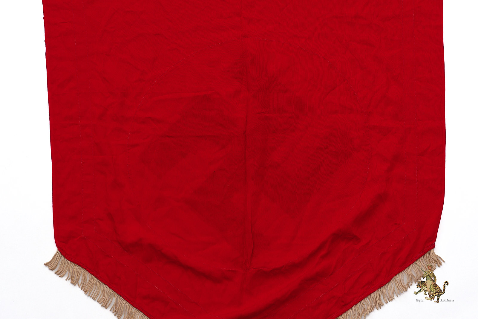Product Description: A well-preserved and visually striking NSDAP Podium Banner 29″ x 34″, executed in a vivid red fabric that has retained strong color with only minimal age-related fading. This single-sided banner, of a highly displayable 29-by-34-inch format, features a centrally applied white roundel bearing a printed black emblem, factory-stitched in place. The perimeter is finished with straight machine-sewn white fabric borders, lending an orderly, formal presentation typical of podium or lectern use during the period.