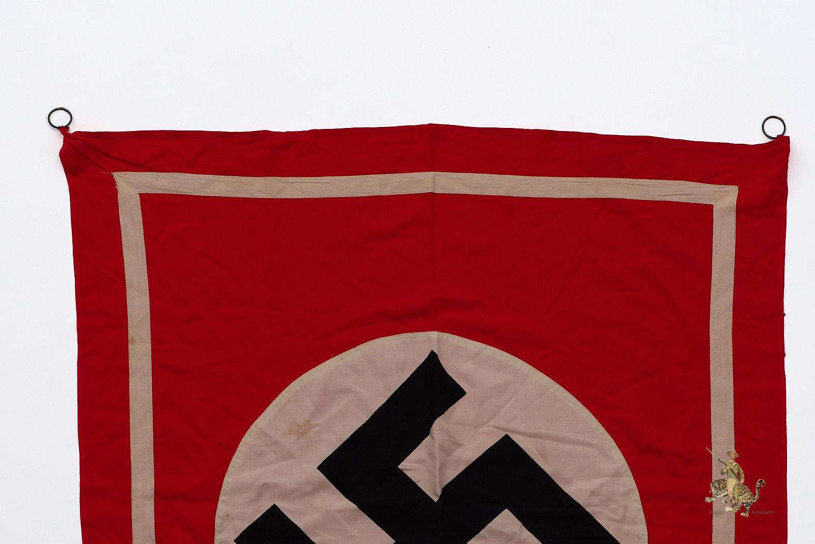 Historical Description: The red flag with white central disk and black swastika was introduced by Hitler in the 1920s as the flag of the National Socialist political party. In 1933, shortly after the Nazis took power, this party flag was recognized alongside the black-white-red Imperial tricolor as one of Germany’s national flags. In 1935, the use of the tricolor flag was discontinued, and between September 1935 and May 8, 1945, the Nazi party flag was the sole national flag of Germany. From its creation in the 1920s through the end of the war, this swastika flag was made and used in endless variations, from the massive banners hung at Party Day rallies to small pennants, bunting flags, and hand-held paper flags distributed along parade routes. These flags, banners and pennants flew from ships, were hung from official and private buildings, and were displayed outside business and private homes. At the end of WWII, the Allied military governments abolished the use of all Nazi symbols, including the national flag. Most Third Reich era German national flags were simply destroyed.