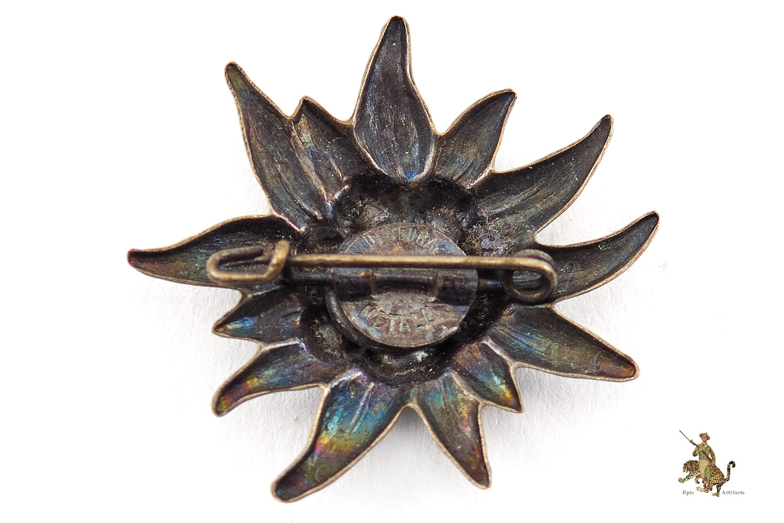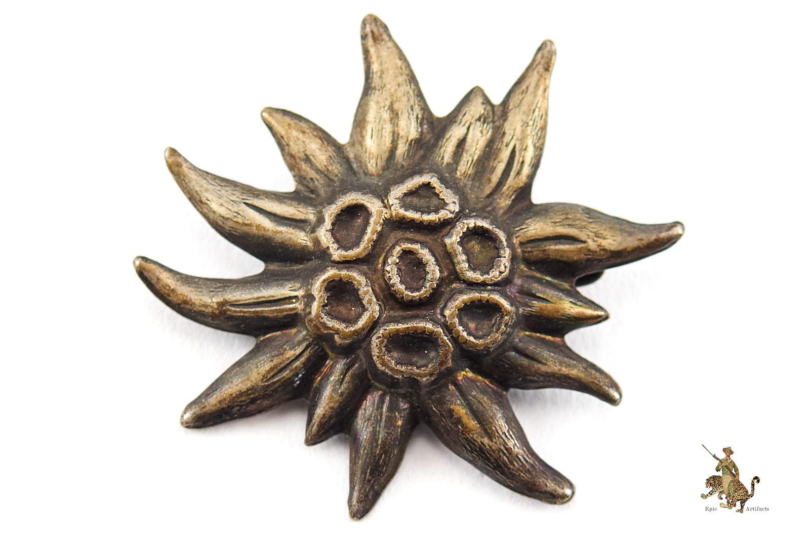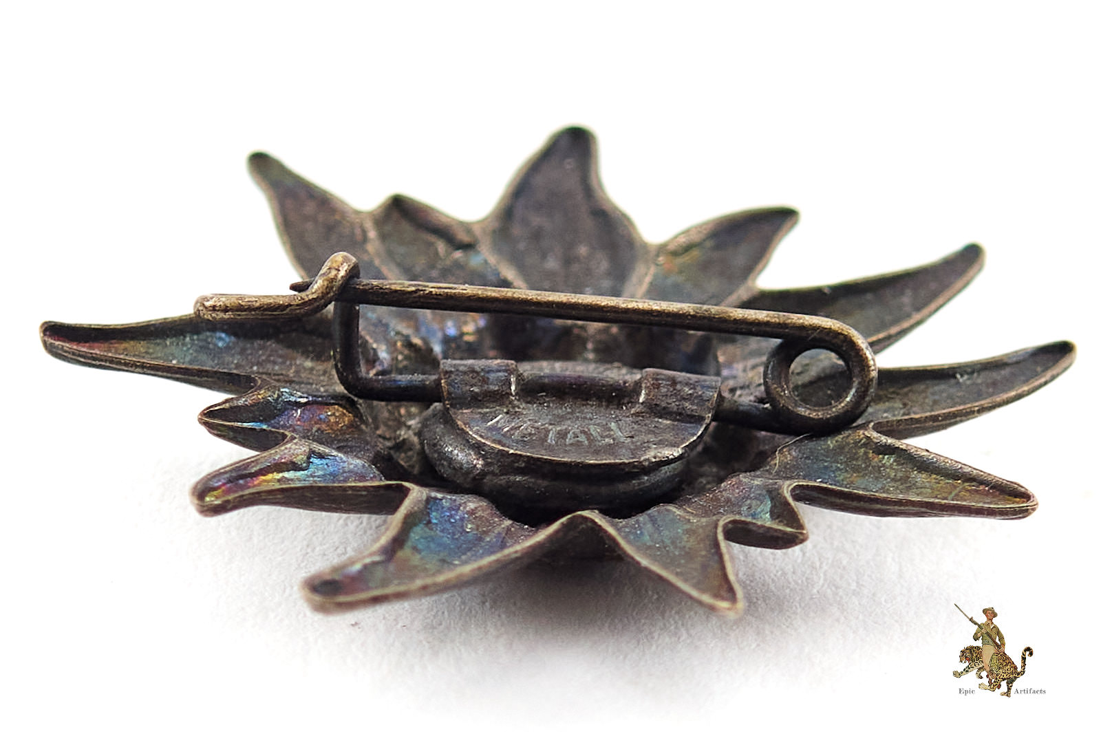 Product Description: An exceptionally fine NSDAP Political Cap Edelweiss Badge, expertly struck in lightweight metal and displaying exceptional craftsmanship throughout. The obverse shows stamped construction, defined by Edelweiss flower centered. The surfaces remain original with a subtle patina giving this badge a nice look.