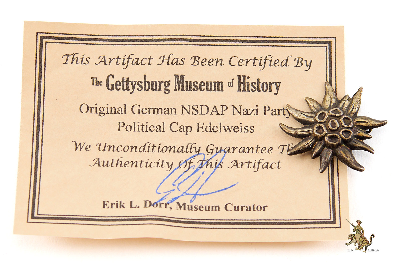 This NSDAP Political Cap Edelweiss Badge rates as excellent + condition. Entirely original and uncleaned, the badge is preserved is accompanied by a certificate of authenticity from The Gettysburg Museum of History. A highly desirable and historically significant specimen from the formative period of the NSDAP.