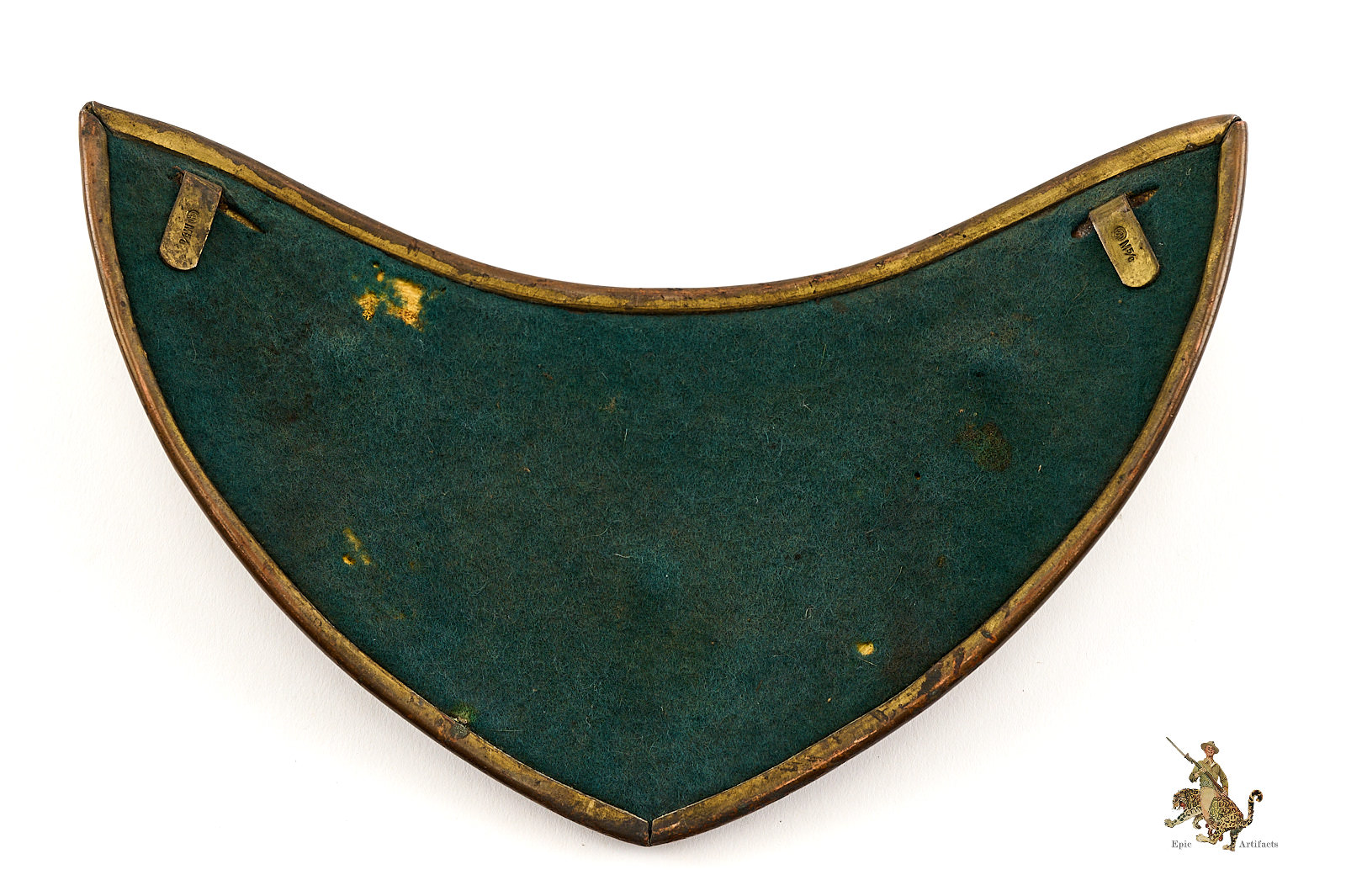 Historical Description: Gorgets were originally part of a knight’s armor during medieval times. Long after suits of armor were abandoned, the gorget continued to be used in many European armies as a form of military insignia. In the Imperial German Army until 1914, gorgets were worn as a special mark of distinction by certain elite units. Following WWI, German paramilitary and police organizations used gorgets for standard bearers, as insignia, and to denote personnel assigned special tasks. Following the Nazi rise to power, there was a vast increase in the number of uniformed organizations, and a variety of new gorgets were instituted for use by these civil, political and paramilitary organizations, as well as by the military. Standard bearers of most organizations, who were entrusted with carrying flags at rallies and in parades, wore gorgets. Other gorgets indicated assignment to guard or security forces. The military police personnel of the Wehrmacht and Waffen-SS had their own gorgets as a part of their uniforms and were nicknamed “chained dogs” by the troops, due to the chain used to suspend the gorget around the wearer’s neck. Because gorgets were never general issue to all personnel of any organization or military branch, they were manufactured in limited numbers, and are generally scarce to encounter today.