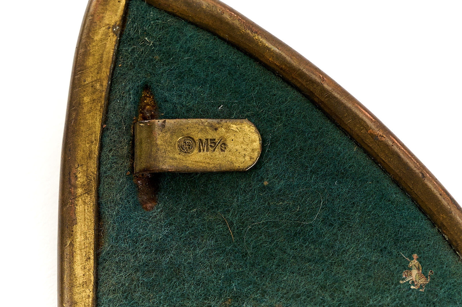 Product Description: This NSDAP Political Gorget M5/8 – Assmann is an impressive piece of regalia for a Nazi Party political leader. The front of this gorget has a great look, with only extremely minor wear, and a slight, warm patina to the smooth bronze-colored surfaces. The large central German eagle and swastika emblem and the oak leaf border all retain full original detail. The crimped in, green wool felt backing is in original condition, showing a few spots of mothing. Both of the hooks on the reverse for the chain is stamped with the round RZM logo of the Reichszeugmeisterei, as well as the maker code M5/8, indicating manufacture by the firm of F.W. Assmann & Söhne, Ludenscheid. There is no chain accompanying this gorget. This NSDAP Political Gorget M5/8 – Assmann is a very attractive example, in excellent overall condition.