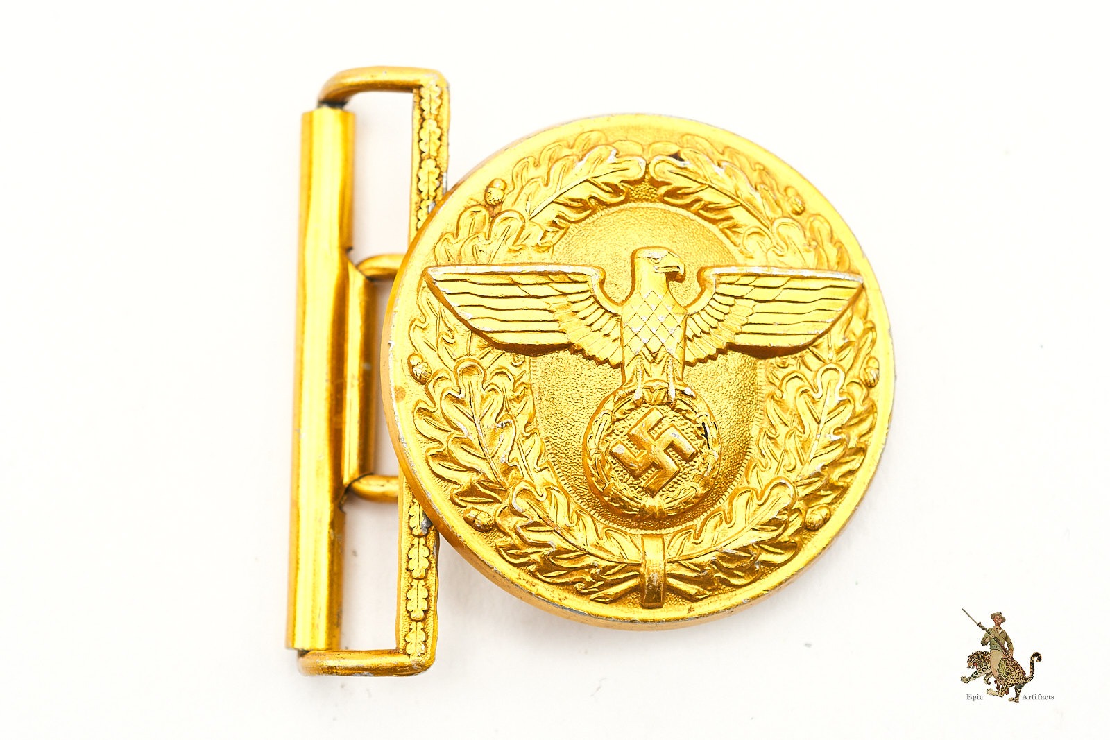 Historical Description: The belt buckle was an important part of the regalia worn by all uniformed military, civil, political, and paramilitary organizations during the Third Reich. The belt (“Koppel”) was part of the uniform and would always be worn while on duty. The belt buckle (“Koppelschloss”) was generally specific to each organization, with many organizations having separate belt buckles for officers and for enlisted personnel, sometimes with different colors and finishes to further denote specific purposes. The buckles were adorned with various mottos and designs specific to the organizations for which they were intended. Many designs used the German national eagle emblem, in a variety of forms. Belt buckles were worn with uniforms ranging from finely tailored officer parade uniforms, to the issue uniforms of enlisted soldiers in combat. Generally speaking, most German belt buckles of the Third Reich were made with two prongs on the reverse, to allow the buckle to be worn and adjusted on a belt. The buckle had a catch that would mate with a hook on the belt, when worn. The earliest Third Reich buckles were often made of brass, or nickel silver. Later, aluminum became very common, and was used on private purchase as well as enlisted buckles of the German military, with or without a painted or plated finish. After WWII began, most enlisted military buckles were steel. Nazi belt buckles were popular souvenirs for Allied troops who served in Europe. Some types were made by the millions and remain quite common today. Others were made in limited numbers and are very rare.