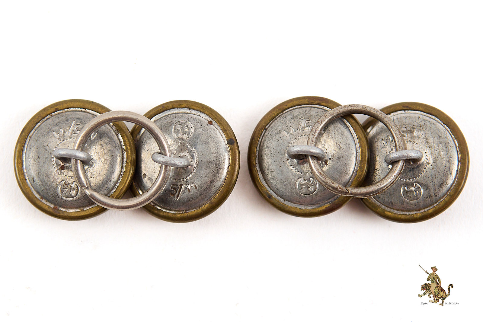 Product Description: A period set of NSDAP Political Leaders Matching Cufflinks, crafted from original political-leader–style buttons and displaying a consistent, well-aged patina across all components. Each button measures approximately 7/8 inch in diameter, with the reverses marked RZM M5/71, corresponding to an authorized manufacturer of political regalia during the era. The fittings remain intact and functional, and the metal surfaces show only light wear consistent with age.
