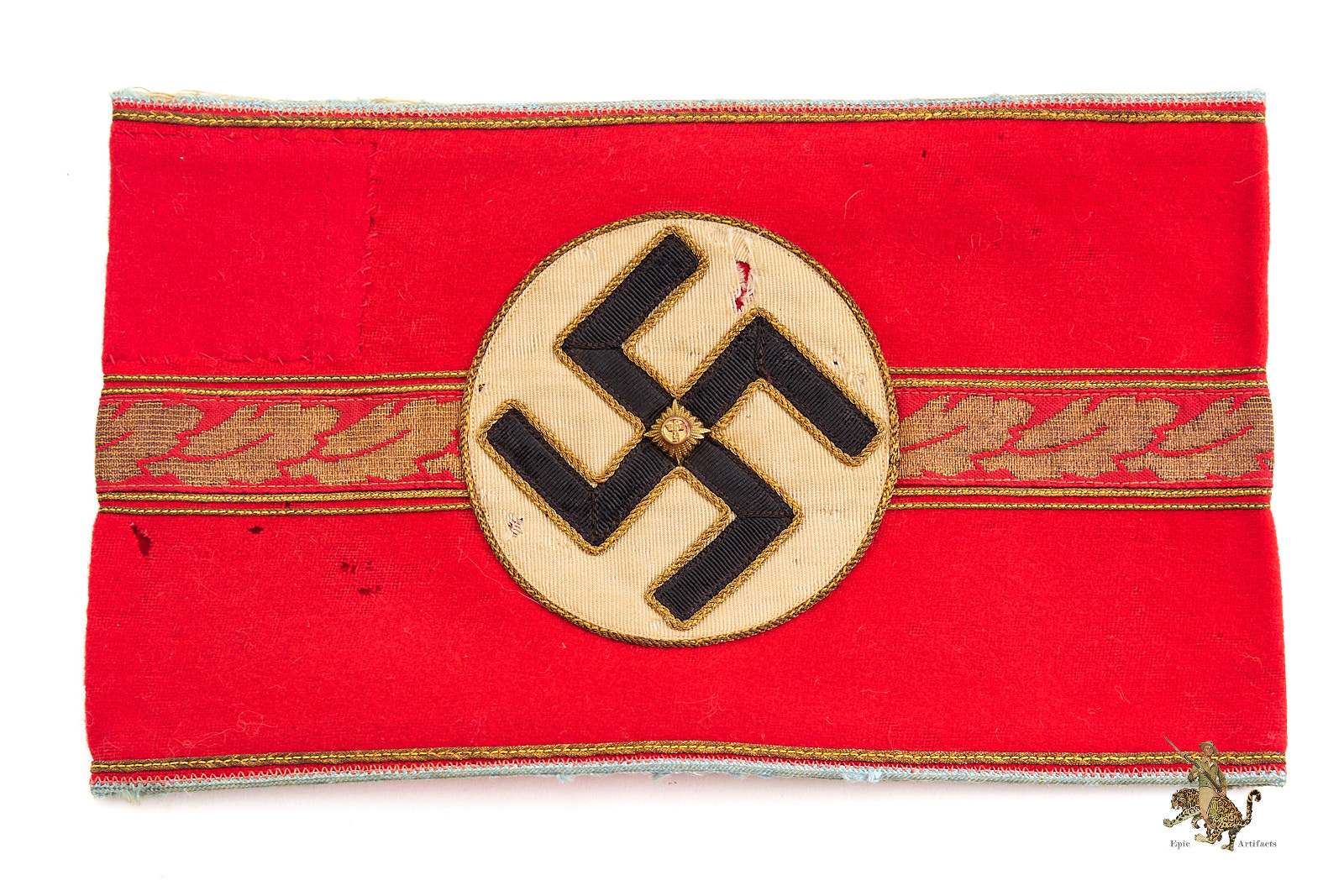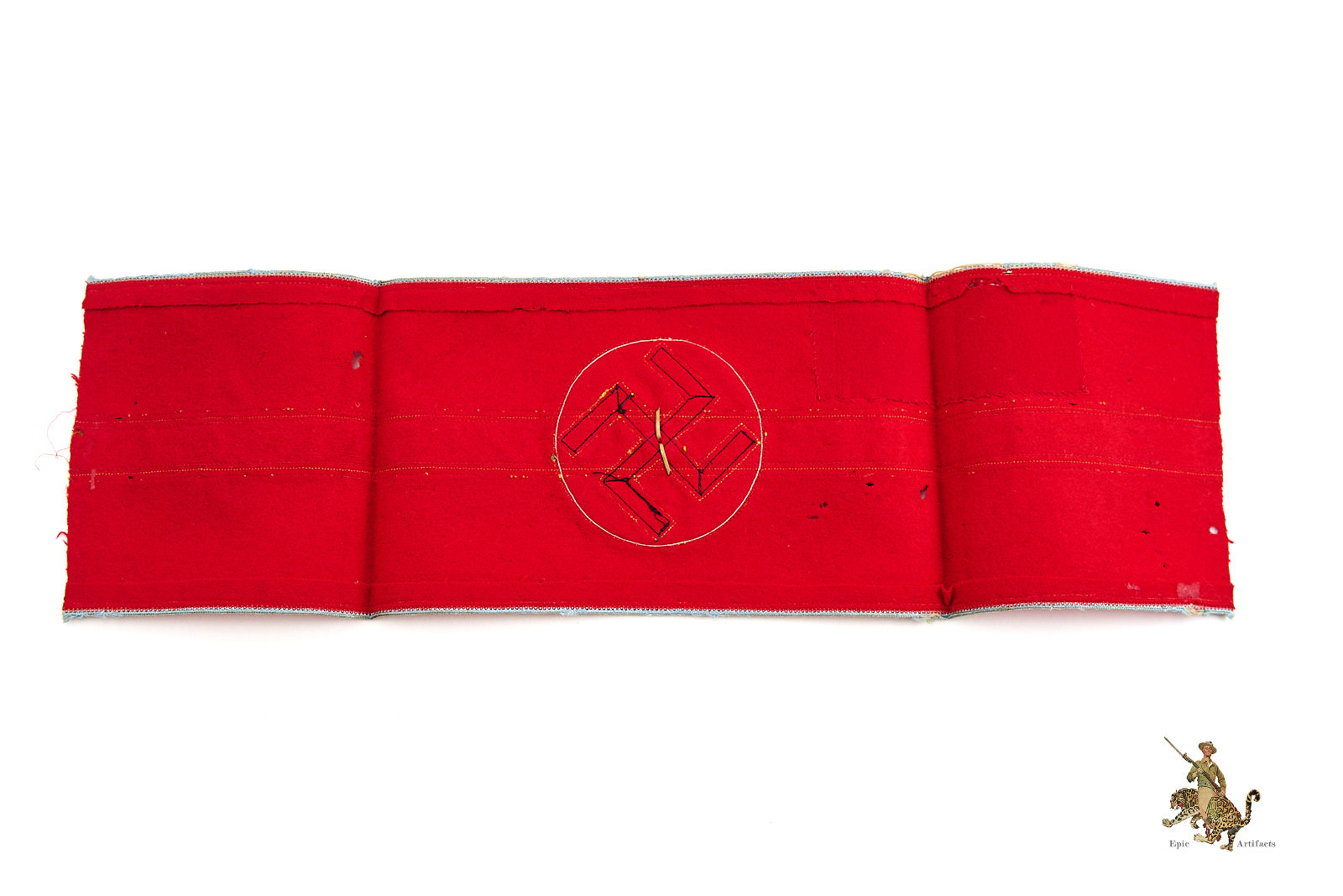 Historical Description: Nearly every military, civil, political, and paramilitary organization in existence during the Third Reich used armbands. Armbands were worn on military and civilian uniforms and also on civilian clothes, from suit jackets to work clothing. They were used to denote membership in organizations, to indicate a specific role or function of the bearer, and as insignia of rank. Many organizations would change the design of their armbands over time, which added to the variety produced. These were manufactured in countless variations, ranging from simple printed bands to elaborately hand-embroidered pieces of the highest quality. Some Nazi armbands were worn by all members of large organizations and were made by the millions. Others were intended for use at a specific time and place and were unique. Many types were made in very limited numbers. Some bore metal insignia or special identifiers that indicated the wearer’s rank, unit affiliation, or nationality. Armbands were sometimes but not always marked with ink stamps by the issuing authorities.