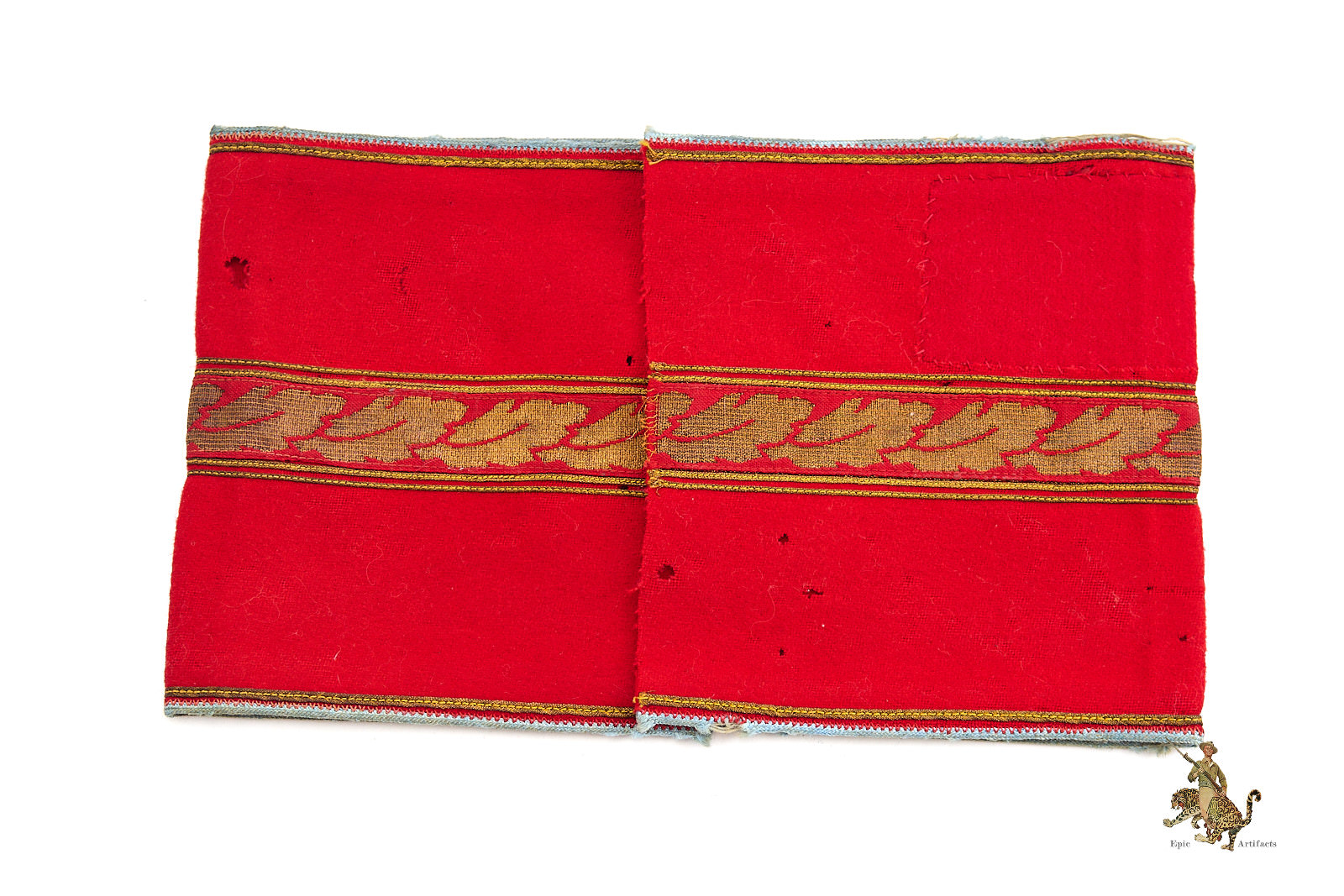 Product Description: This NSDAP Political Ortsgruppenleiter Armband is a very attractive, issued example, constructed of fine-quality wool retaining its vivid, original bright red color. Both long edges are trimmed with blue rayon piping with gold bullion thread, while the center is adorned with a machine-woven oak leaf band featuring golden celleon leaves on a red background.