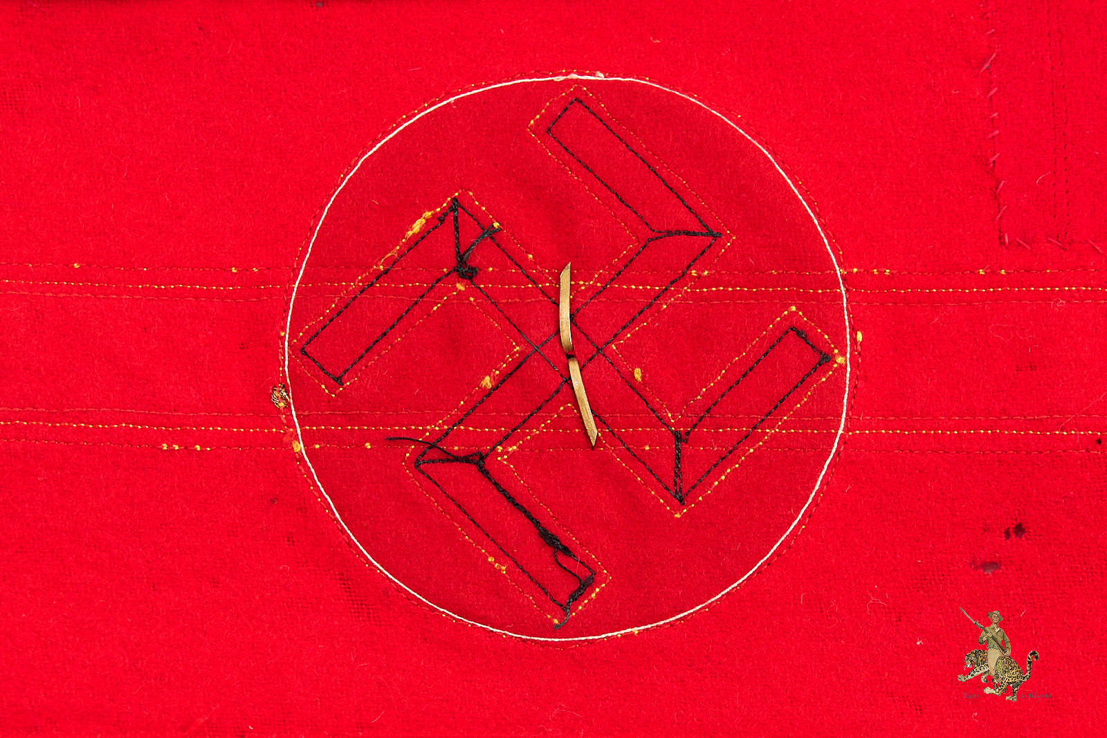 The armband shows of wear, including minor fraying at the edge of the armband, has a number of moth bits throughout and has a replaced section about 3″ x 1″ of red wood fabric.  Overall, this NSDAP Political Ortsgruppenleiter Armband remains a scarce and highly desirable example, displaying beautifully and grading very good.