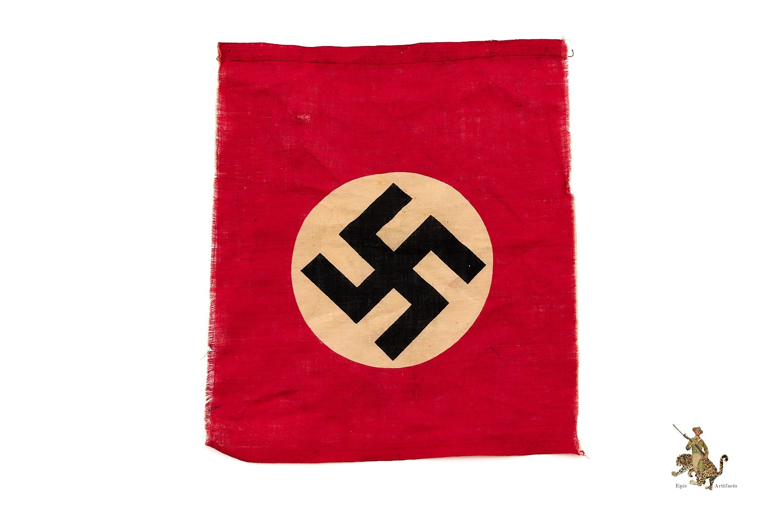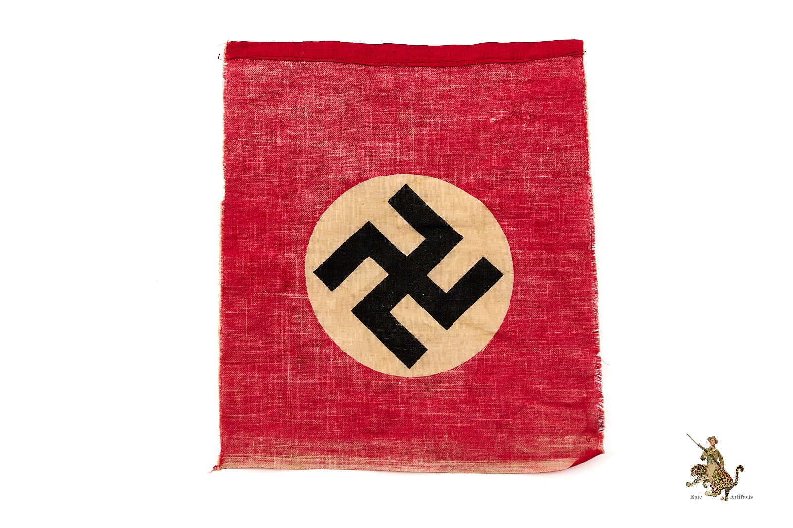 Product Description: This is a particularly attractive example of a small NSDAP flag, a format prized by collectors for its compact size, versatility, and strong display appeal. Measuring approximately 8 by 9 inches, these small national flags are often thought to have been intended for use with desk stand displays or similar presentations, making them ideal accent pieces within larger collections.