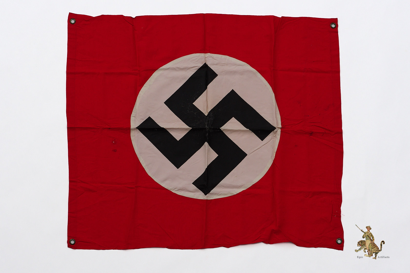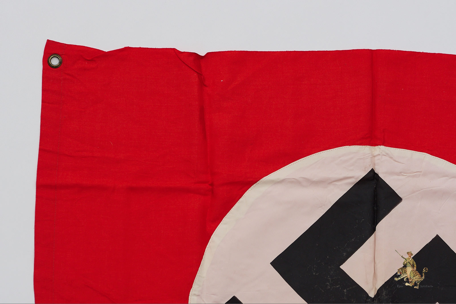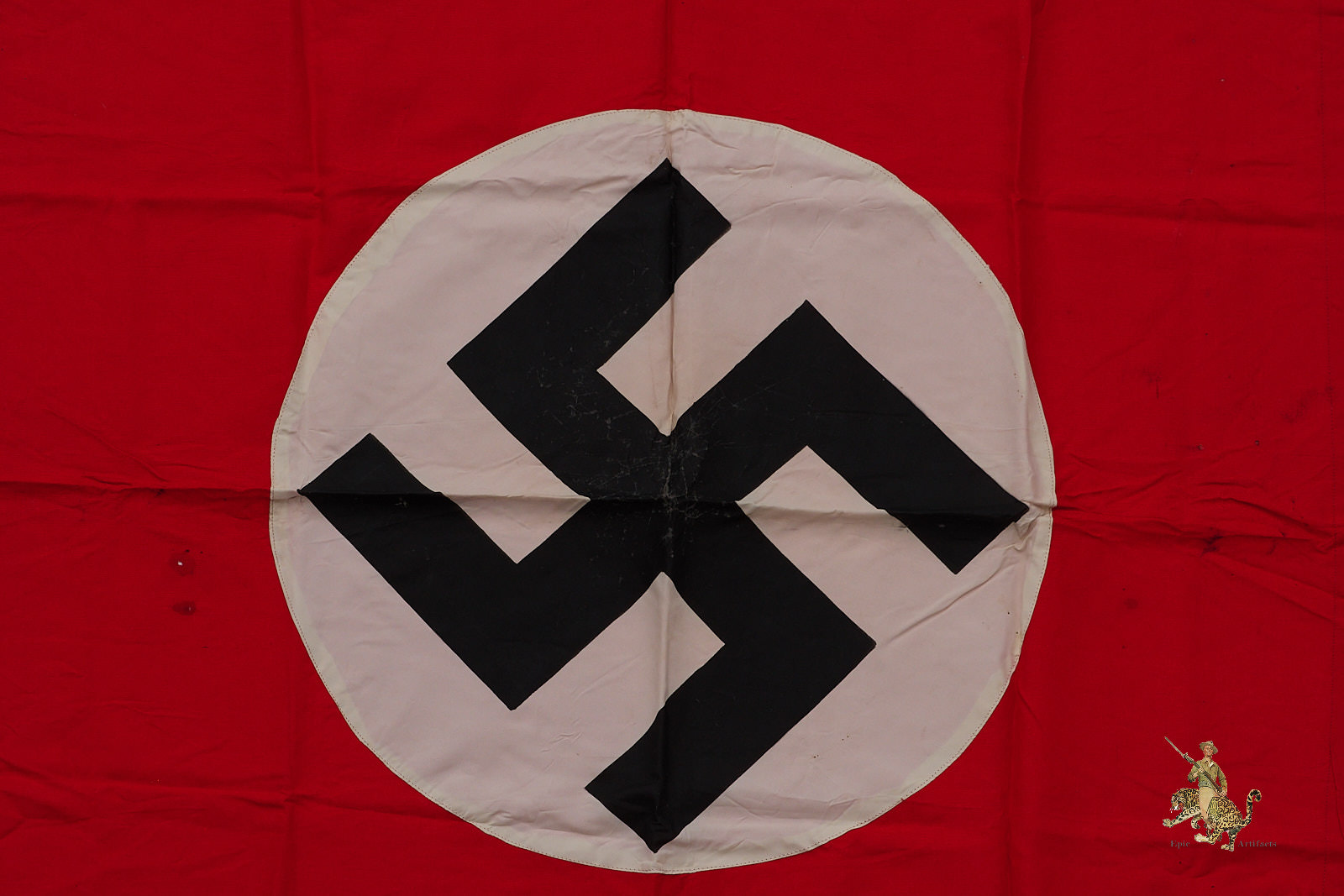 Historical Description: The red flag with white central disk and black swastika was introduced by Hitler in the 1920s as the flag of the National Socialist political party. In 1933, shortly after the Nazis took power, this party flag was recognized alongside the black-white-red Imperial tricolor as one of Germany’s national flags. In 1935, the use of the tricolor flag was discontinued, and between September 1935 and May 8, 1945, the Nazi party flag was the sole national flag of Germany. From its creation in the 1920s through the end of the war, this swastika flag was made and used in endless variations, from the massive banners hung at Party Day rallies to small pennants, bunting flags, and hand-held paper flags distributed along parade routes. These flags, banners and pennants flew from ships, were hung from official and private buildings, and were displayed outside business and private homes. At the end of WWII, the Allied military governments abolished the use of all Nazi symbols, including the national flag. Most Third Reich era German national flags were simply destroyed.