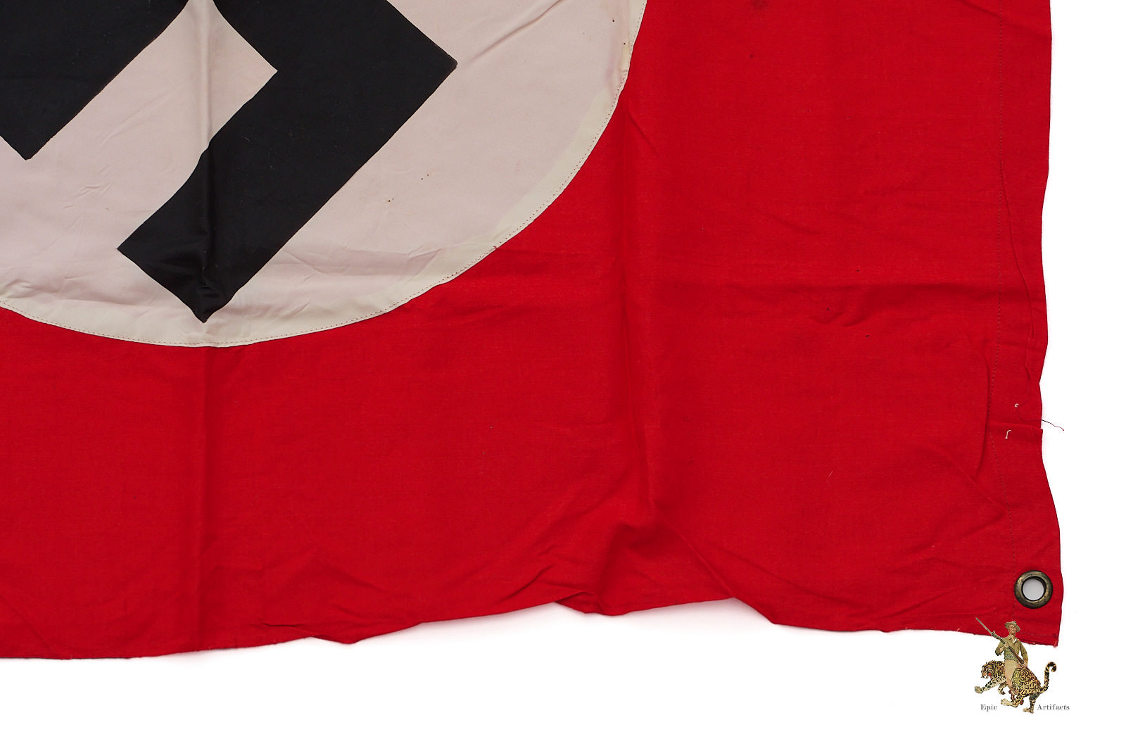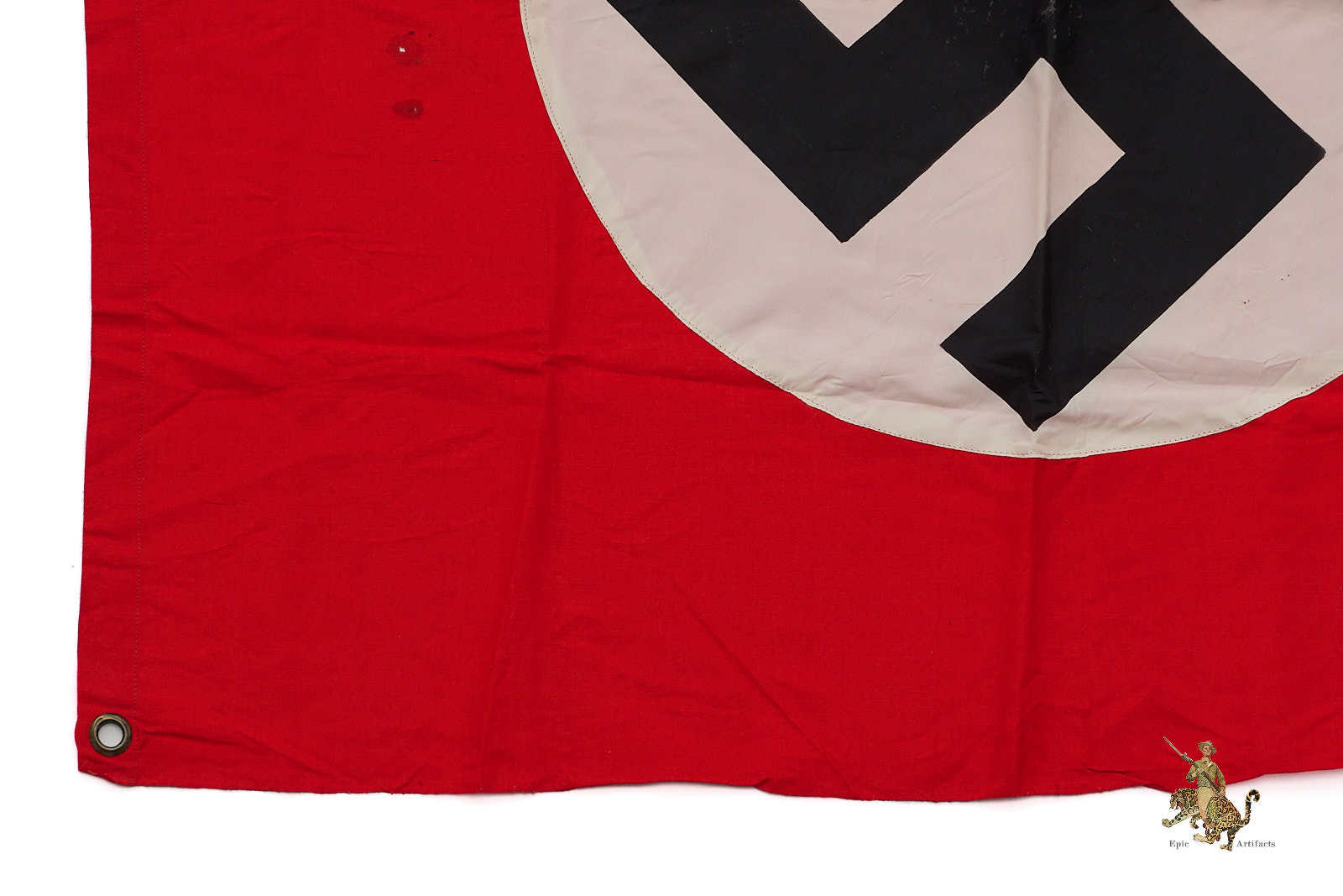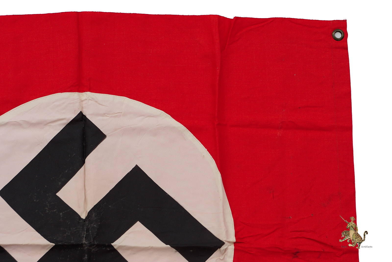 Historical Description: The red flag with white central disk and black swastika was introduced by Hitler in the 1920s as the flag of the National Socialist political party. In 1933, shortly after the Nazis took power, this party flag was recognized alongside the black-white-red Imperial tricolor as one of Germany’s national flags. In 1935, the use of the tricolor flag was discontinued, and between September 1935 and May 8, 1945, the Nazi party flag was the sole national flag of Germany. From its creation in the 1920s through the end of the war, this swastika flag was made and used in endless variations, from the massive banners hung at Party Day rallies to small pennants, bunting flags, and hand-held paper flags distributed along parade routes. These flags, banners and pennants flew from ships, were hung from official and private buildings, and were displayed outside business and private homes. At the end of WWII, the Allied military governments abolished the use of all Nazi symbols, including the national flag. Most Third Reich era German national flags were simply destroyed.