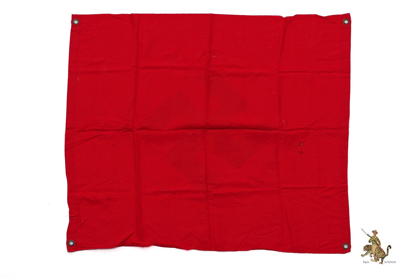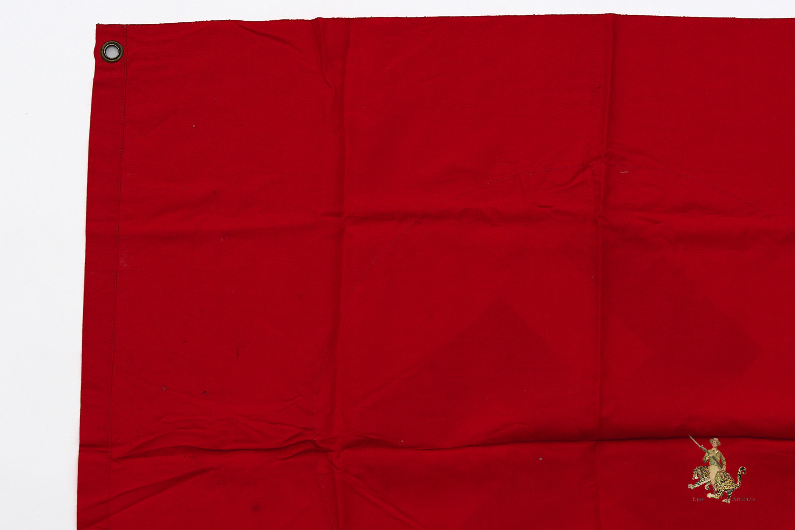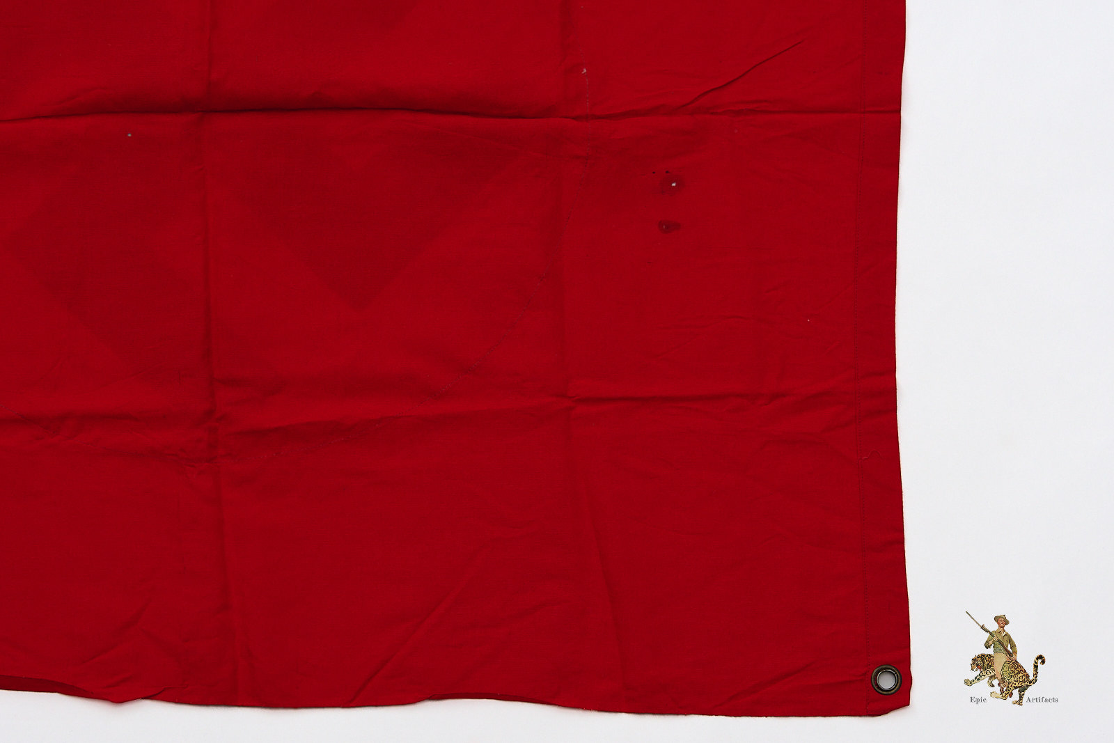 Product Description: An NSDAP Vehicle Marker Flag 70″ x 30″, presented in good condition. The red polished cotton flag measures 70″ x 30″ and features a central white roundel with a printed black swastika, machine-sewn into place. The black swastika shows expected wear consistent with age and storage, and the field exhibits minor spotting and areas of discoloration. Each corner is fitted with a metal eyelet for secure attachment to a vehicle. This NSDAP Vehicle Marker Flag 70″ x 30″ rates as excellent condition.