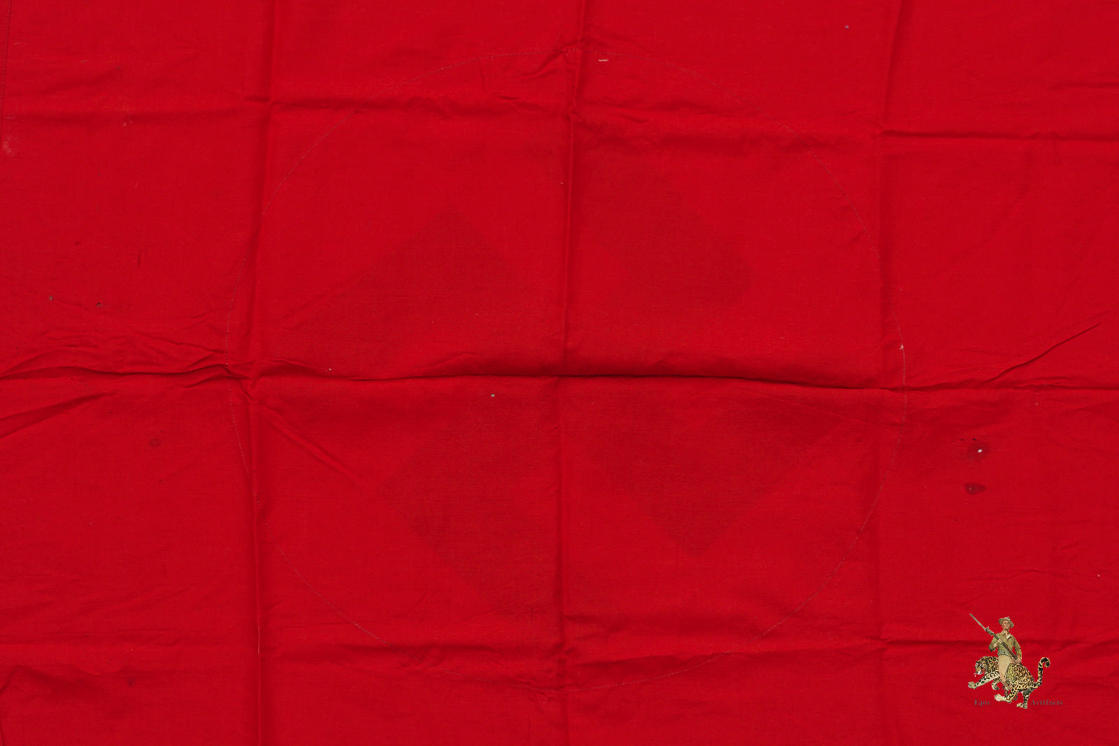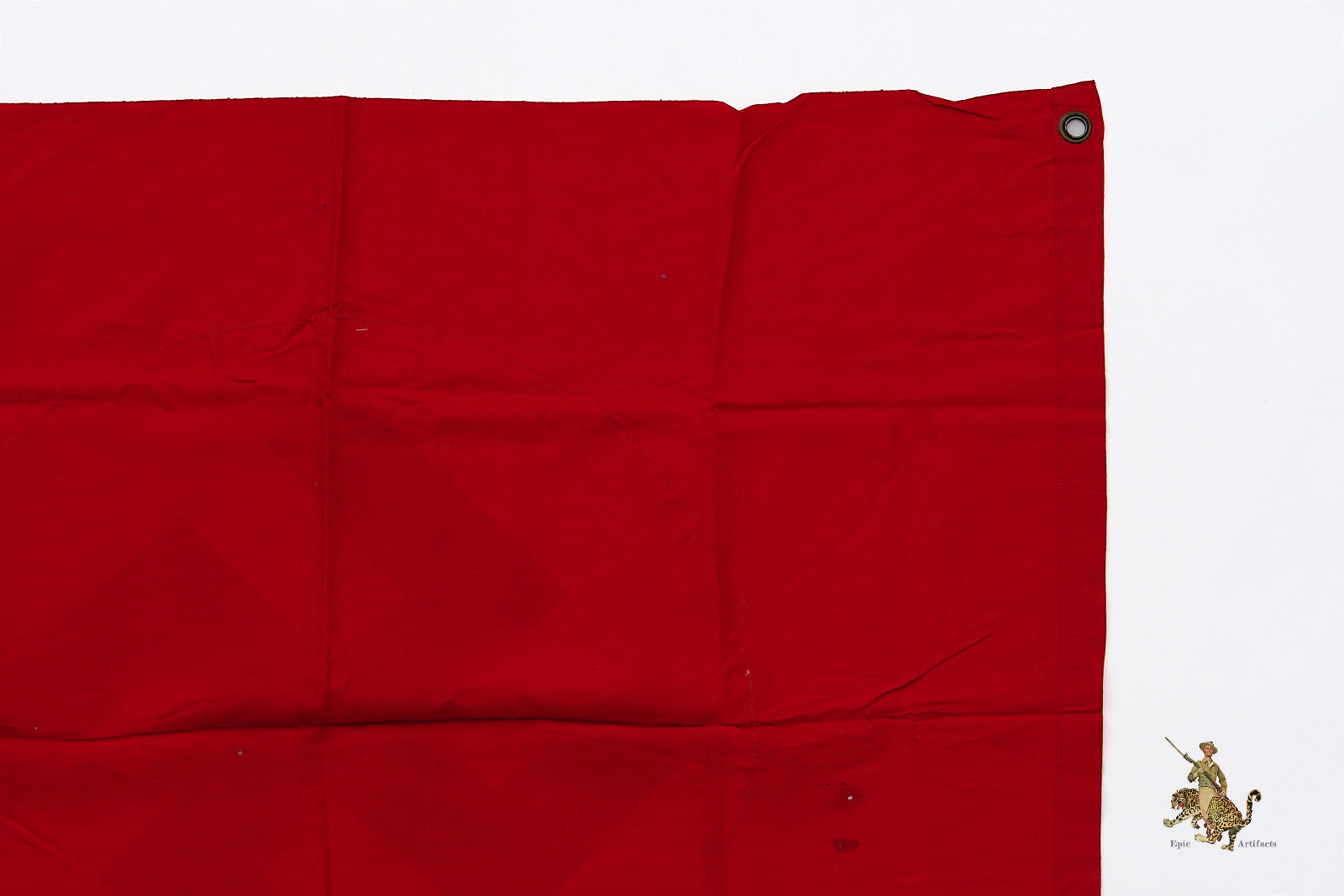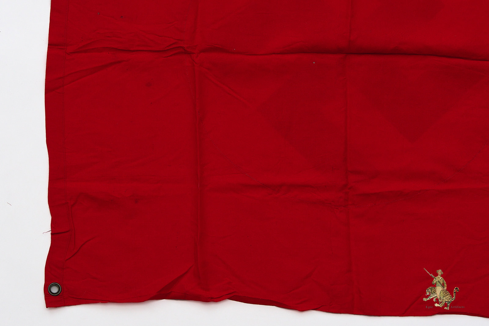 Product Description: An NSDAP Vehicle Marker Flag 70″ x 30″, presented in good condition. The red polished cotton flag measures 70″ x 30″ and features a central white roundel with a printed black swastika, machine-sewn into place. The black swastika shows expected wear consistent with age and storage, and the field exhibits minor spotting and areas of discoloration. Each corner is fitted with a metal eyelet for secure attachment to a vehicle. This NSDAP Vehicle Marker Flag 70″ x 30″ rates as excellent condition.