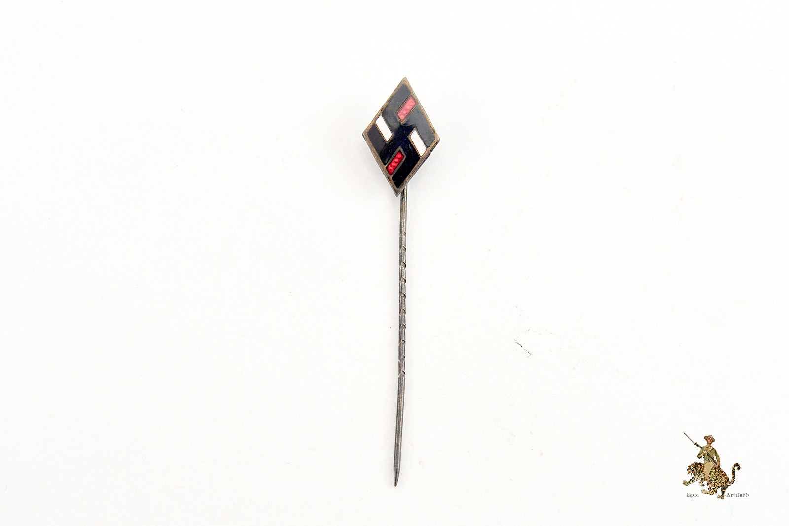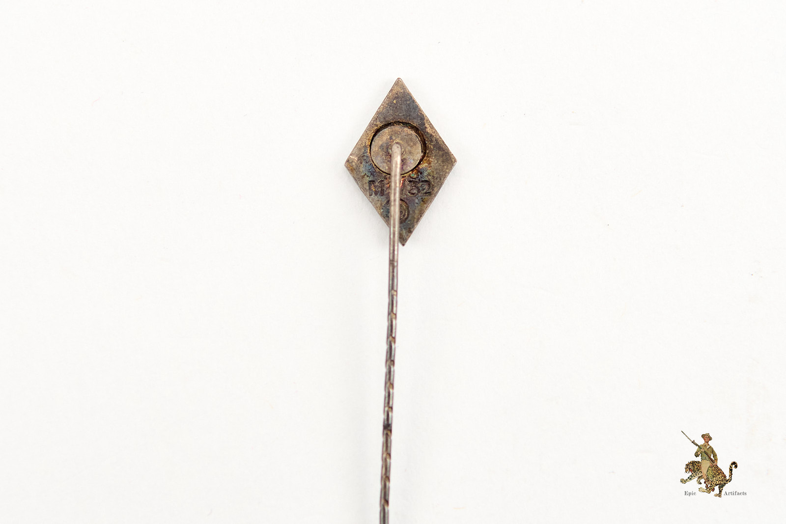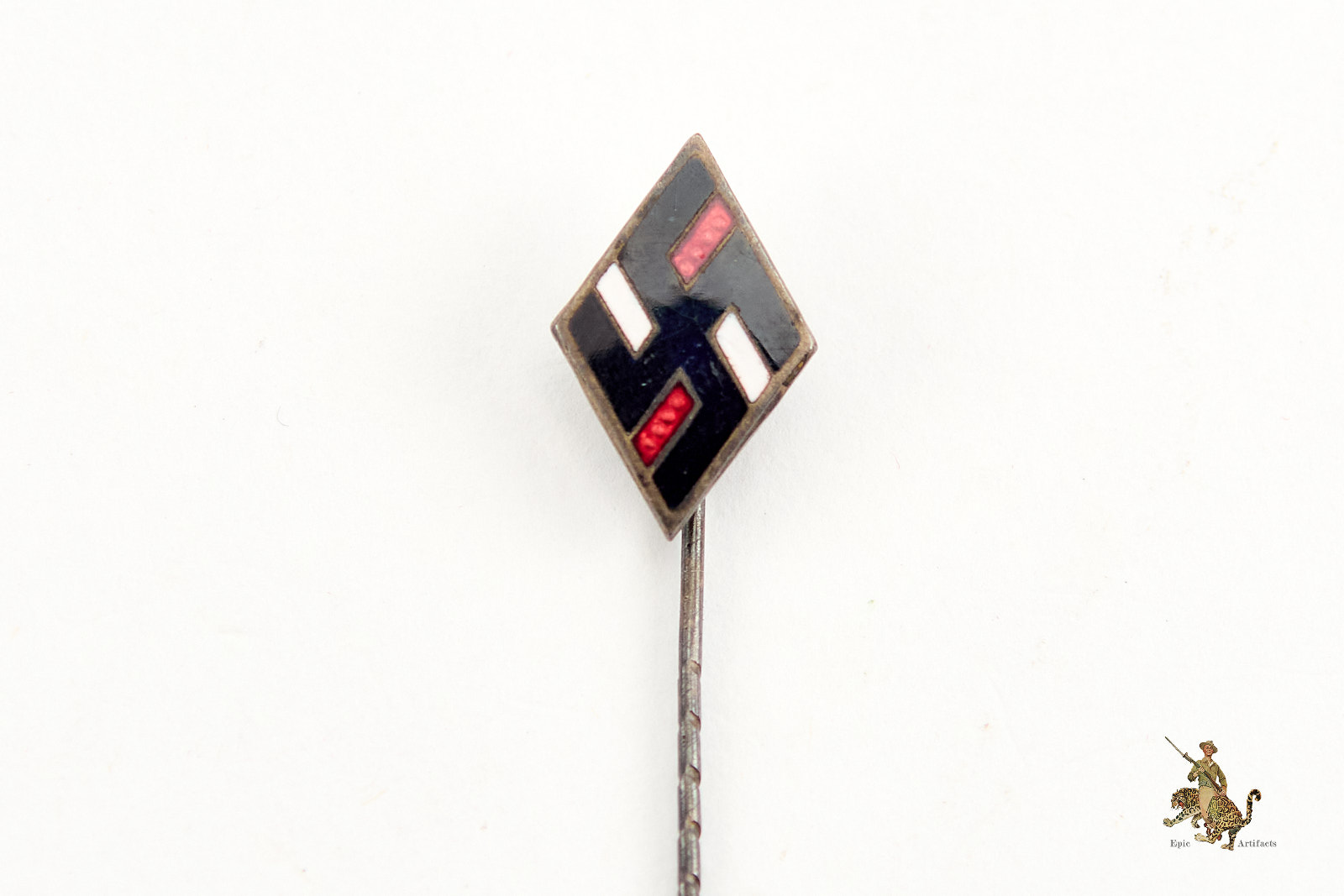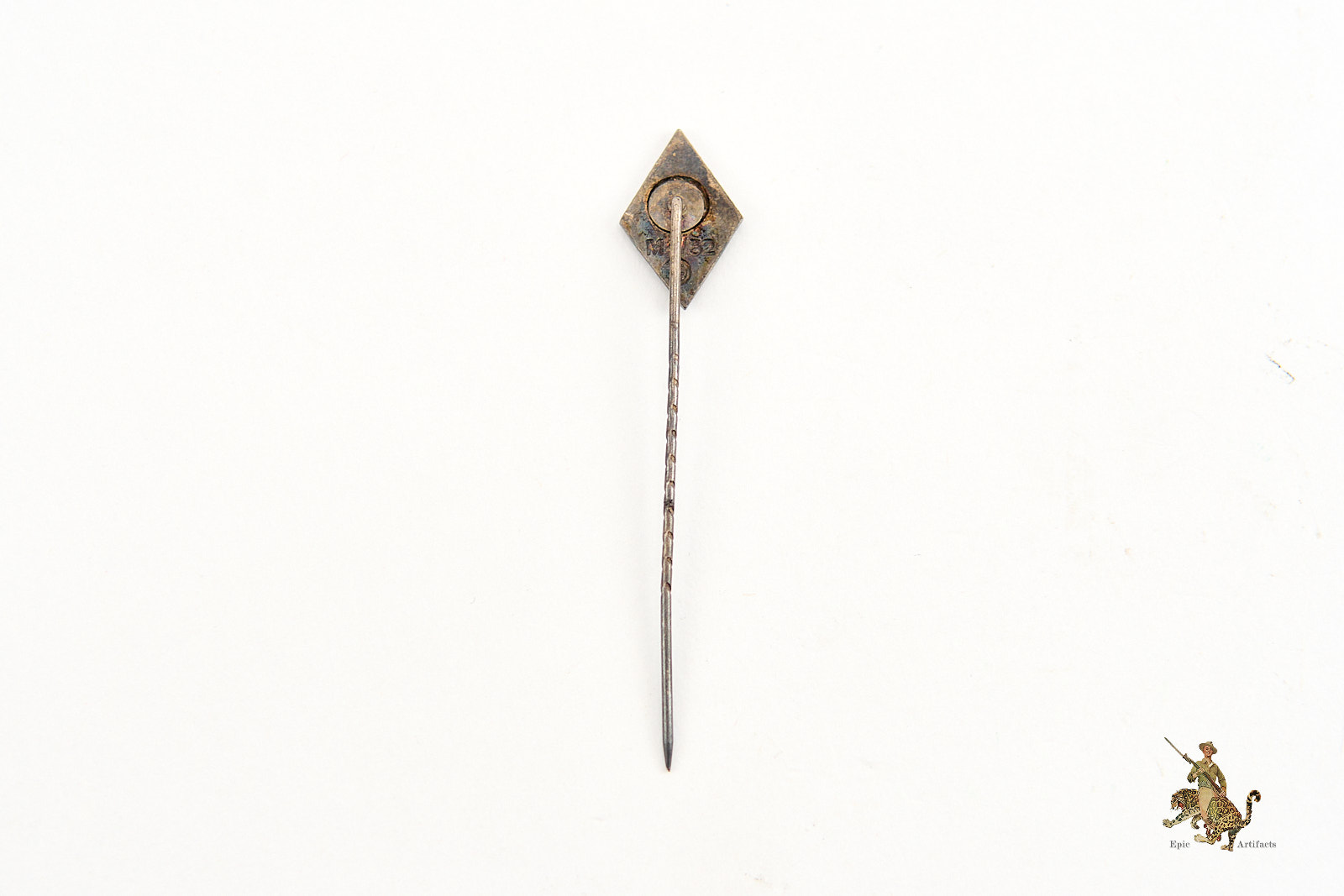 Product Description: This NSDStB Students’ League Stickpin – Deschler & Sohn, also referenced as an NS Studentenbund stickpin – RZM M1/52 Deschler & Sohn, München, is an excellent tombak example displaying black, red, and white enamel with no damage and only moderate, age-appropriate surface wear. The enamel retains strong color and clarity, characteristic of the high production standards associated with the Deschler firm.