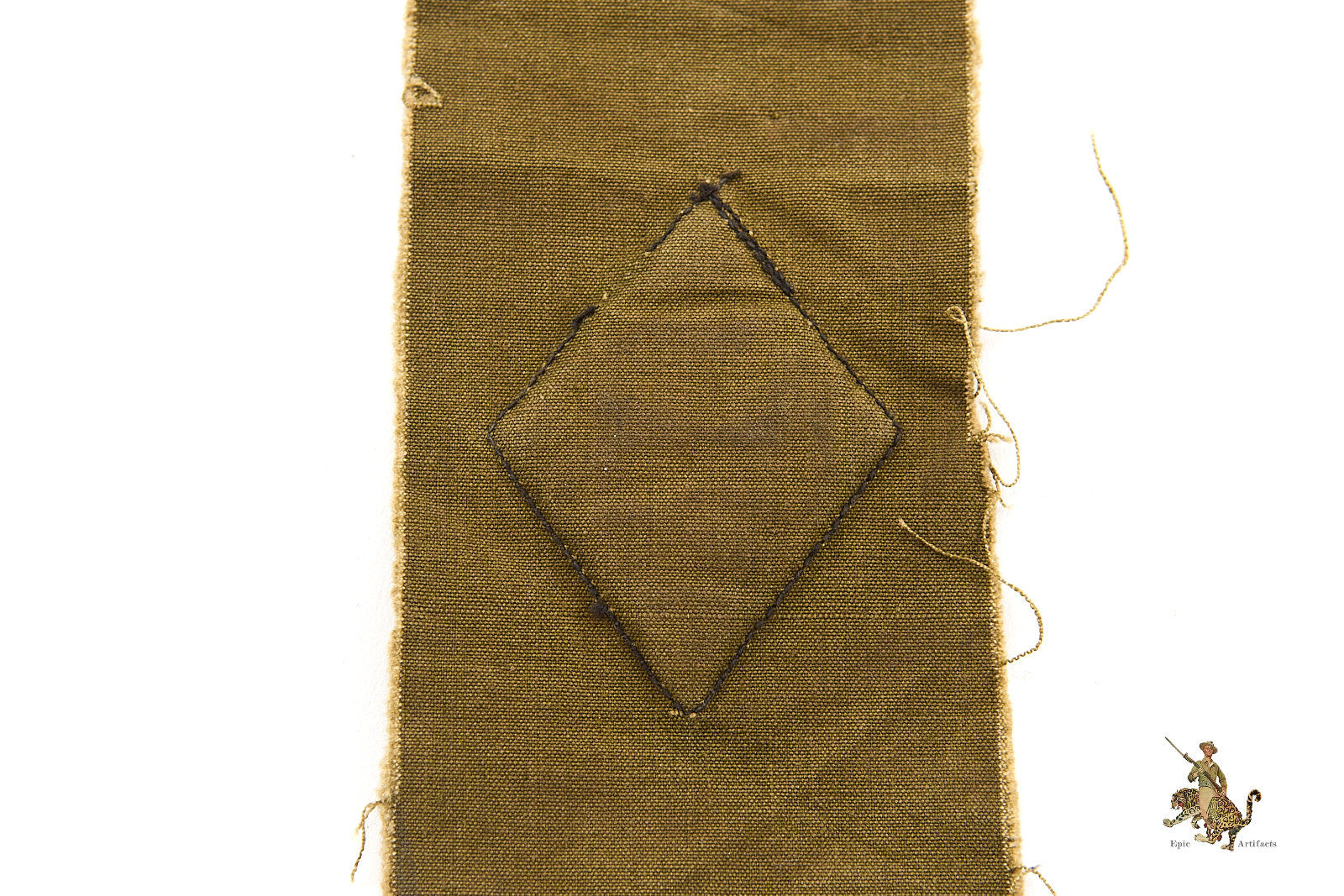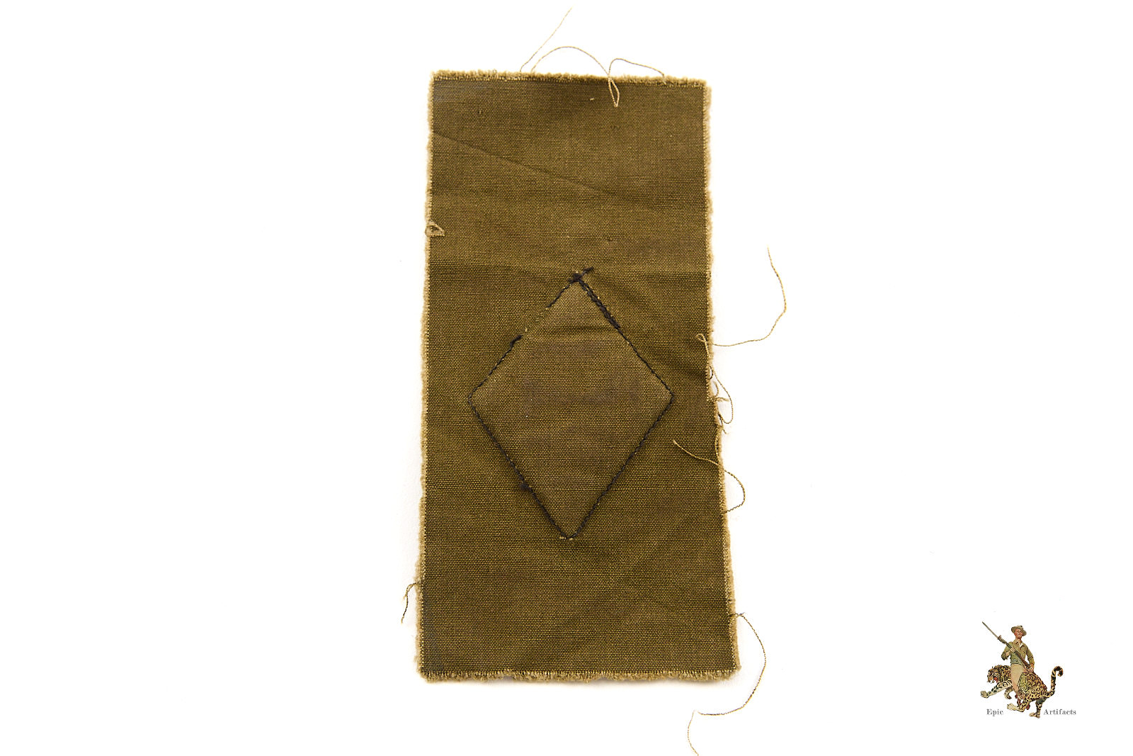 Product Description:  NSKK Member Sleeve Diamond Cut-Off, a period example of National Socialist Motor Corps insignia. The flat-wire BeVo-woven diamond is mounted on an approximately 4-inch section of original brown shirt material, retaining its machine-stitched attachment to the sleeve. The reverse and construction are consistent with period manufacture and use.