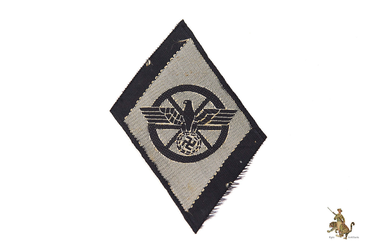 Product Description:  NSKK Qualified Driver Sleeve Diamond Insignia, a period example of National Socialist Motor Corps insignia. This BeVo-woven diamond remains in excellent + unissued condition. This insignia has never been attached, an remains as the day it was cut from the roll.