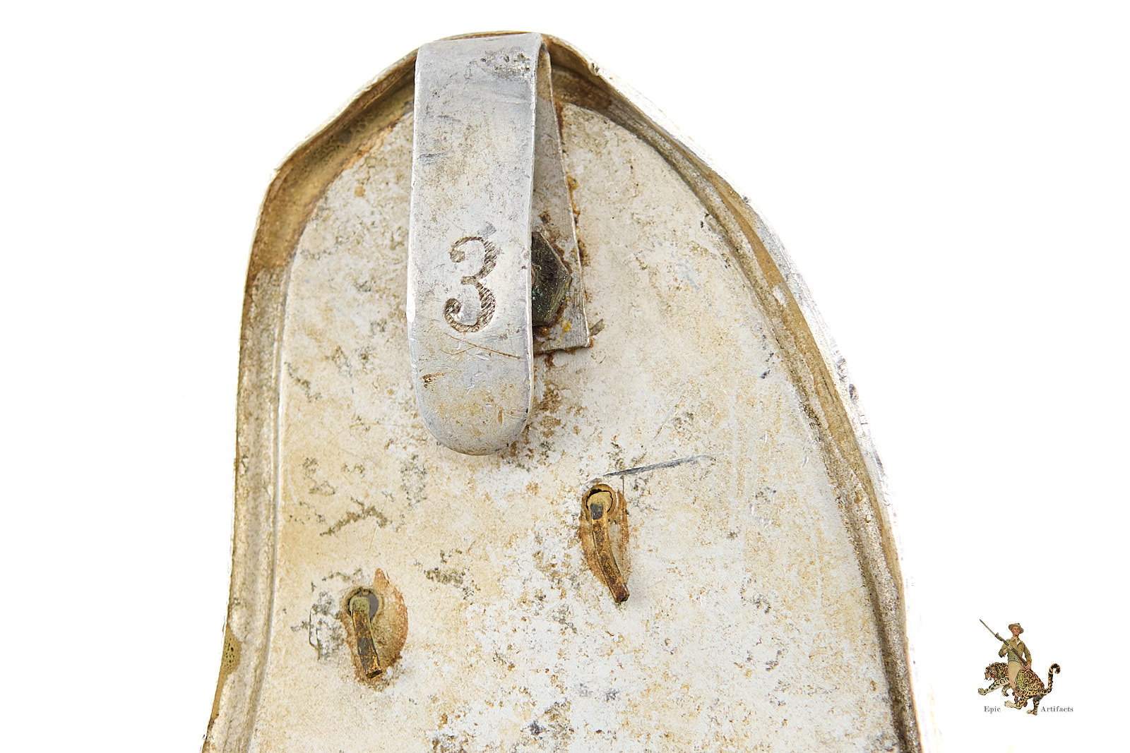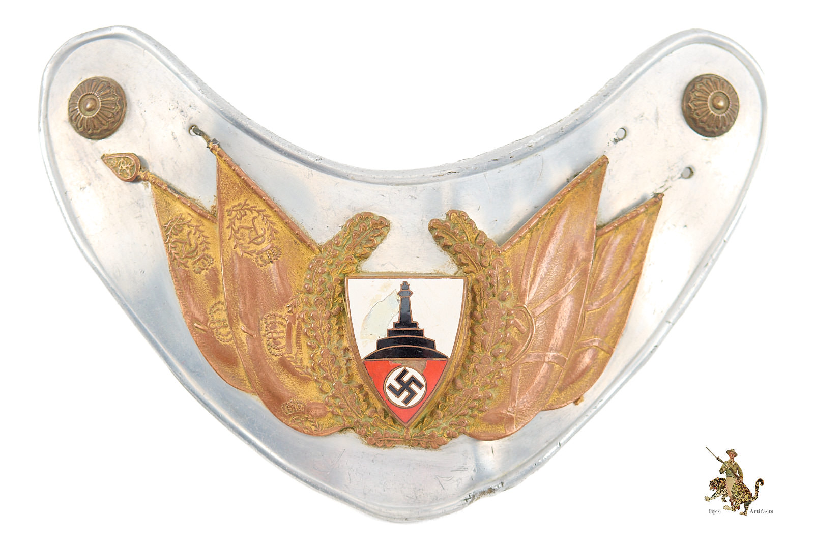 Description:  The Veterans Gorget Type I was worn by standard bearers of the Nazi organization for military veterans, the DRKB (Deutscher Reichskriegerbund), later renamed the Nationalsozialistischer Reichskriegerbund (NSRKB). It would have been worn on the uniform of those entrusted with carrying unit flags and standards at Party rallies, and in parades. The Veterans Gorget Type I was introduced in 1937. It’s made of polished metal with a silver finish and features a central enamel device with a swastika surmounted by the Kyffhäuser monument in Saxony, a symbol of the national veterans organization. The enamel device is flanked on both sides by stamped metal ornamentation featuring furled flags- Imperial era flags on the left, and the new Nazi banners on the right. This gorget has no backing remaining and shows dents and dings as well as missing tips to three of the four flags. There is one retaining hook to fasten the gorget to the uniform, it has a stamped numeral “3” which is presumably a manufacturer code. This Veterans Gorget Type I is presented without the original chain. The overall condition is very good, with flaws present to the gorget, attachments, enamel, etc. Still a very impressive piece of regalia.