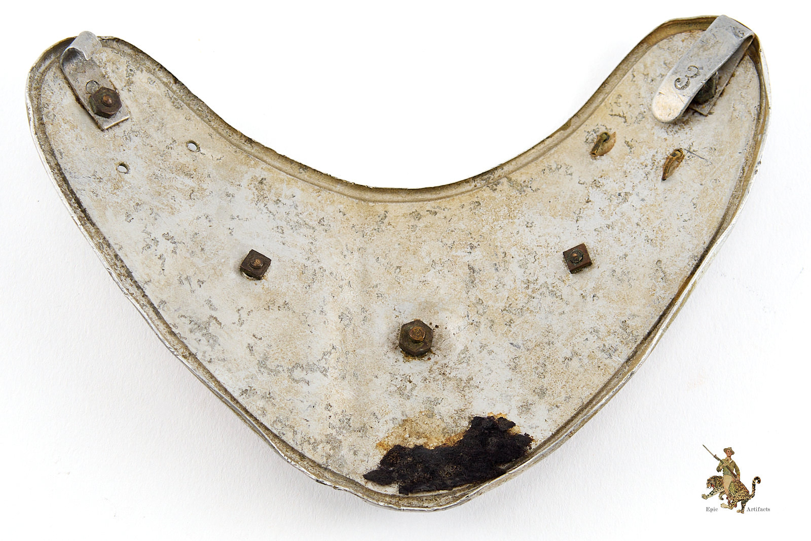 Historical Background: Gorgets were originally part of a knight’s armor during medieval times. Long after suits of armor were abandoned, the gorget continued to be used in many European armies as a form of military insignia. In the Imperial German Army until 1914, gorgets were worn as a special mark of distinction by certain elite units. Following WWI, German paramilitary and police organizations used gorgets for standard bearers, as insignia, and to denote personnel assigned special tasks. Following the Nazi rise to power, there was a vast increase in the number of uniformed organizations, and a variety of new gorgets were instituted for use by these civil, political and paramiliary organizations, as well as by the military. Standard bearers of most organizations, who were entrusted with carrying flags at rallies and in parades, wore gorgets. Other gorgets indicated assignment to guard or security forces. The military police personnel of the Wehrmacht and Waffen-SS had their own gorgets as a part of their uniforms, and were nicknamed “chained dogs” by the troops due to the chain used to suspend the gorget around the wearer’s neck. Because gorgets were never general issue to all personnel of any organization or military branch, they were manufactured in limited numbers, and are generally scarce to encounter today.