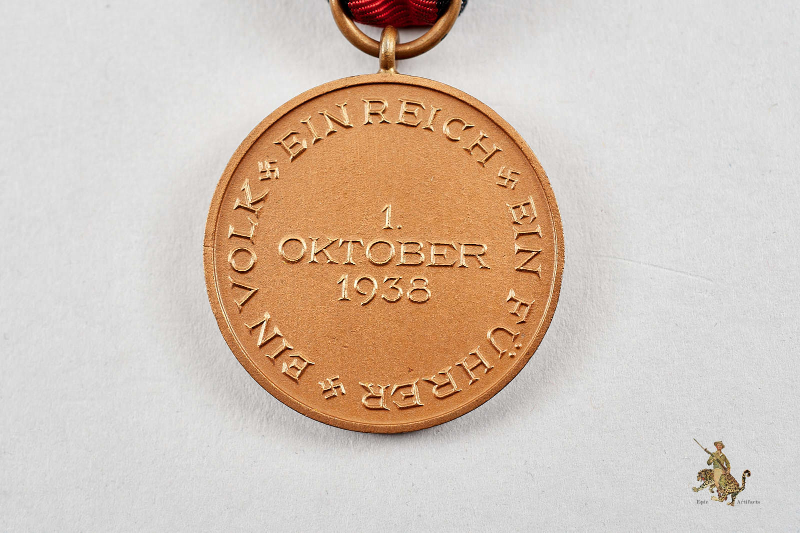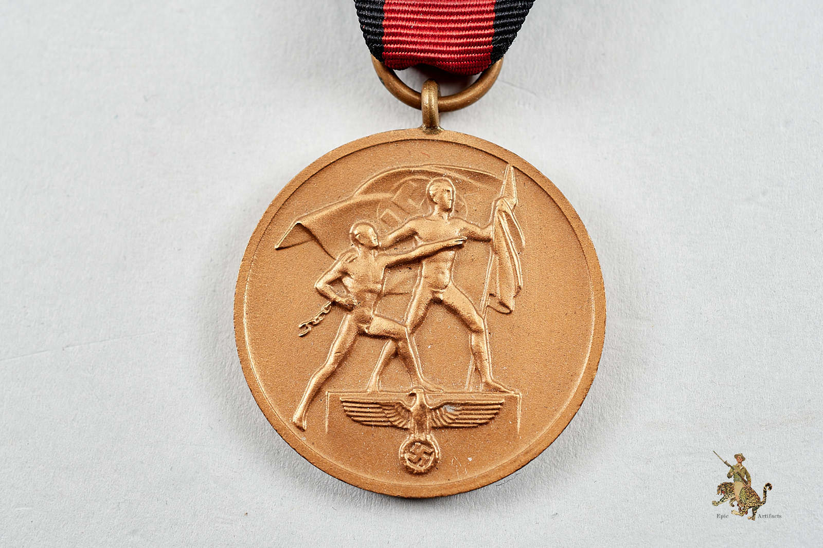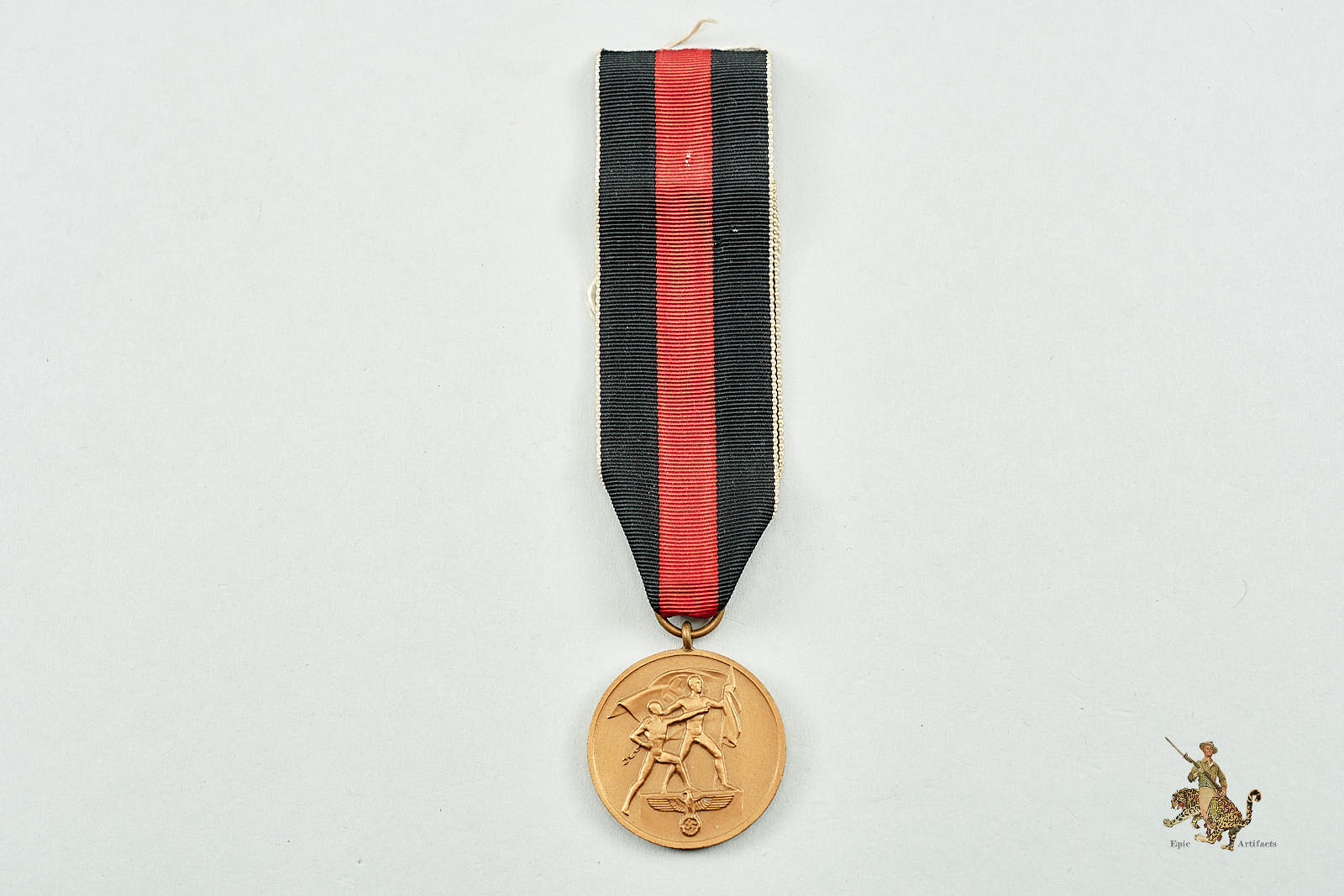 Historical Description: In 1938 and 1939, a triumphant, ascendant Germany used a combination of political/diplomatic pressure and military operations/threats to annex and occupy (or re-occupy) areas that were to become part of the Greater German Reich. To recognize these successes, the German government instituted a series of three medals, known as the German Occupation Medals (or “Flower War Medals). There were three of these awards, all with the same obverse design. They were designed by Professor Richard Klein of Munich, and featured two nude men, one bearing a Nazi flag, ascending a podium with the German eagle and swastika emblem. Each of the three different awards had a different date on the reverse (the date of the event each commemorated), and each had a different ribbon. The first of these medals to be instituted was the medal for the Austrian Anschluss, which appeared on May 1, 1938, and bore the date “13. März 1938.” It had a silver finish, and a red ribbon with white-black-white stripes at the edges. The next “Flower War” medal to be instituted, and the one awarded in the greatest numbers, came on October 18, 1938, to commemorate the occupation of the Sudetenland on October 1. It had a bronze finish and a red and black ribbon. The reverse of each of these bore the lettering “Ein Volk, Ein Reich, Ein Führer” (One People, One Nation, One Leader” with German swastika emblems and the date of institution of the award. The last of these medals, the “Memel Medal,” was authorized on May 1, 1939, and commemorated the return of the Memel Territory on March 22, 1939. This medal had a different reverse, a bronze finish, and a ribbon with white, red, and green stripes. This medal was only awarded 31,322 times (compared to 318,689 awards of the Anschluss medal and 1,162,617 awards of the Sudetenland medal). Issue of “Flower Wars” medals ceased at the end of 1940.