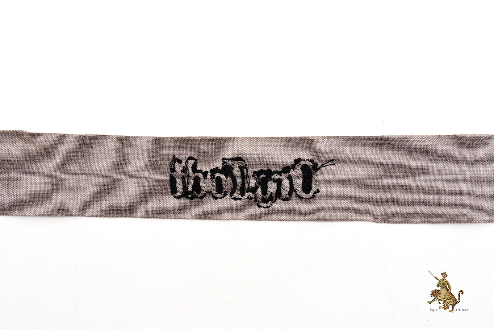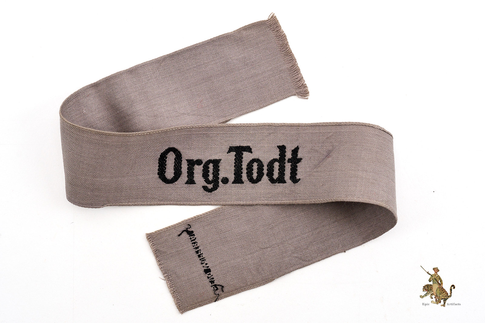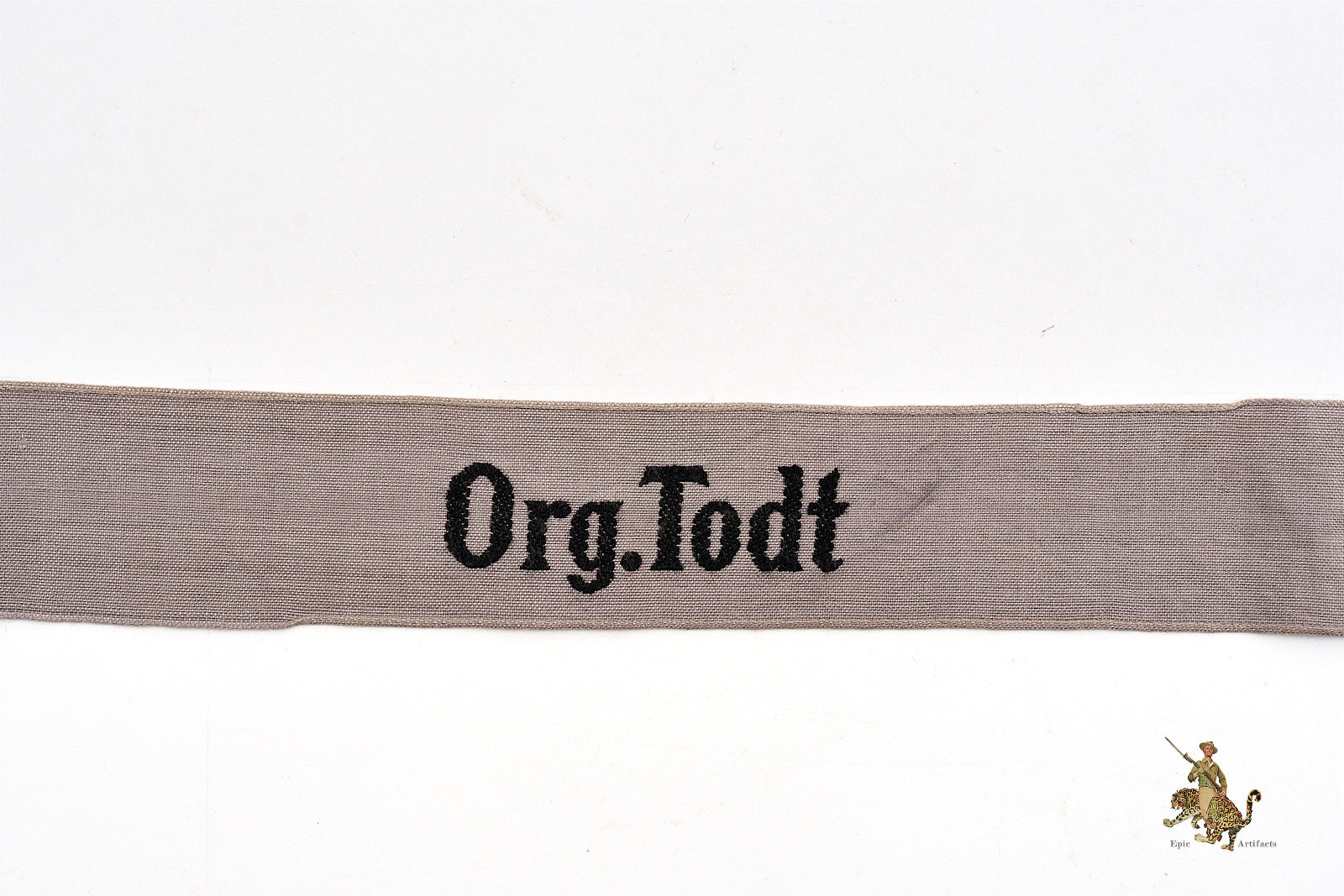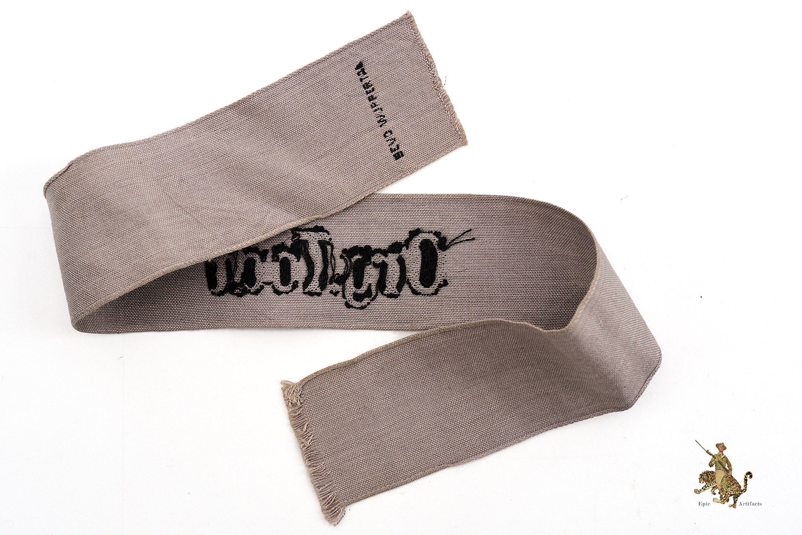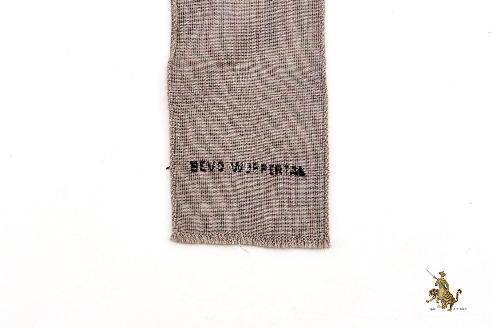 Product Description: This Org. Todt cuff title is a one-look original piece. This is made of cotton and is the standard Bevo woven form, with black lettering on an gray background. It is full length, with unsewn short ends. Cuff title is an original unissued piece. The edges have some slight fraying from age. Near one end, the maker “BEVO WUPPERTAL” is woven into the cotton. Some minor age related discoloration as shown. The reverse shows textbook details of the machine weaving. This Org. Todt cuff title displays great and is an appealing example of its type. The condition rates as excellent.