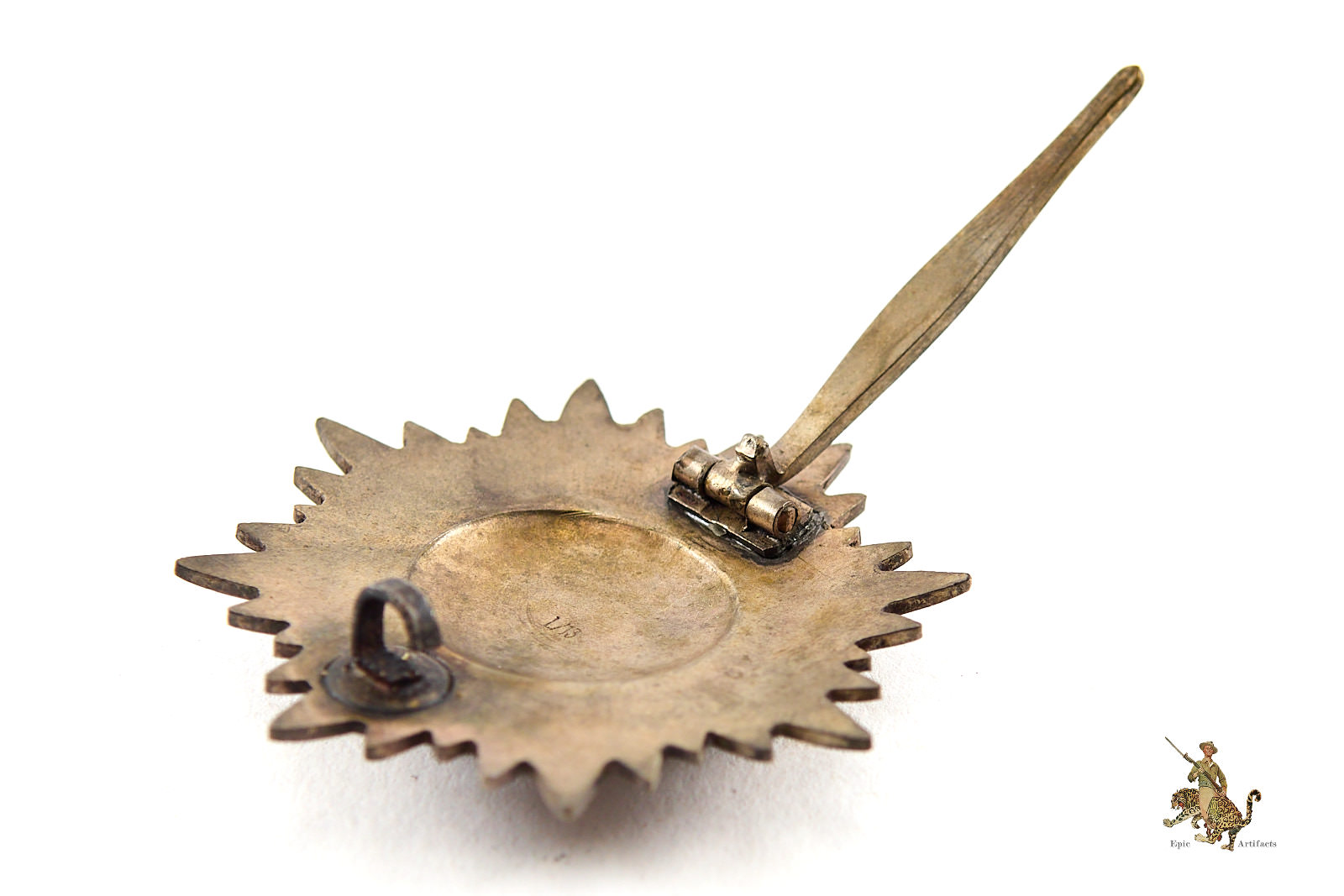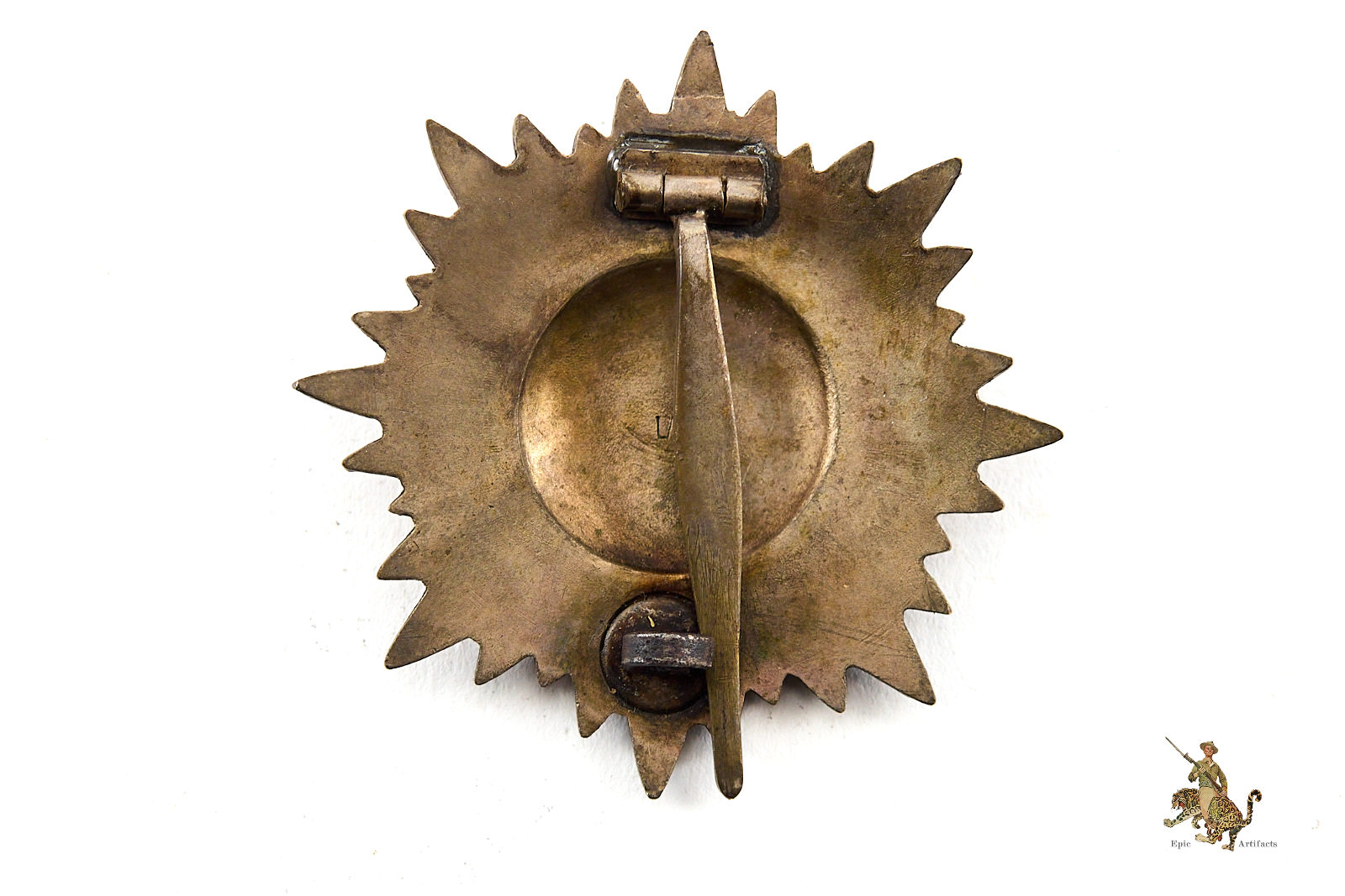 Product Description: This Ostvolk Medal 1st Class without Swords – Silver – Meybauer is an original silver tone metal award. Almost all of the original factory applied finish is intact as shown. The banjo style attachment pin is functional, but there are glue remnants at hinge plate from a previous repair.. There is a makers mark “L/23” for Paul Meybauer. This Ostvolk Medal without Swords – 1st Class – Silver – Meybauer is an honest original example. The condition rates as very good.