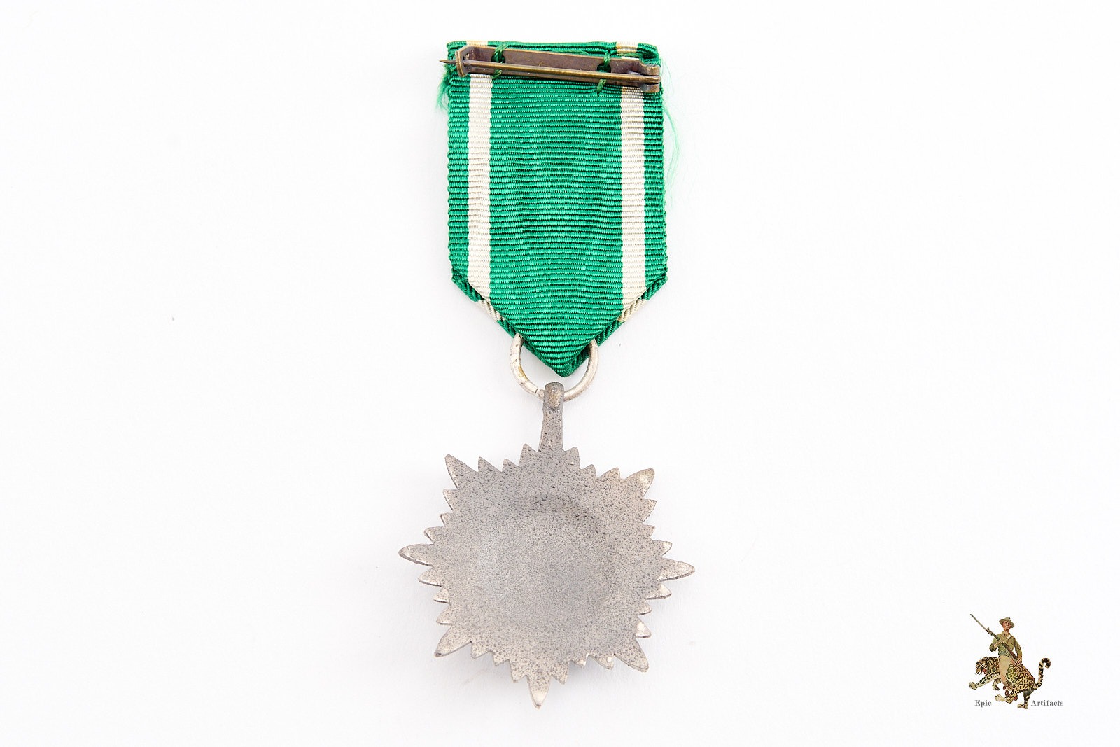 Product Description: This is a great representative example of the Ostvolk Medal Second Class in Silver with Swords. The medal is made of zinc, and shows oxidation and minimal remaining silver finish. This is the version with swords, meaning it was the type awarded for acts of bravery. There is an even, minor patina on both the front and reverse of the medal. This Ostvolk Medal Second Class in Silver with Swords is complete with its original ribbon, which is of course the correct ribbon for this class and grade. The ribbon retains its original pin attachment, which is intact and functional. The ribbon is crisp and has only extremely minor age toning. This Ostvolk Medal Second Class in Silver with Swords remains in excellent condition. .
