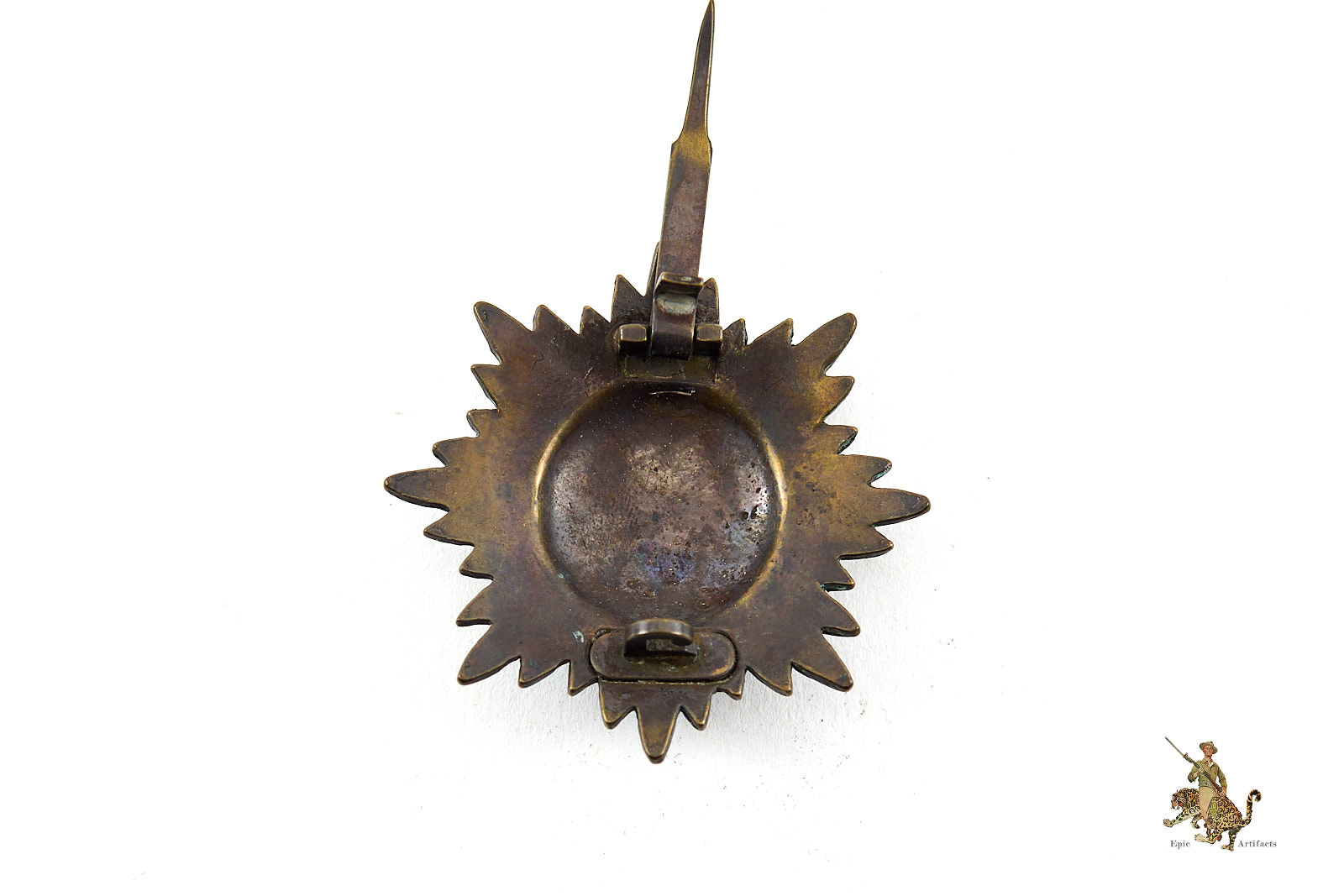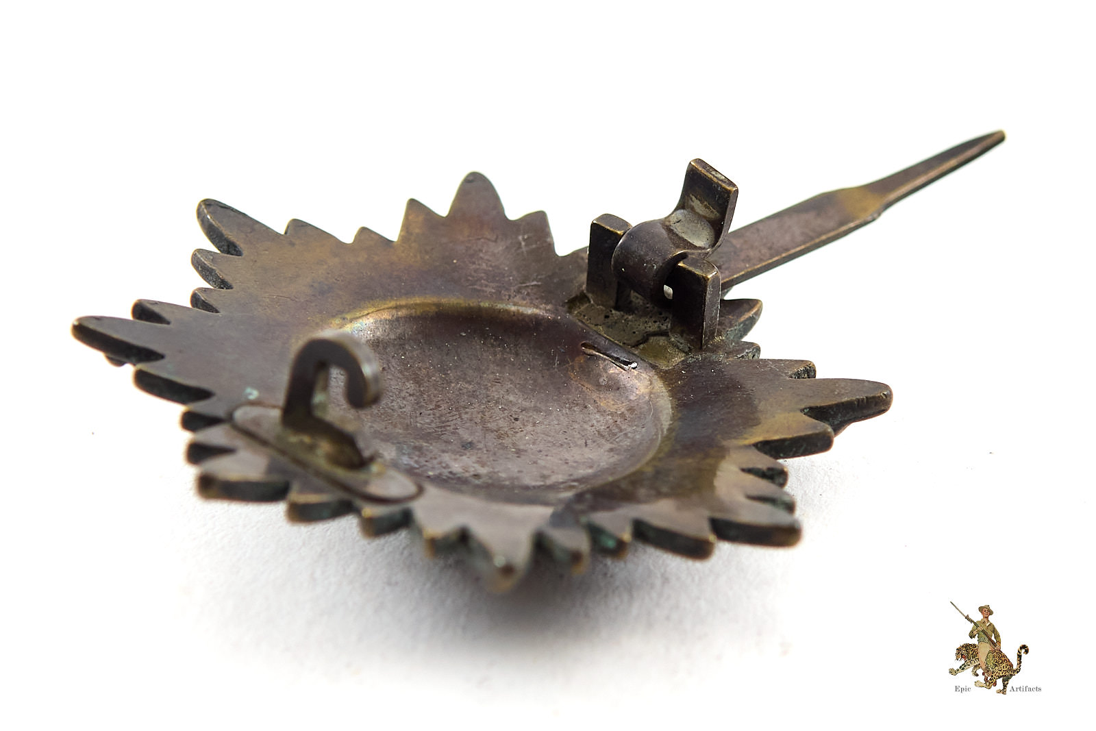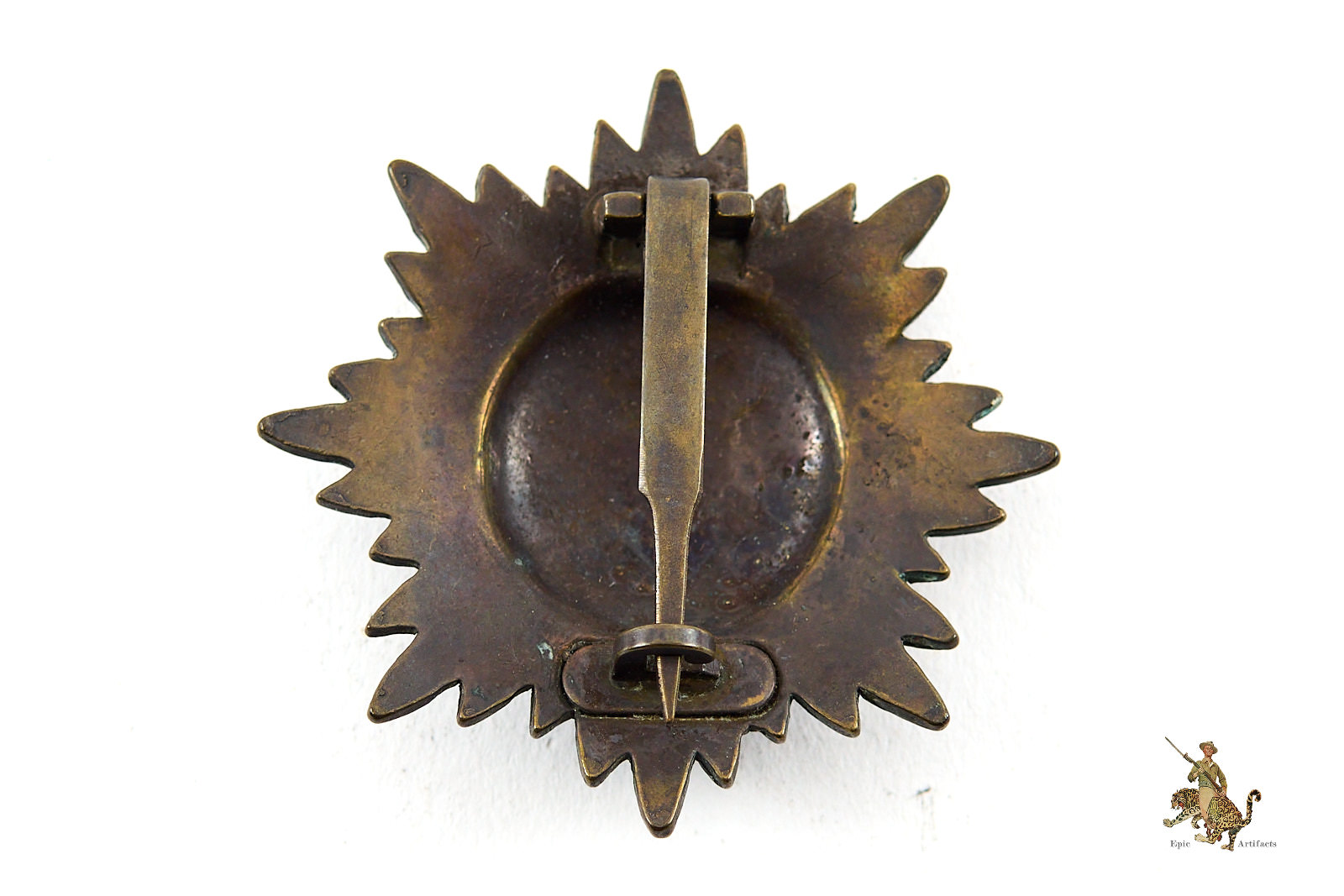 Product Description: This Ostvolk Medal with Swords – 1st Class – Silver is an original tombak award. Almost all of the original factory applied finish is gone on both sides of the award. Award shows the base metal tombak throughout. The wide style attachment pin is functional. There is a no makers mark found. This Ostvolk Medal with Swords – 1st Class – Silver is an honest original example. The condition raters as excellent.
