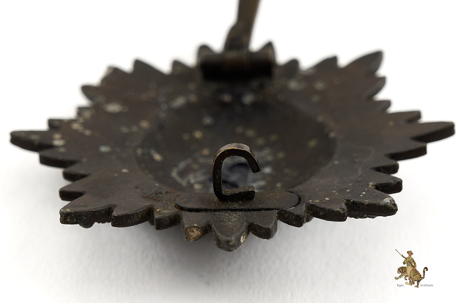 Product Description: This Ostvolk Medal with Swords – 1st Class is an original zinc award. Almost all of the original factory applied finish is gone on both sides of the award. Possibly some light remnants of silver finish in the recesses. Front of award shows oxidation and zinc pest. The banjo style attachment pin is functional. There is no maker mark. This Ostvolk Medal with Swords – 1st Class is an honest original example. The condition raters as very good.