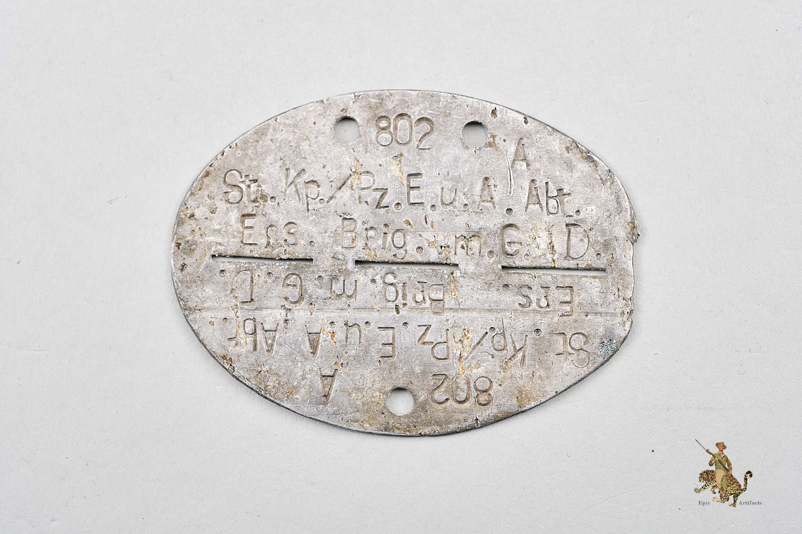 Product Description: This German WWII Heer Panzer Armored Replacement Mortar Detachment ID Disc, commonly referred to as a dog tag is made of aluminum and features the stamped details of the soldier, including unit designation and unique identification numbers.  Disc is perforated to allow for breaking into two halves in case of death. Carrying pouch is constructed of leather and has aged nicely.  Has some surface cracking and wear consistent with age.  This Heer Panzer Armored Replacement Mortar Detachment ID Disc remains in excellent condition, with clear, legible stamping and minimal wear, showing careful preservation.