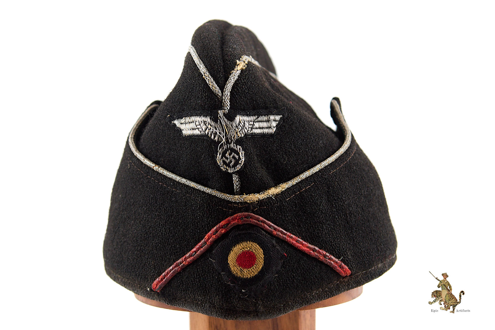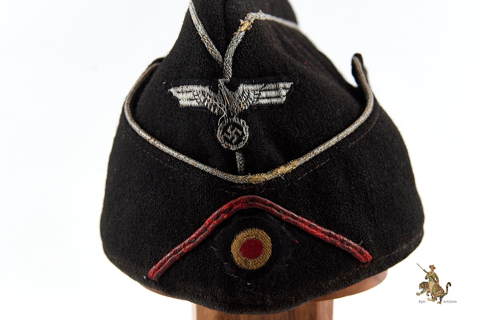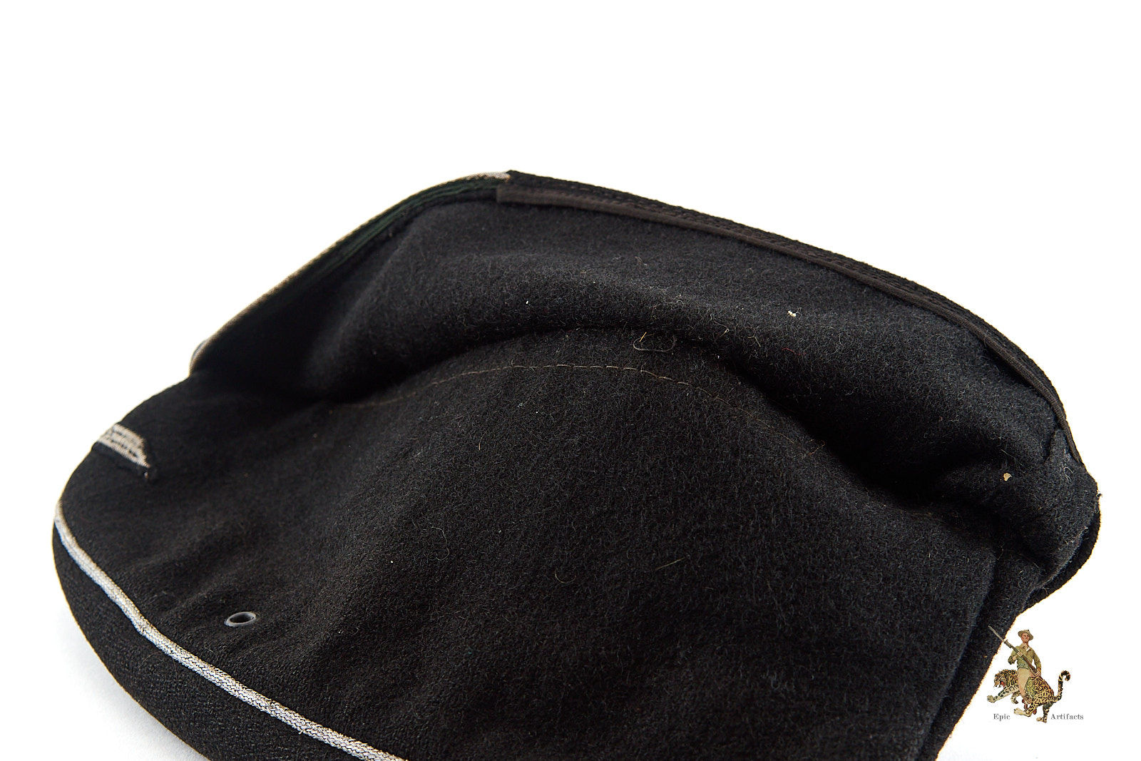 Product Description: Panzer Artillery Officers Cap with red soutache for the artillery branch. This Heer overseas cap is made in a high quality black wool with moderate wear, but with very little damage, mainly on exposed areas from being worn. Light soiling is present on the lower front and lower rear section, with lighter soiling around the lower edge. Two early high quality black painted brass rivets are present. Silver bullion officer piping is present around the top and the forward flap, with moderate damage and wear from being worn; especially on the lower front, and the front and rear of the top piping. Approximately three inches of damage with the inner core sometimes visible. Bullion officer Heer eagle is hand applied and era sewn, with light wear and damage, and with several loose strands in the center of the eagle. Cockade is hand applied and also era sewn, with the matching wear and soiling. The red soutache is era applied to the cap. While the tails of the braid are correctly sewn through the cap, the braid was applied with black thread hand applied through its center. There is no indication of the soutache having been postwar applied. The cap is lined in a high quality black rayon with a nice uniform natural wear and light damage around the lower edge from being worn. No markings are present and one inch of the lining is open near the lower front. A rare example of a Panzer Artillery Officers Cap not easily found on the market.