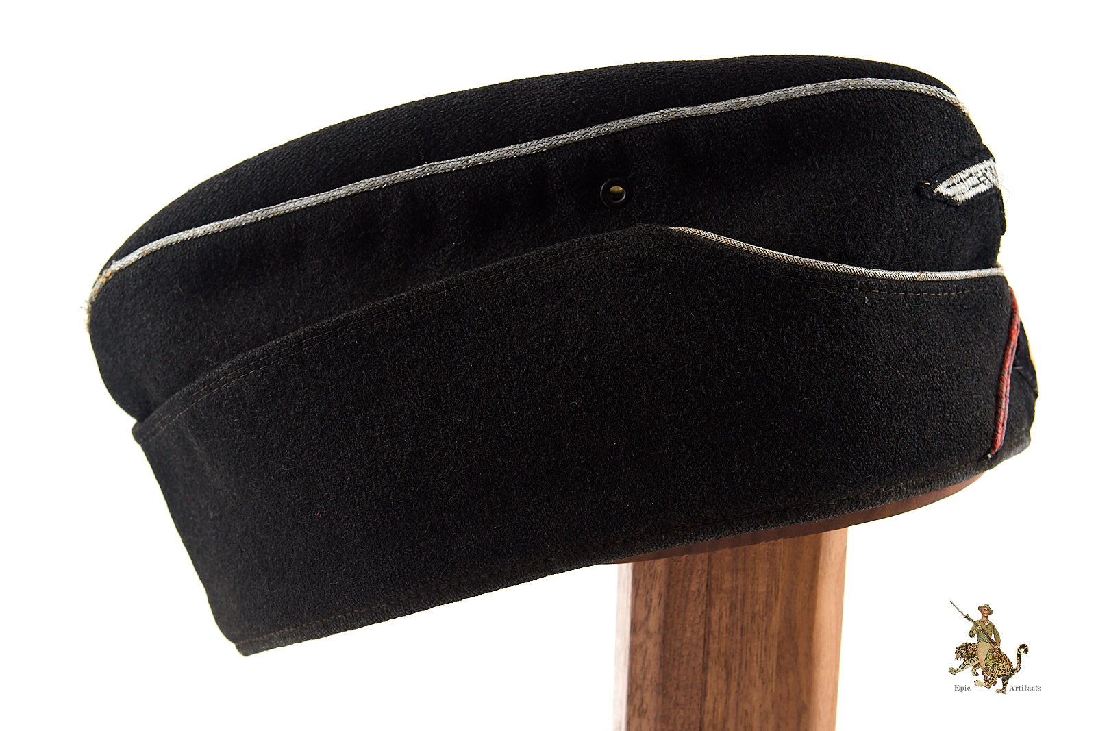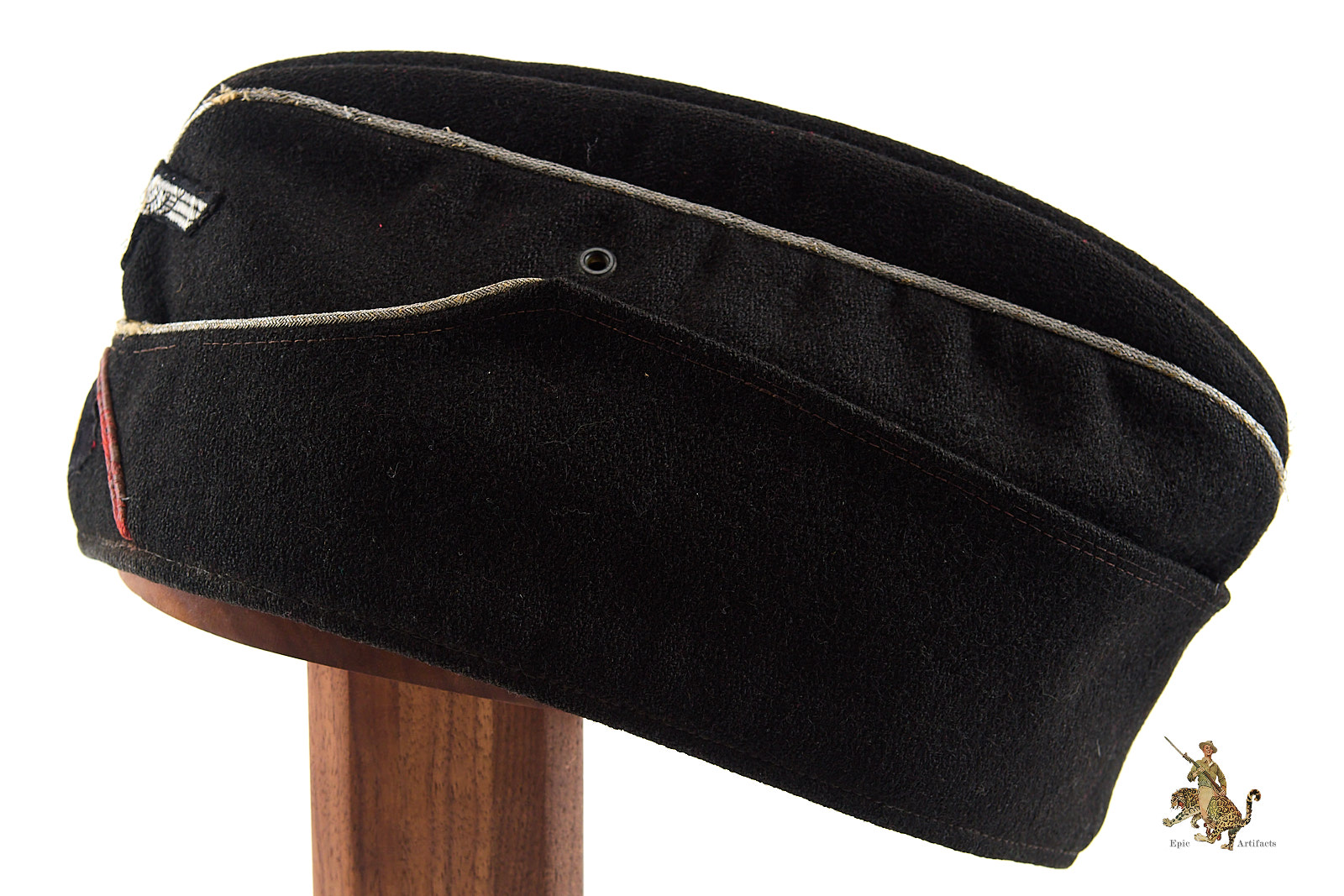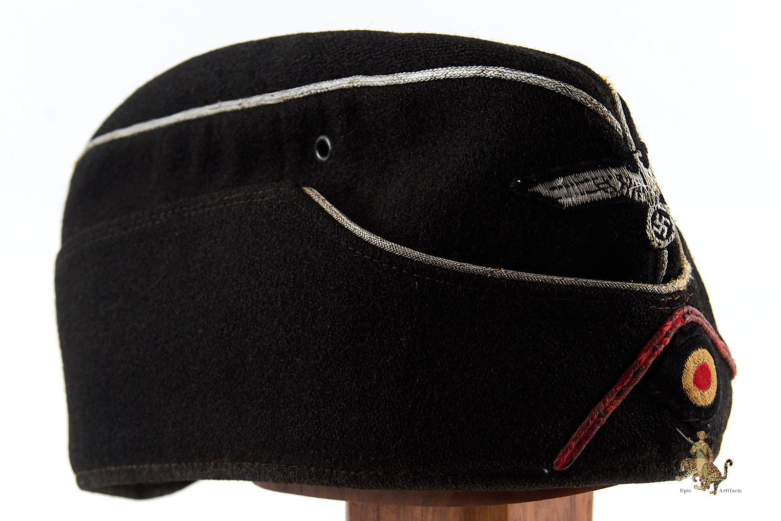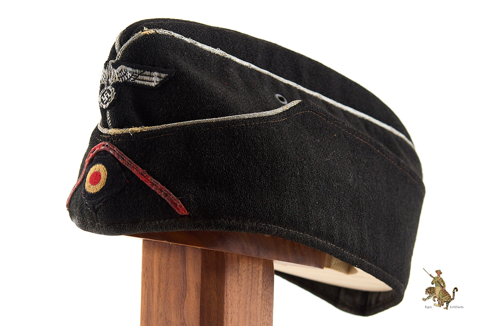 Product Description: Panzer Artillery Officers Cap with red soutache for the artillery branch. This Heer overseas cap is made in a high quality black wool with moderate wear, but with very little damage, mainly on exposed areas from being worn. Light soiling is present on the lower front and lower rear section, with lighter soiling around the lower edge. Two early high quality black painted brass rivets are present. Silver bullion officer piping is present around the top and the forward flap, with moderate damage and wear from being worn; especially on the lower front, and the front and rear of the top piping. Approximately three inches of damage with the inner core sometimes visible. Bullion officer Heer eagle is hand applied and era sewn, with light wear and damage, and with several loose strands in the center of the eagle. Cockade is hand applied and also era sewn, with the matching wear and soiling. The red soutache is era applied to the cap. While the tails of the braid are correctly sewn through the cap, the braid was applied with black thread hand applied through its center. There is no indication of the soutache having been postwar applied. The cap is lined in a high quality black rayon with a nice uniform natural wear and light damage around the lower edge from being worn. No markings are present and one inch of the lining is open near the lower front. A rare example of a Panzer Artillery Officers Cap not easily found on the market.