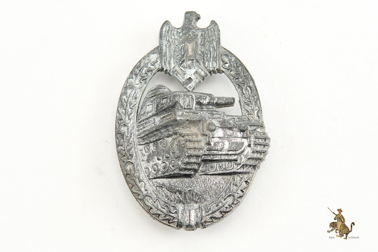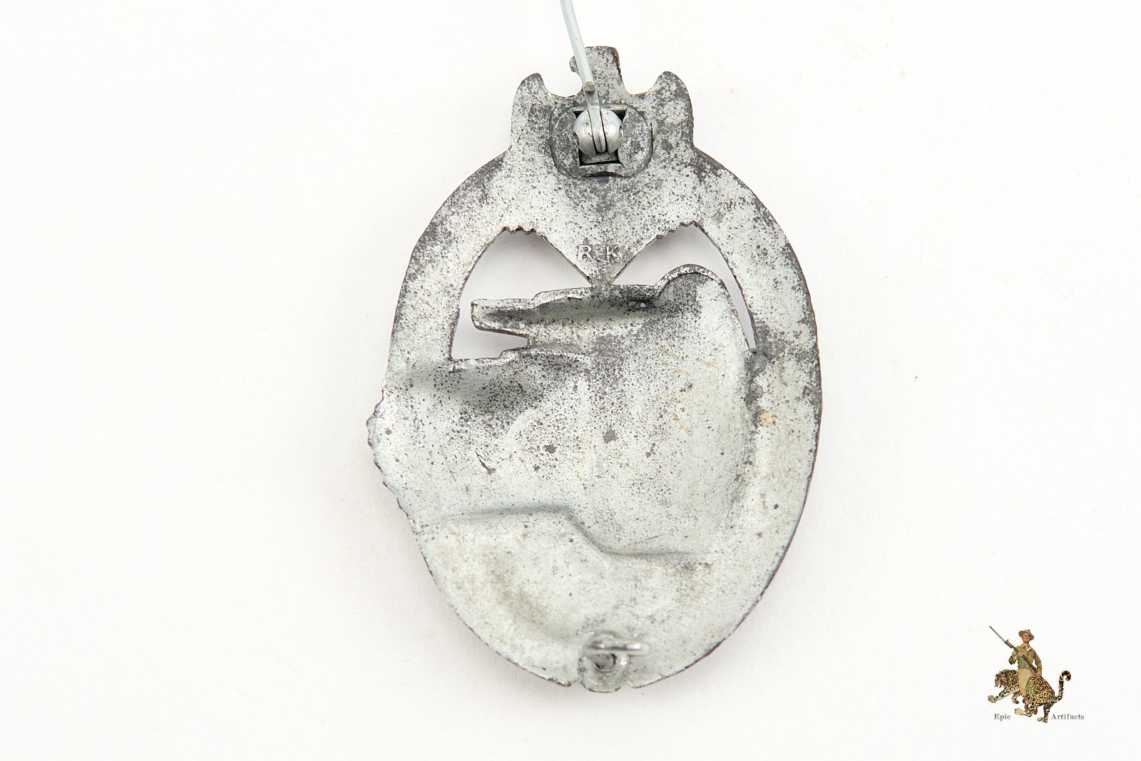 Product Description:  A particularly handsome and well-preserved example of the Panzer Assault Badge in Silver – R.K., awarded to armored troops of the Wehrmacht in recognition of participation in three or more combat engagements. This is a late-war production, struck in fine zinc, exhibiting strong detail and an impressive degree of original finish.