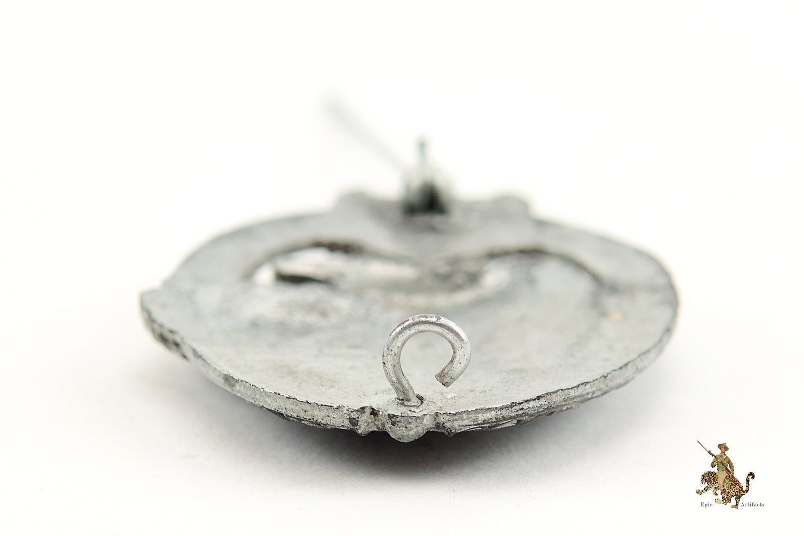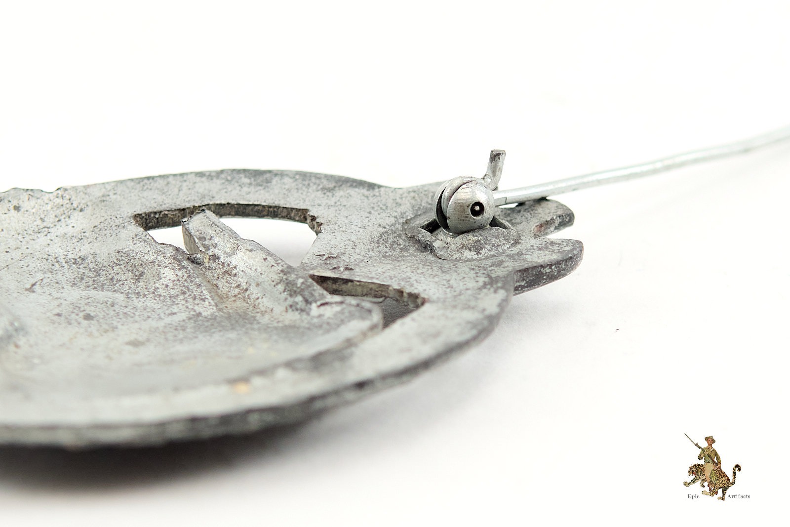 The reverse features a semi-hollow construction, with a concave depression behind the tank. It is maker marked “R.K.” in raised lettering beneath the swastika, confirming manufacture by the firm Rudolf Karneth, a known and respected wartime producer. The hardware is entirely correct for this variant, featuring a crimped-in ball hinge, round wire catch, and a fully functional round wire attachment pin.