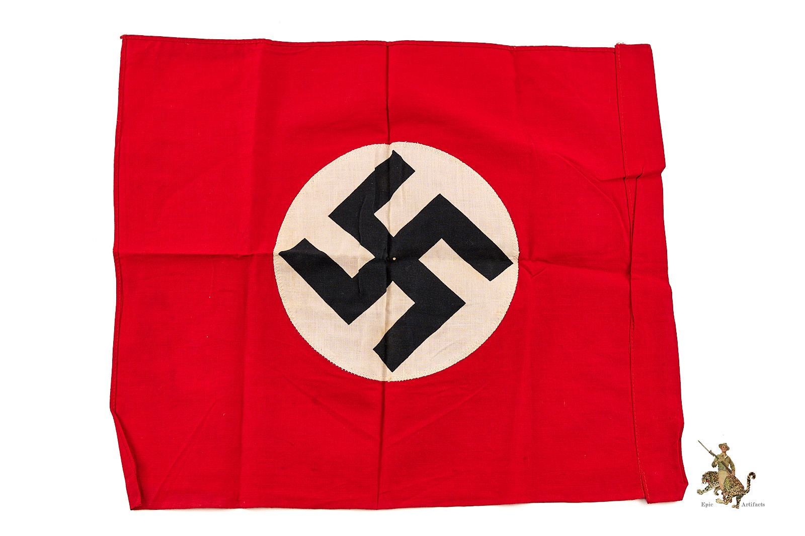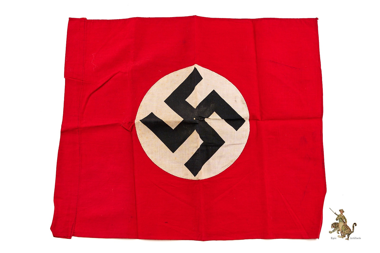 Historical Description: The red flag with white central disk and black swastika was introduced by Hitler in the 1920s as the flag of the National Socialist political party. In 1933, shortly after the Nazis took power, this party flag was recognized alongside the black-white-red Imperial tricolor as one of Germany’s national flags. In 1935, the use of the tricolor flag was discontinued, and between September 1935 and May 8, 1945, the Nazi party flag was the sole national flag of Germany. From its creation in the 1920s through the end of the war, this swastika flag was made and used in endless variations, from the massive banners hung at Party Day rallies to small pennants, bunting flags, and hand-held paper flags distributed along parade routes. These flags, banners and pennants flew from ships, were hung from official and private buildings, and were displayed outside business and private homes. At the end of WWII, the Allied military governments abolished the use of all Nazi symbols, including the national flag. Most Third Reich era German national flags were simply destroyed.
