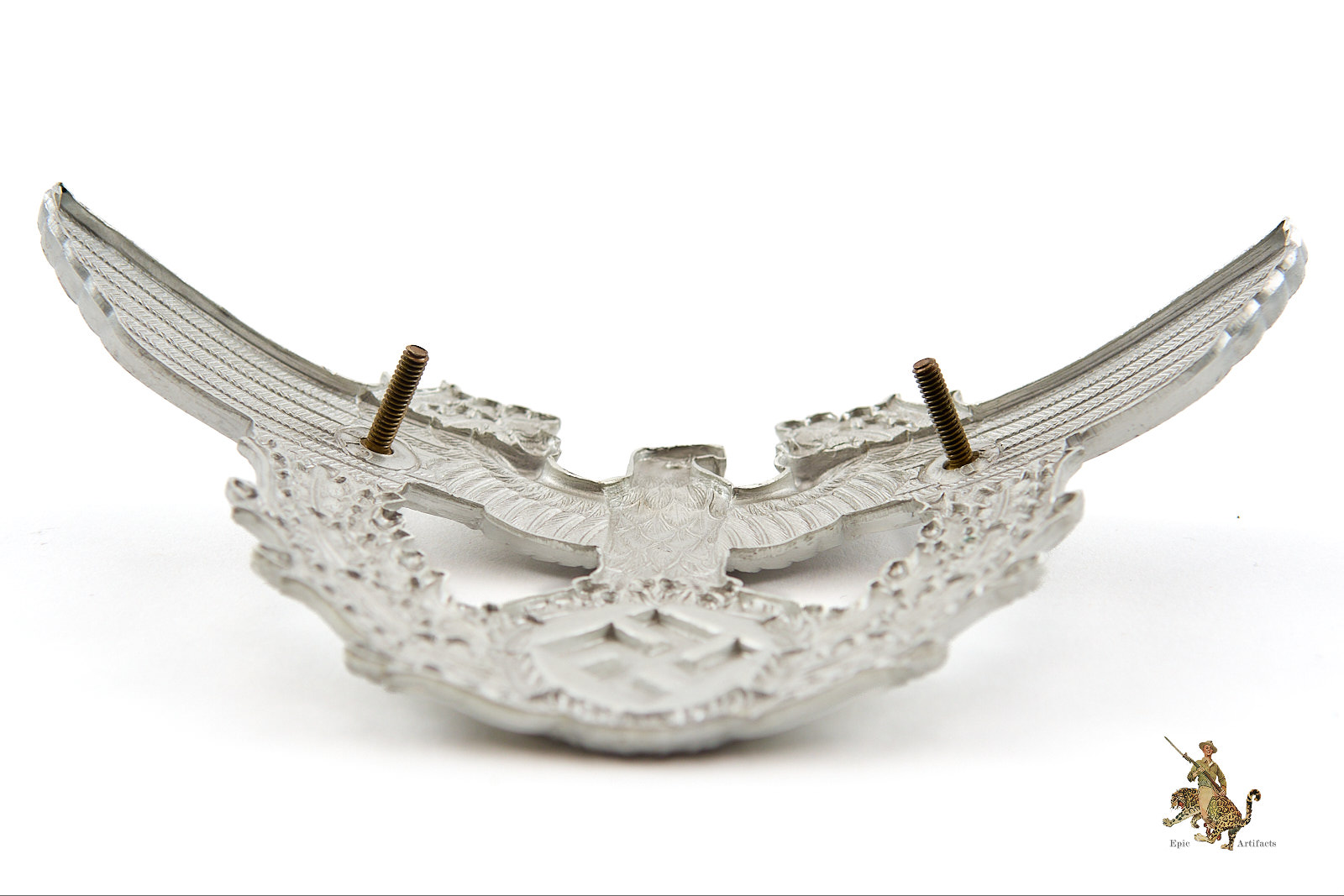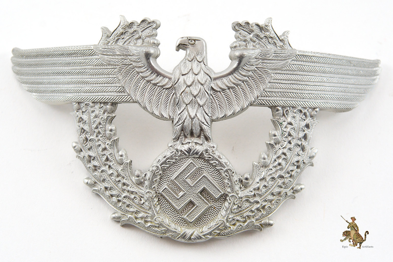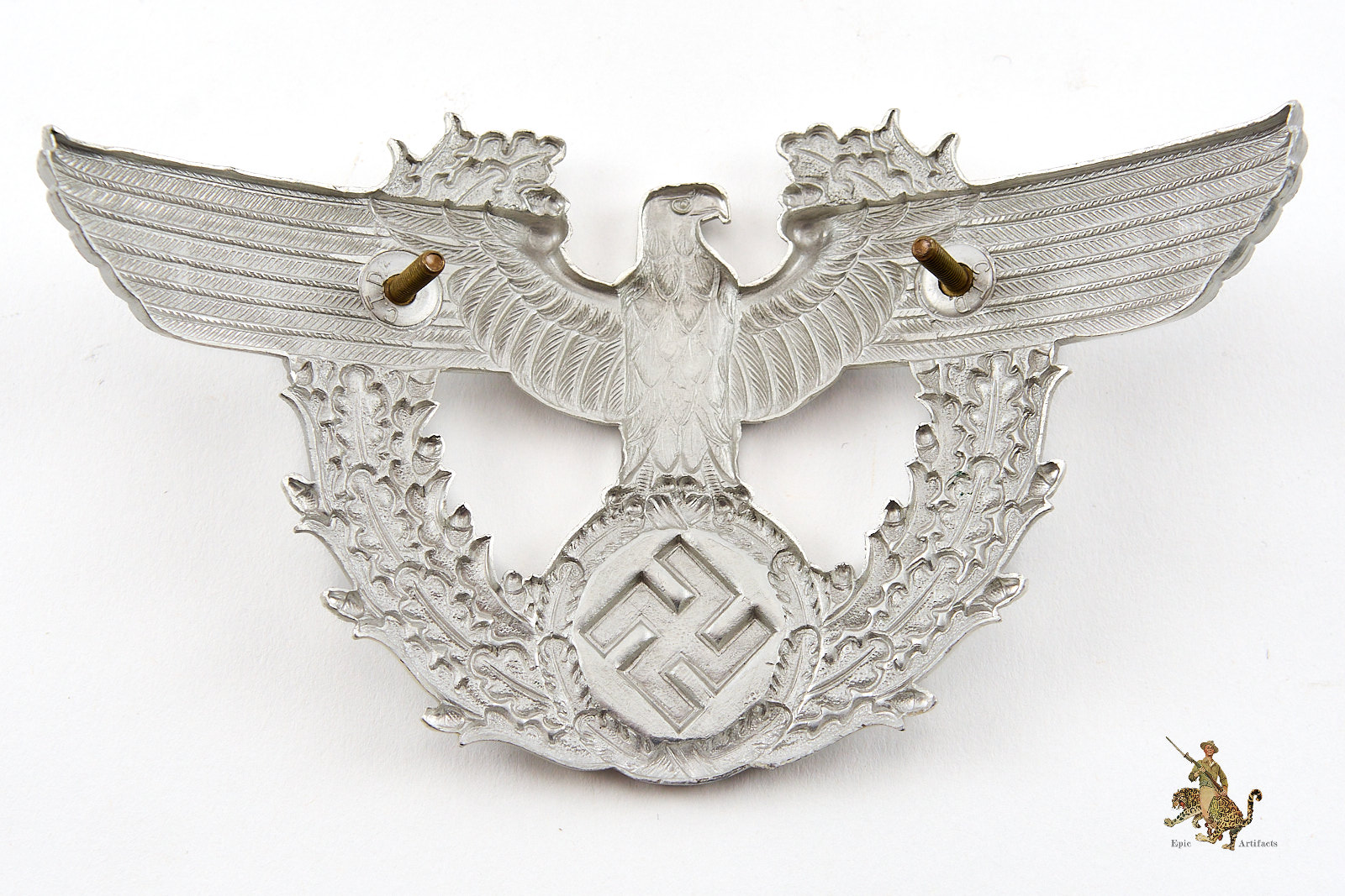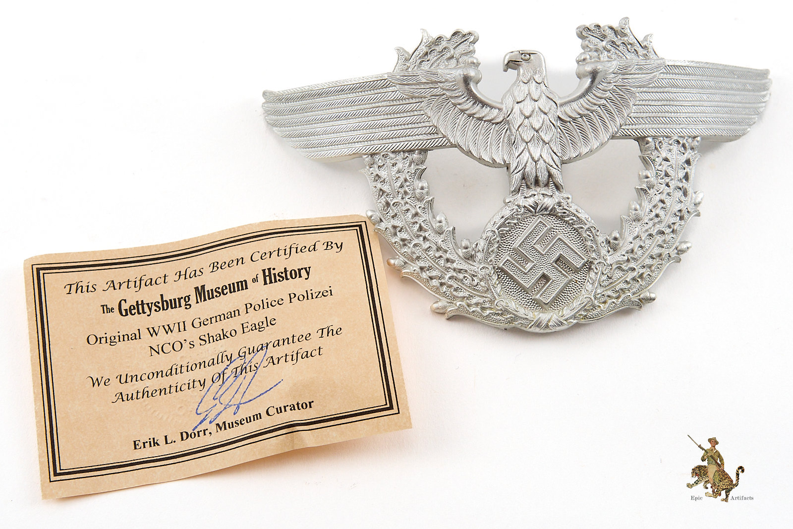 Product Description: This Police Shako Eagle Front Plate Marked C.T.D. is a large and very impressive piece of Polizei insignia. It’s made of aluminum, and features a large Polizei eagle and swastika emblem, with outstretched wings, within a very detailed wreath of oak leaves. This is a fantastic strike, loaded with detail, from the pebbling on the wreath to the feathers of the eagle. There is some extremely minor wear to the very highest points of the design, but on the whole, this remains in original condition. The reverse of this Police Shako Eagle is maker marked “C.T.D.” indicating manufacture by the firm of Christian Theodor Dicke. The original screw posts for affixing this plate to the front of a Shako are intact. This Police Shako Eagle is very clean and loaded with visual appeal. It would be prefect for completing a well-preserved Shako but it displays very well on its own and comes with original Gettysburg Museum of History certificate.