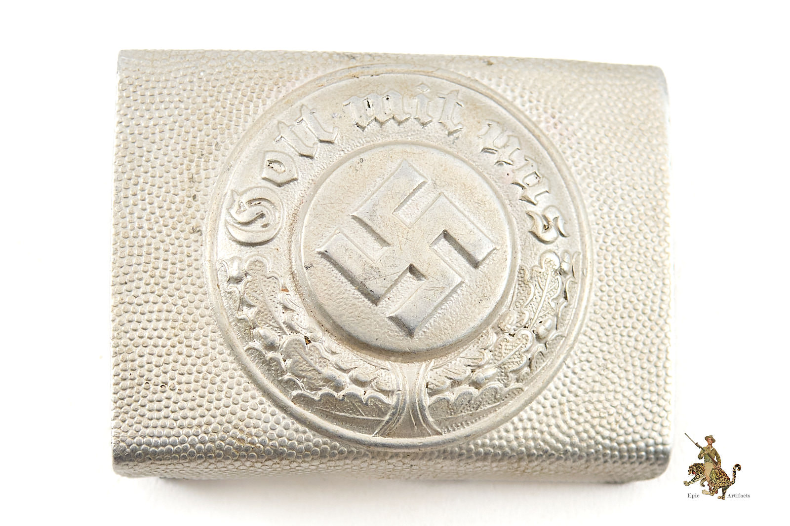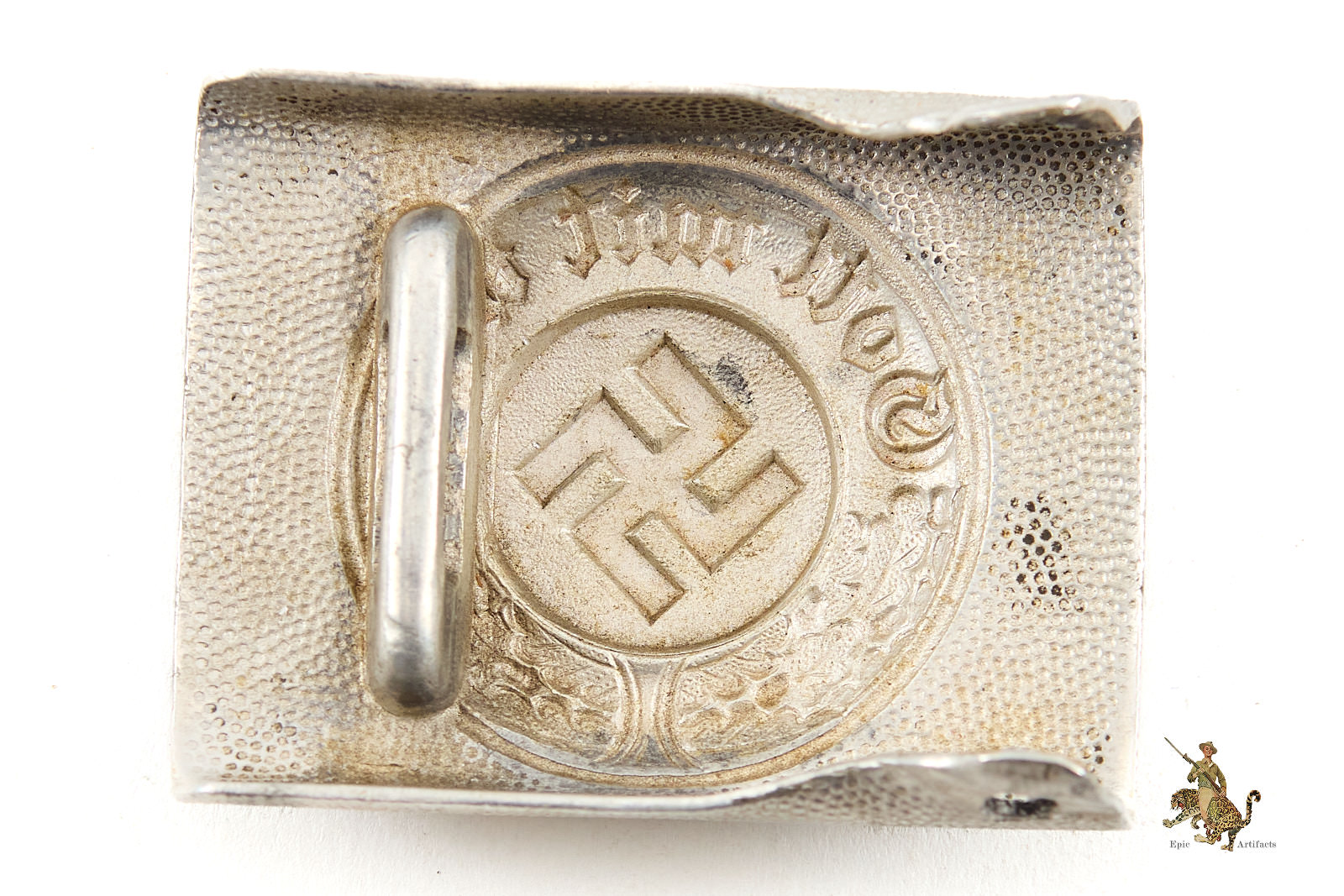 Historical Description: The belt buckle was an important part of the regalia worn by all uniformed military, civil, political and paramilitary organizations during the Third Reich. The belt (“Koppel”) was part of the uniform and would always be worn while on duty. The belt buckle (“Koppelschloss”) was generally specific to each organization, with many organizations having separate belt buckles for officers and for enlisted personnel, sometimes with different colors and finishes to further denote specific purposes. The buckles were adorned with various mottos and designs specific to the organizations for which they were intended. Many designs used the German national eagle emblem, in a variety of forms. Belt buckles were worn with uniforms ranging from finely tailored officer parade uniforms, to the issue uniforms of enlisted soldiers in combat. Generally speaking, most German belt buckles of the Third Reich were made with two prongs on the reverse, to allow the buckle to be worn and adjusted on a belt. The buckle had a catch that would mate with a hook on the belt, when worn. The earliest Third Reich buckles were often made of brass, or nickel silver. Later, aluminum became very common, and was used on private purchase as well as enlisted buckles of the German military, with or without a painted or plated finish. After WWII began, most enlisted military buckles were steel. Nazi belt buckles were popular souvenirs for Allied troops who served in Europe. Some types were made by the millions and remain quite common today. Others were made in limited numbers and are very rare.