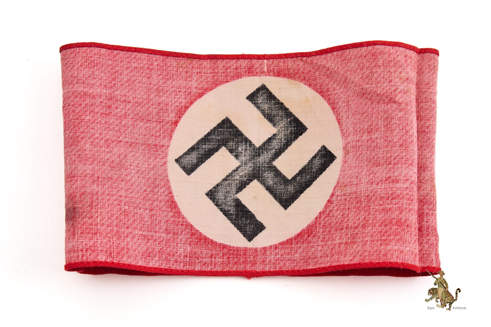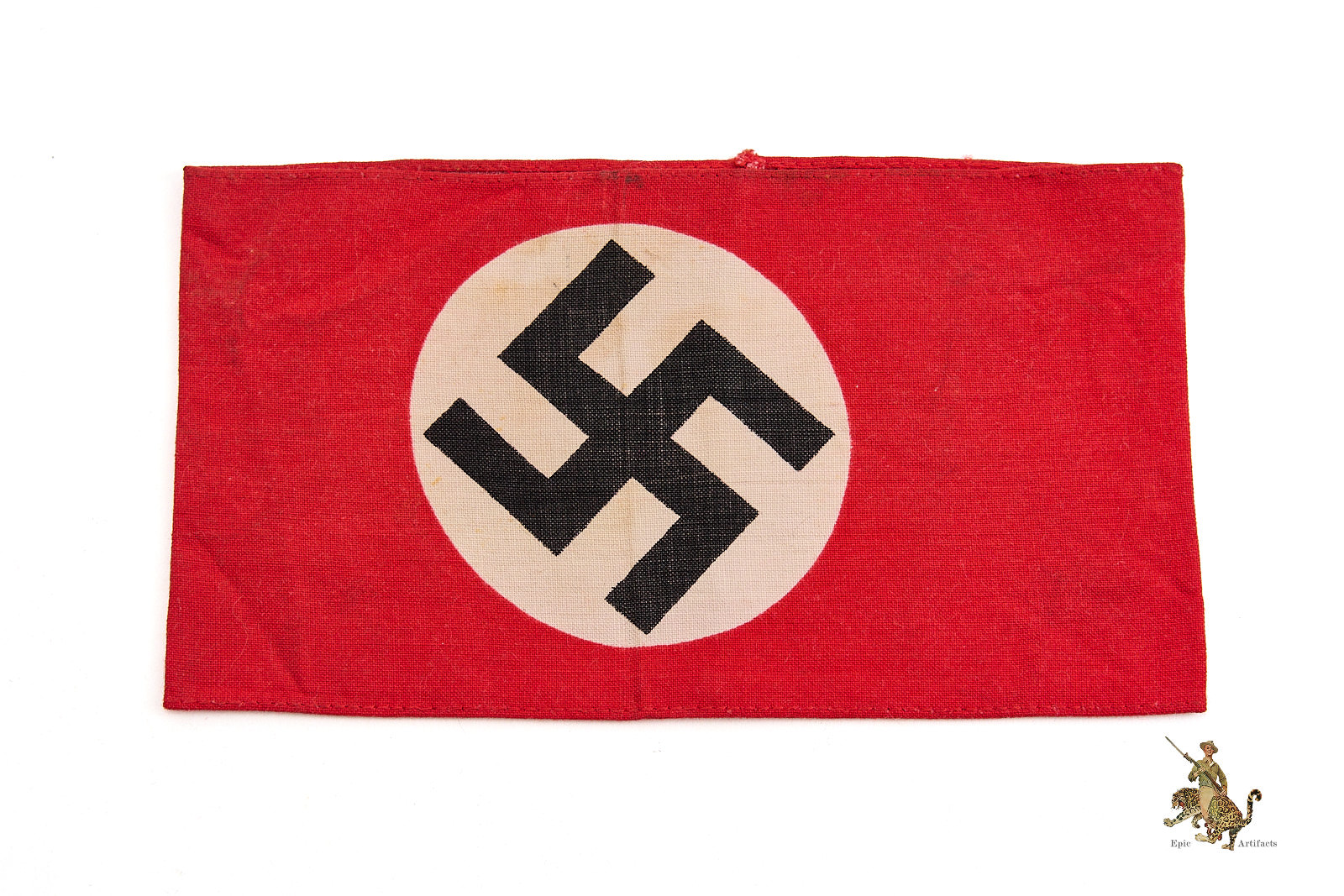 Product Description: This is a very attractive example of a classic NSDAP Printed Armband, a ubiquitous emblem of the Nazi Party worn both on uniforms and civilian attire by members of various affiliated organizations. Featuring the iconic design of a black swastika set within a white roundel on a vivid red field, this armband is the simple printed type, produced on a lightweight white cotton material. The construction is clean and precise, with white machine stitching along the upper and lower edges, and the ends neatly joined and folded at the reverse. The colors remain bold and vibrant, retaining their original visual impact. The armband no holes or tears and only faint spots of discoloration from wear. A desirable and well-preserved example, this armband remains in excellent + condition and would make a fine addition to any political insignia or WWII collection.